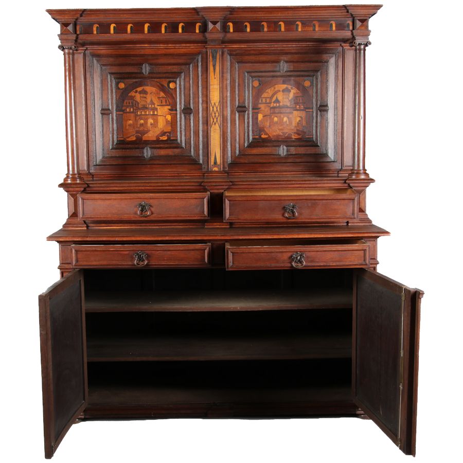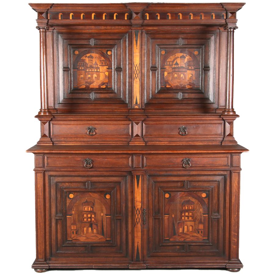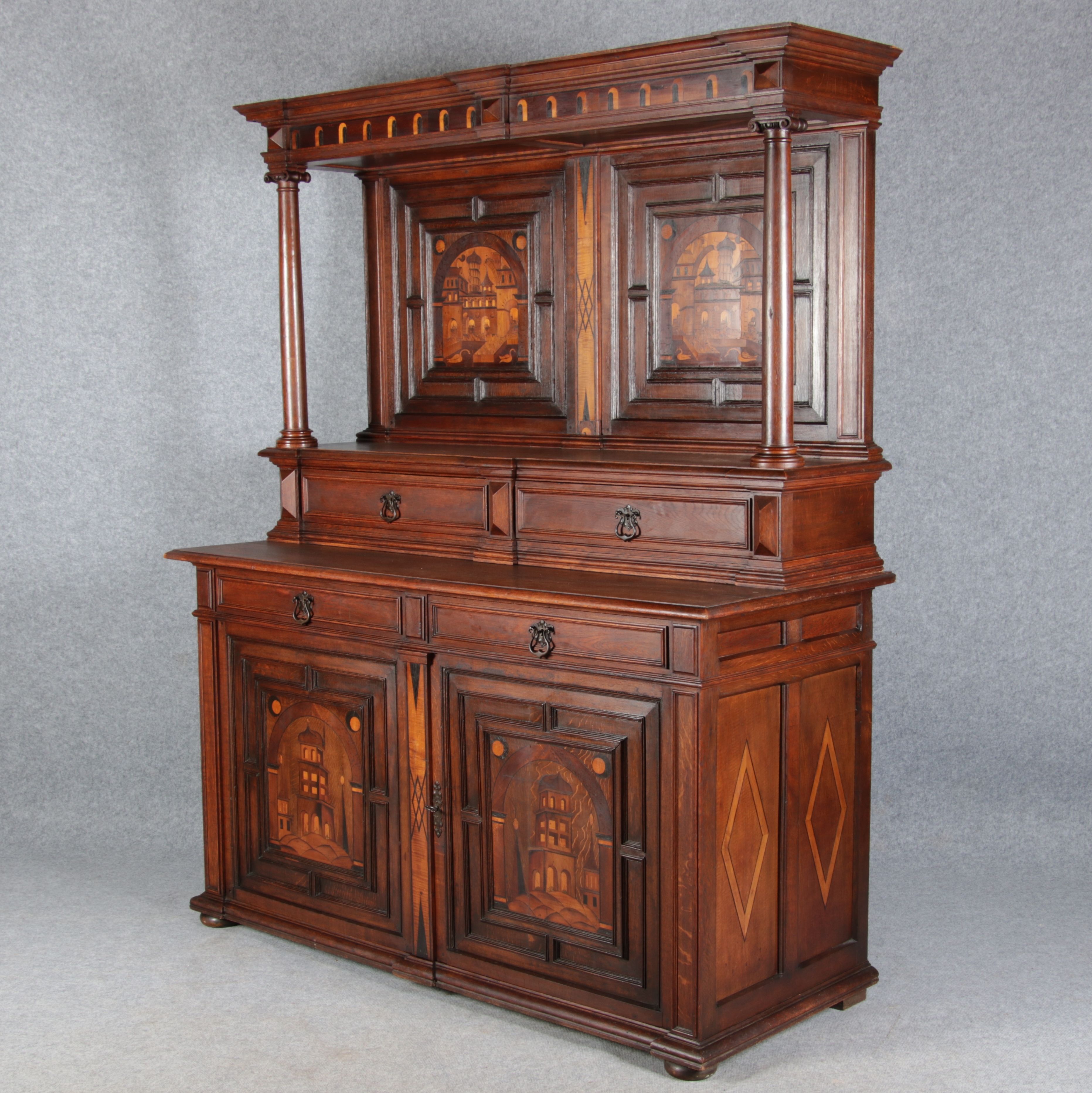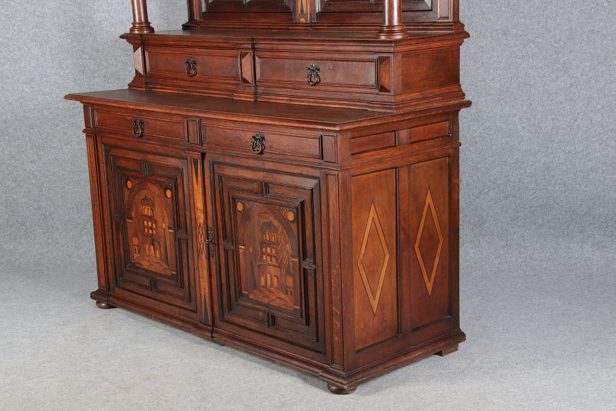 | Antike Historismus Kredenz Büffet mit Schnitzwerk und Architektur Intarsien um 1900 | ||||||||||||||||||||||||||||||||||||||||||||||||||||||||||||||||||