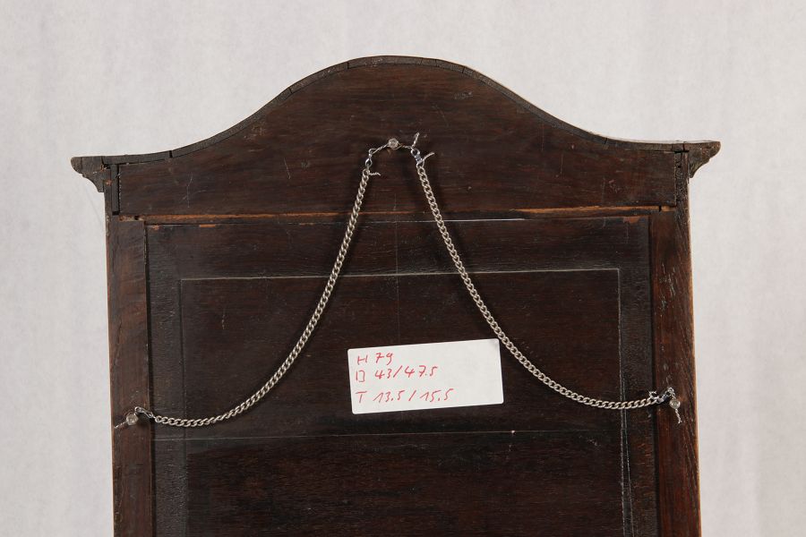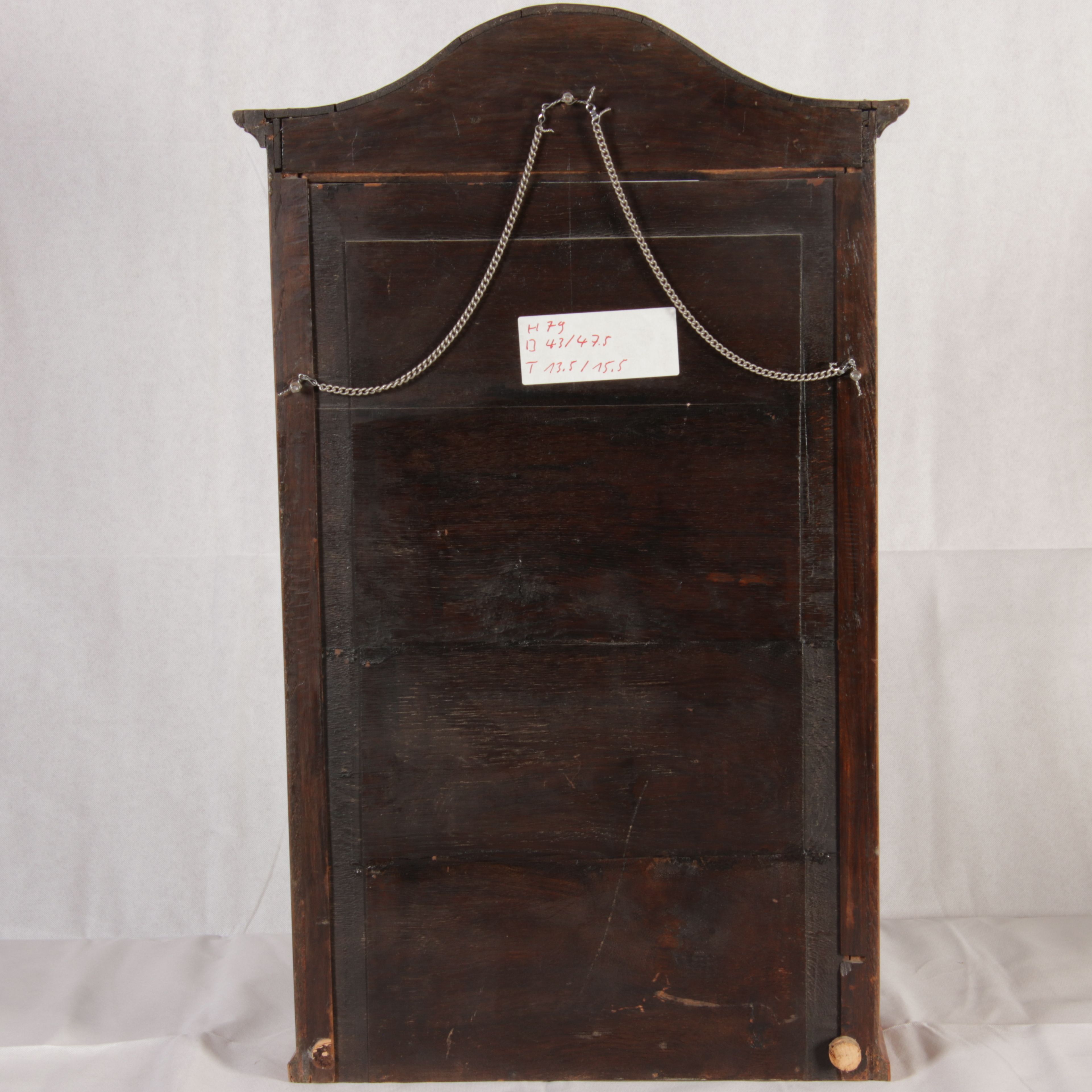 Masse/dimensions: Höhe/Height ca. 79 cm, Breite Korpus/Broad Boda ca. 43 cm, Breite Gesims/Broad cornice ca. 47,5 cm, Tiefe Korpus/Deep body ca. 13,5 cm, Tiefe Gesims/Deep cornice ca. 15,5 cm,