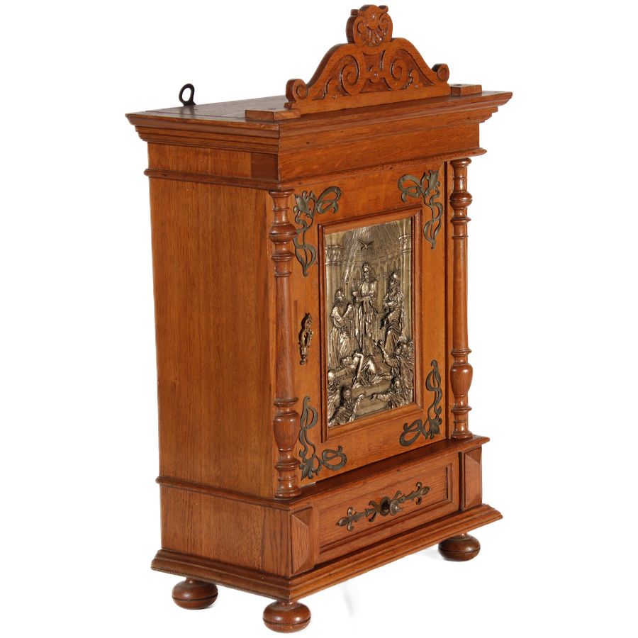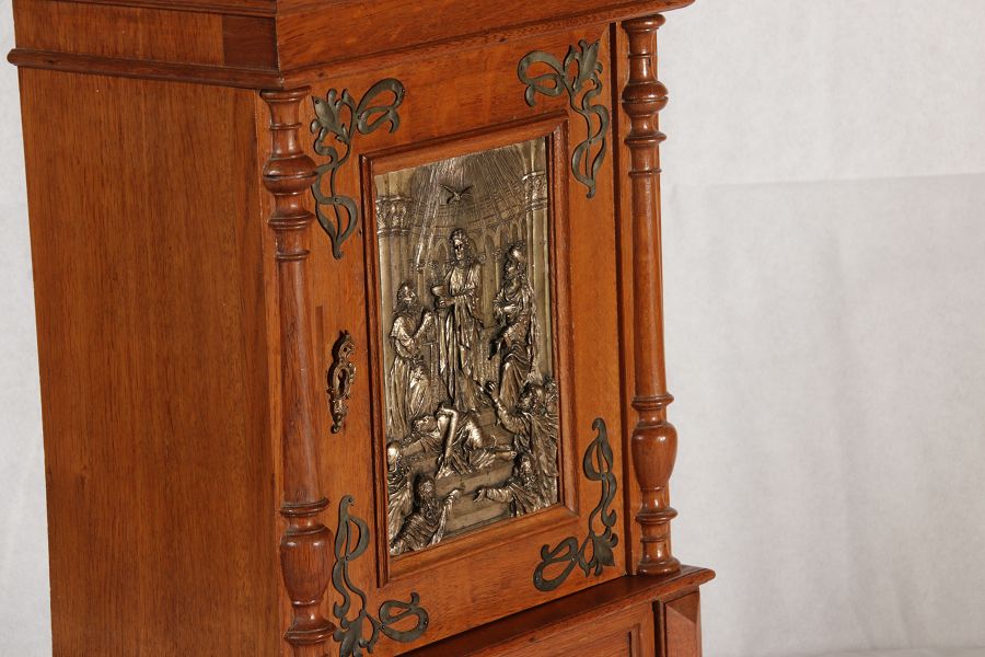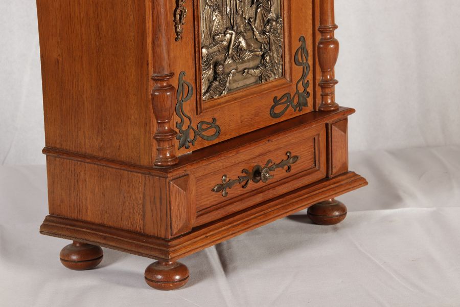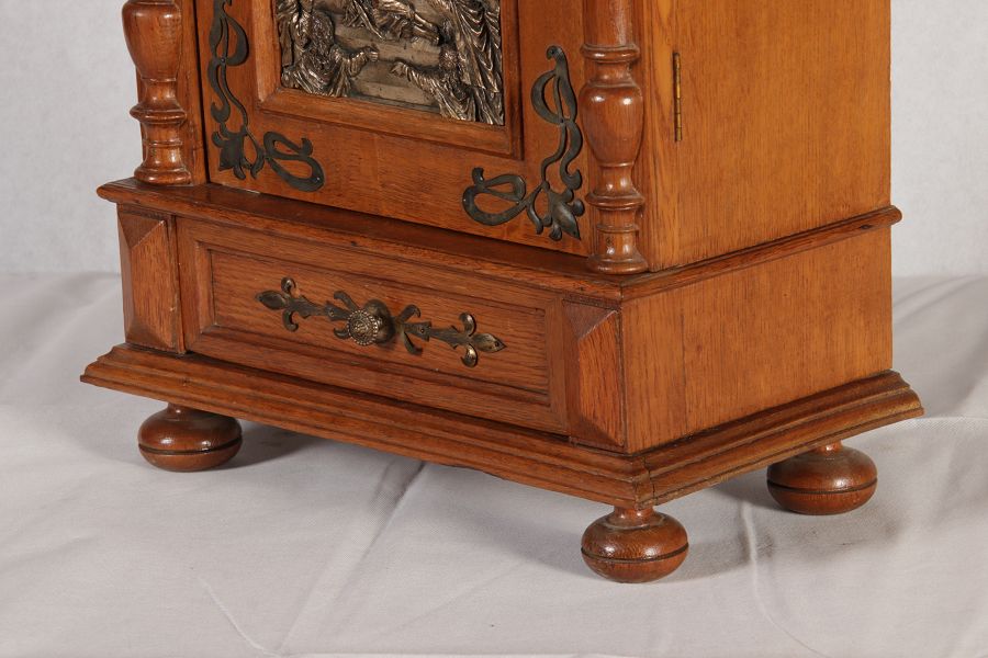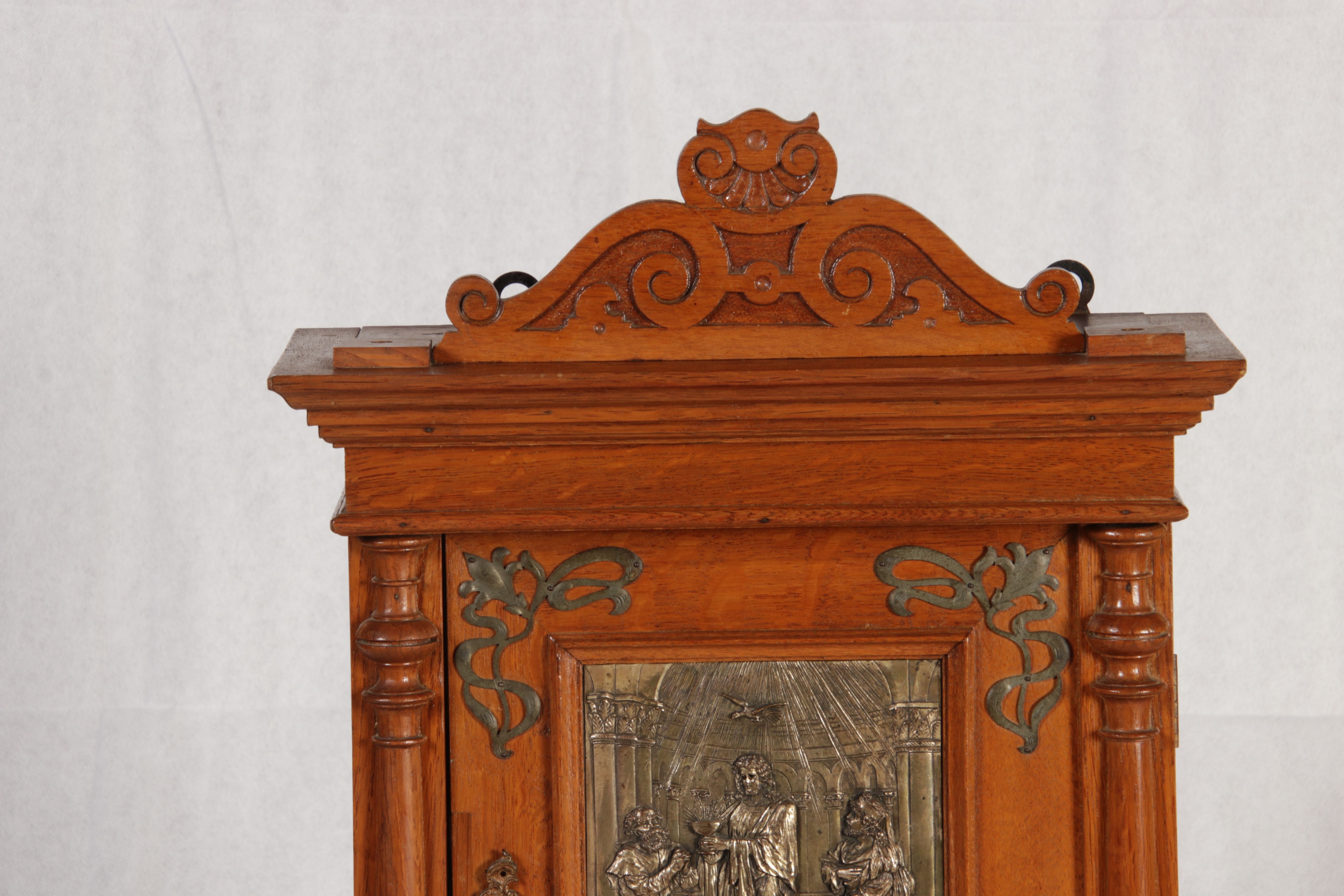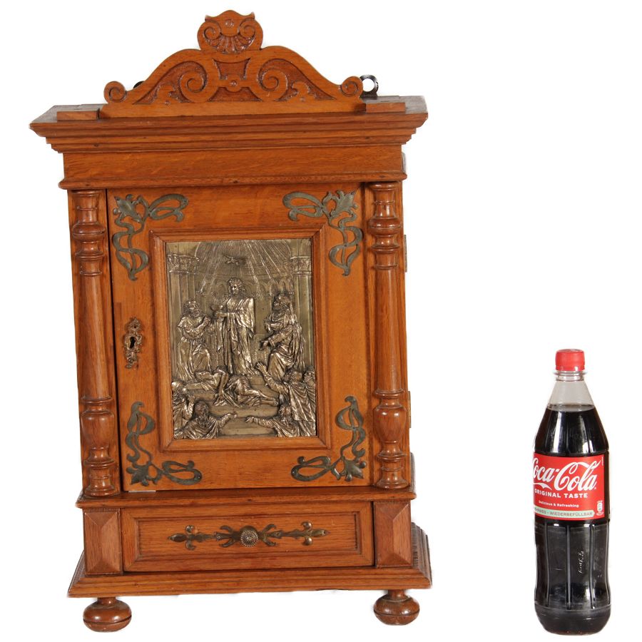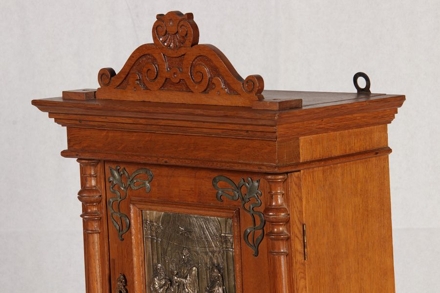 | Antikes Hängeschränkchen Wandkasten Jugendstiel Eiche Messing Relief um 1900 | ||