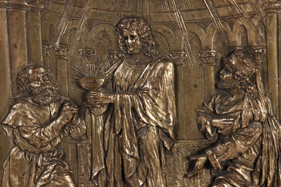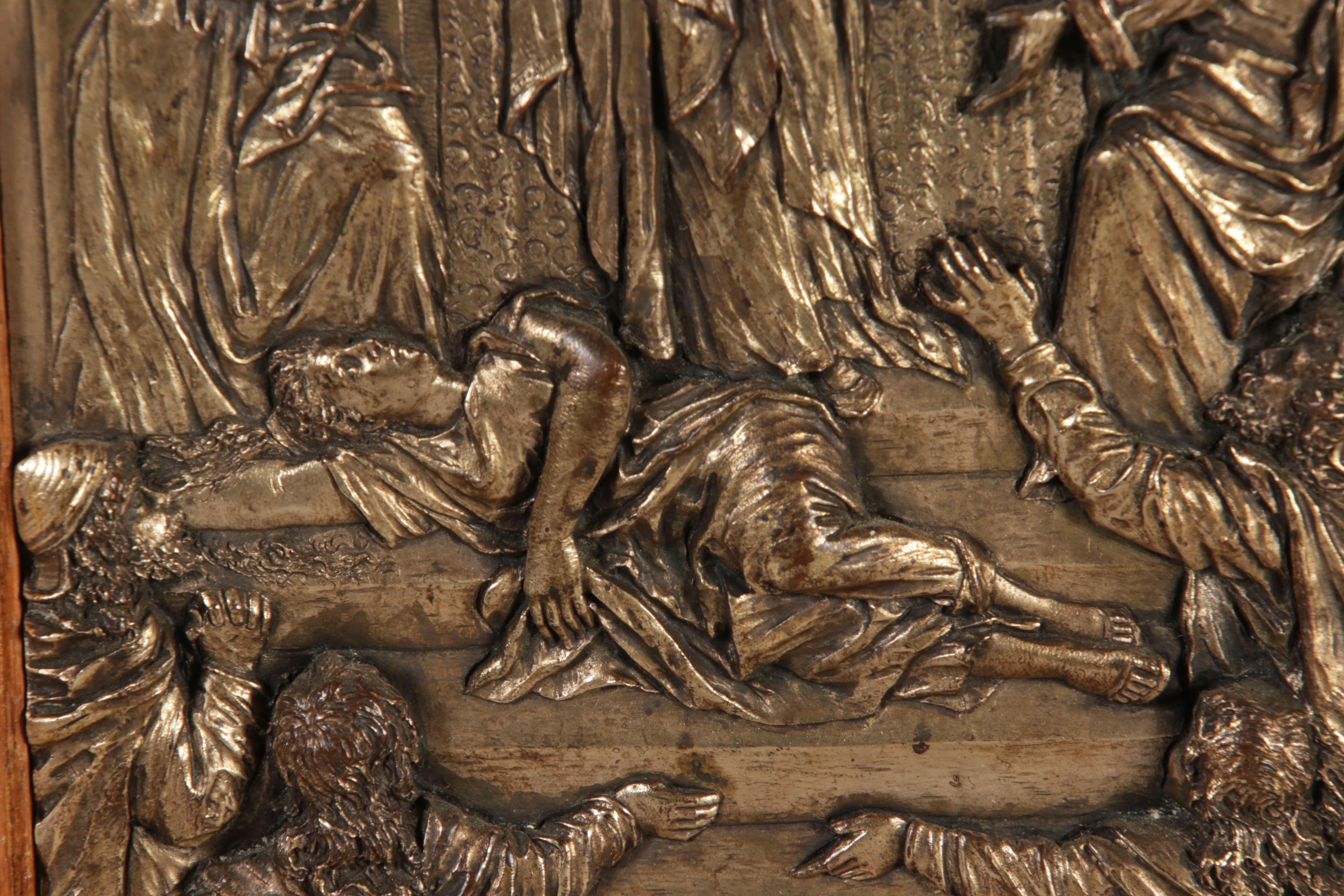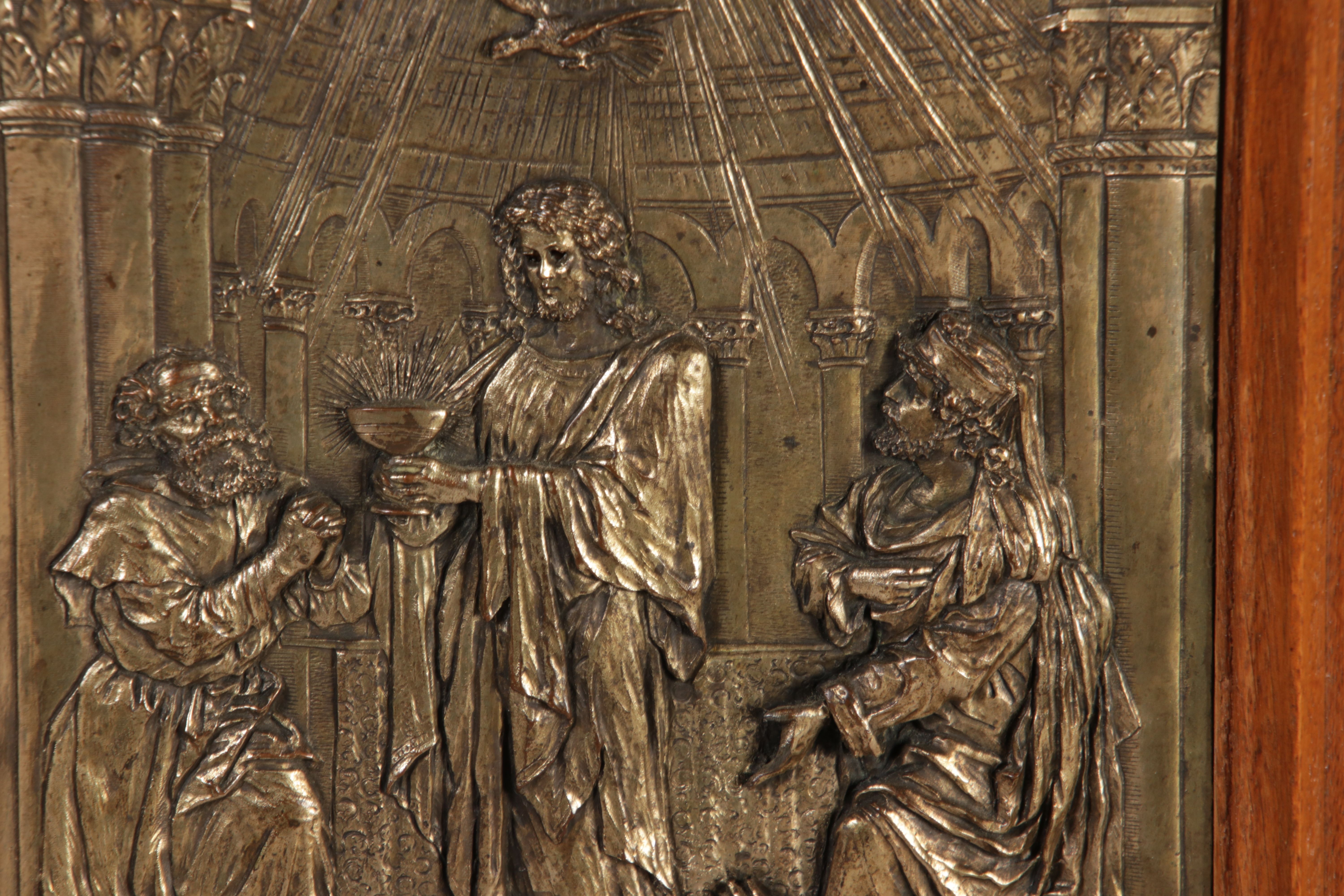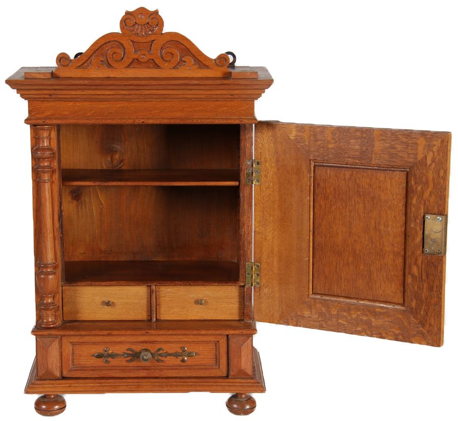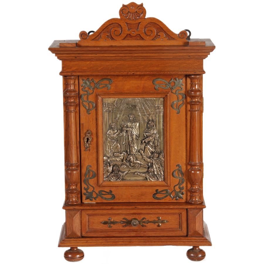 | Antikes Hängeschränkchen Wandkasten Jugendstiel Eiche Messing Relief um 1900 | ||