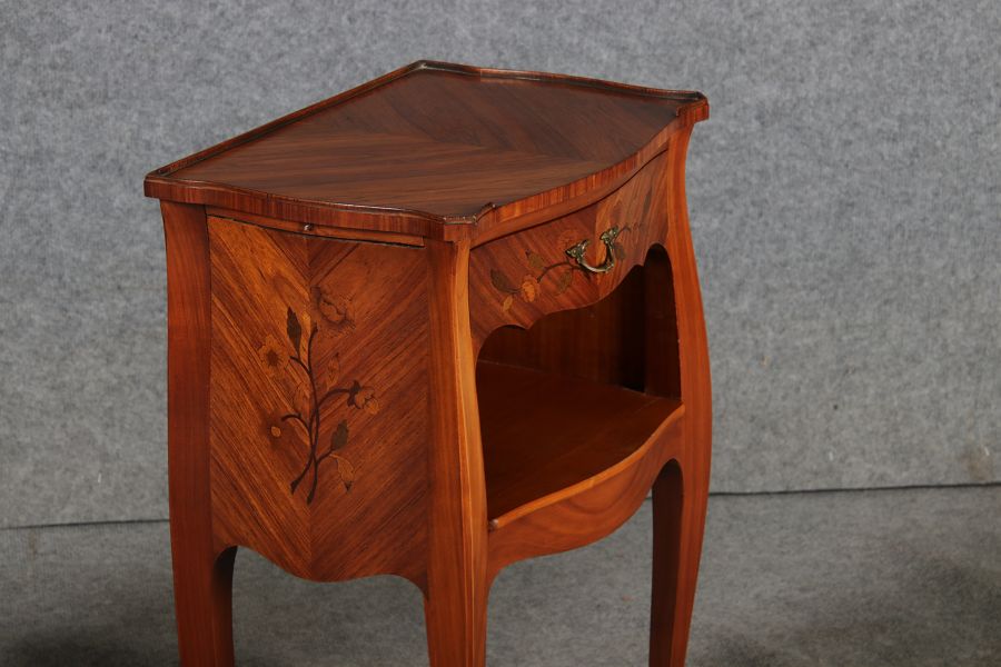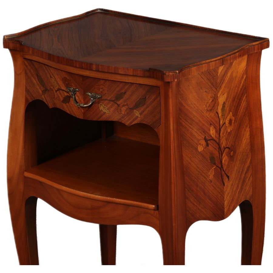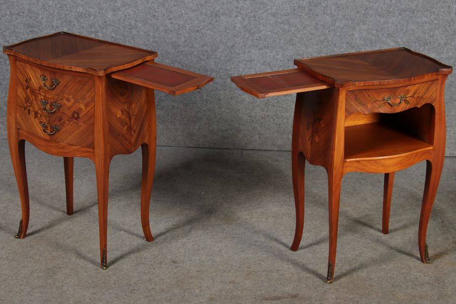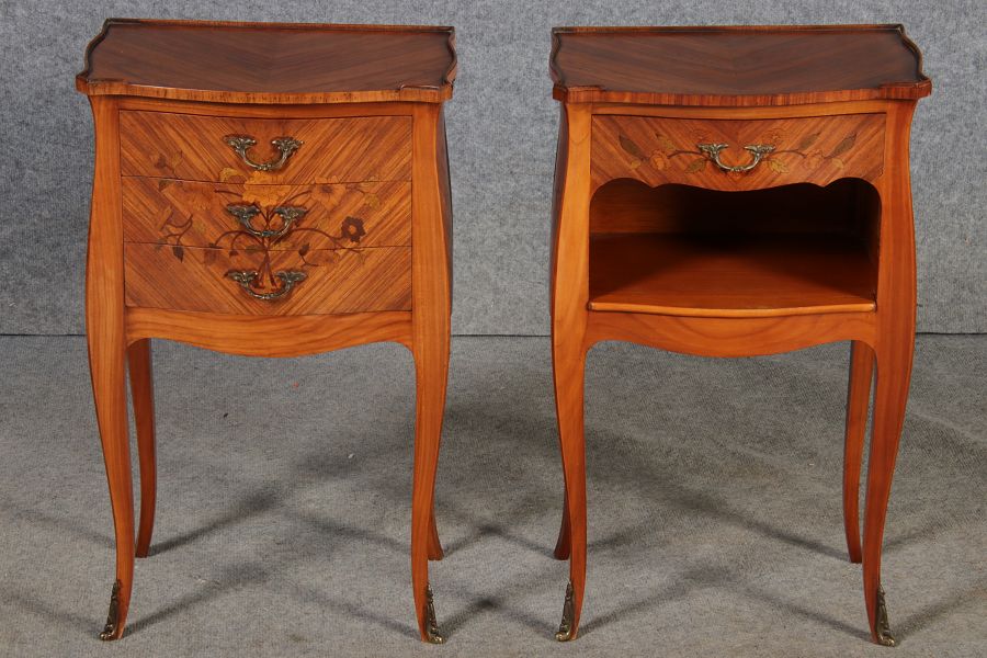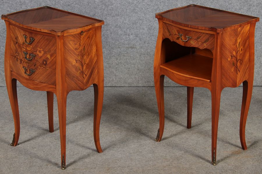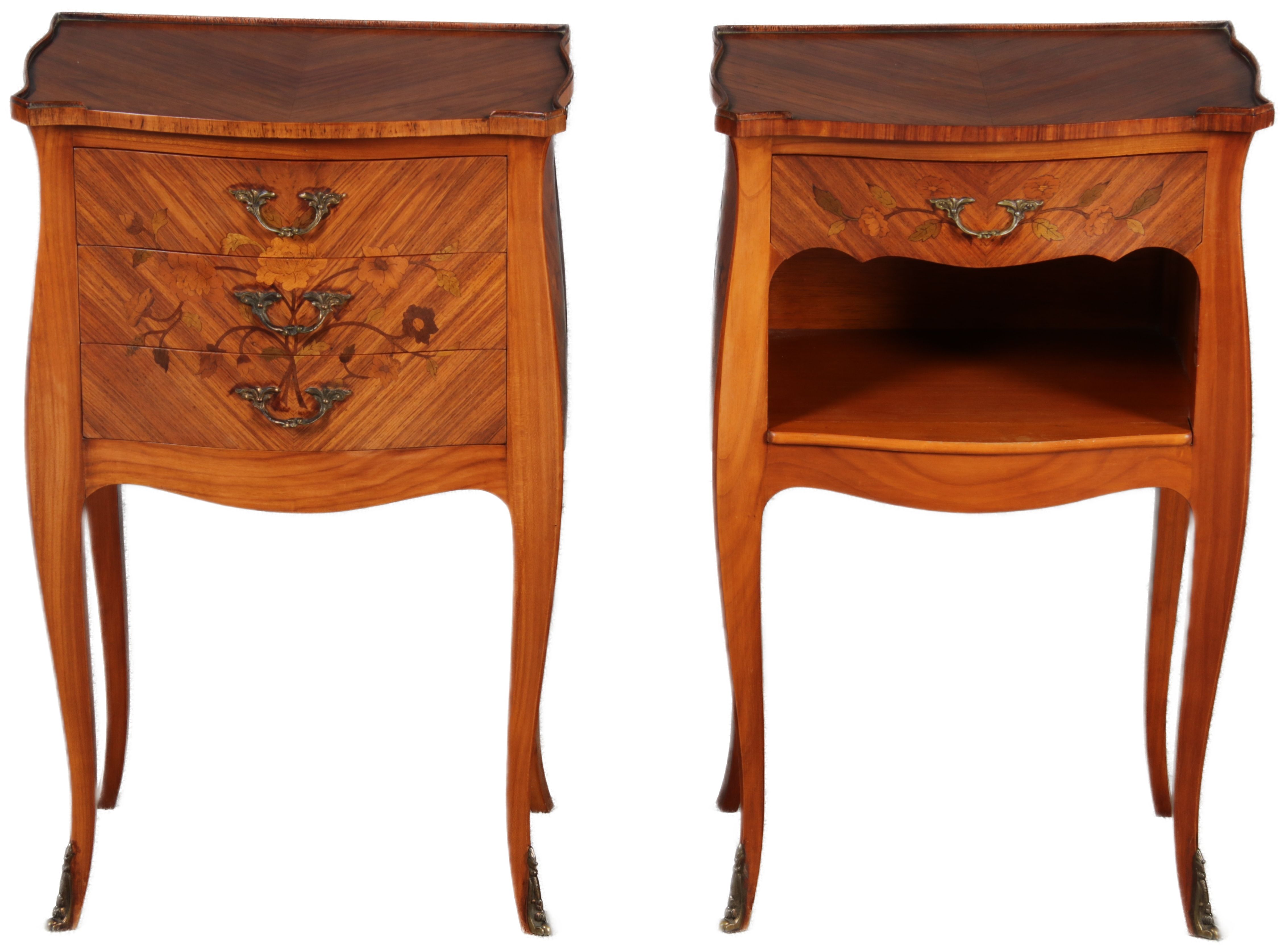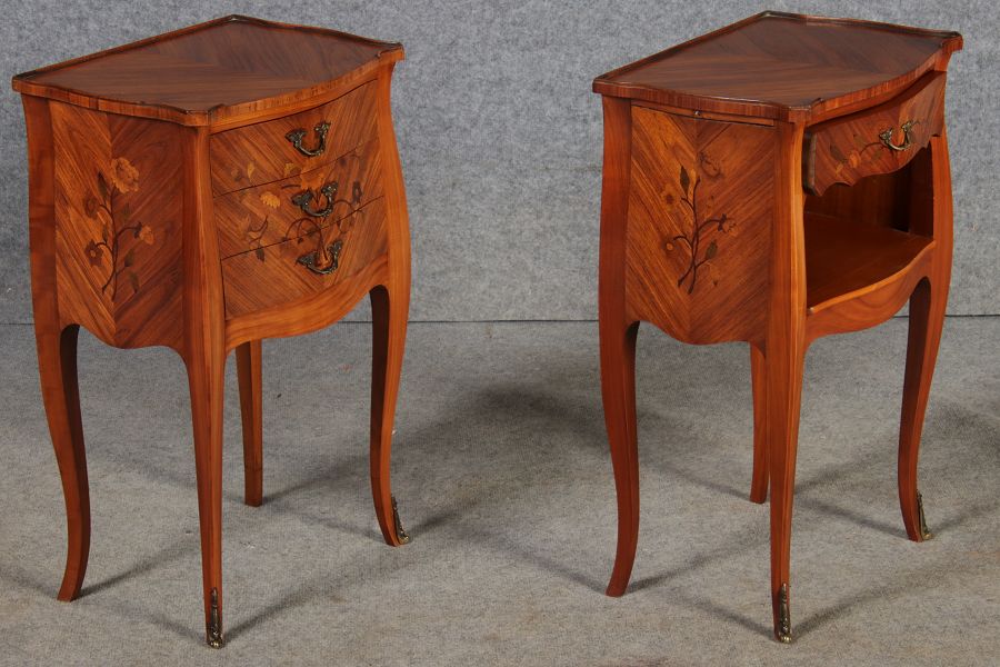 | zwei Antike Nachttische Blumen Intarsien Louis XV Stil | ||