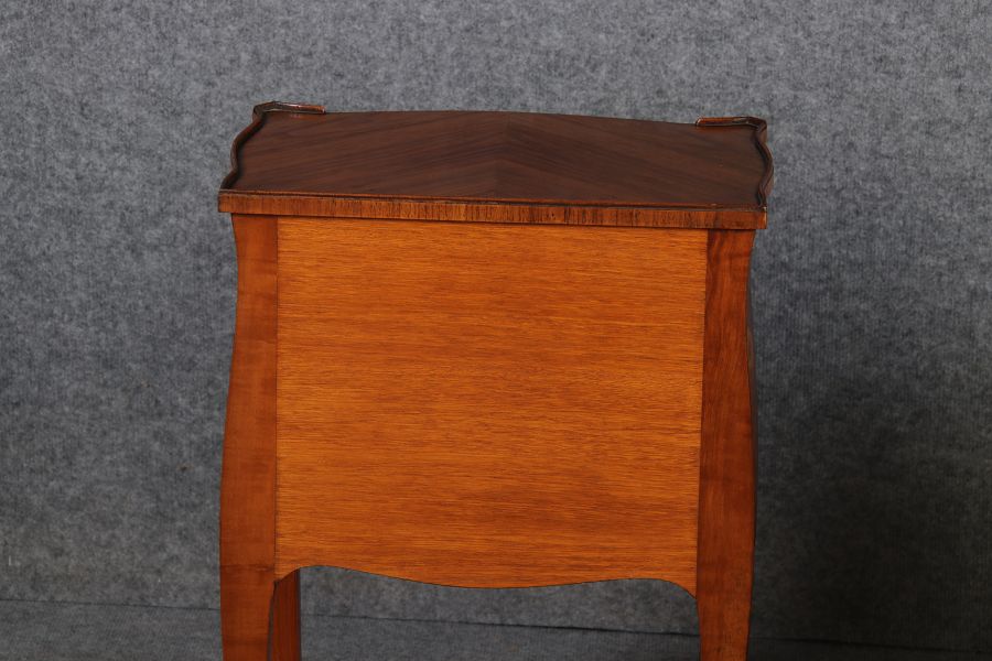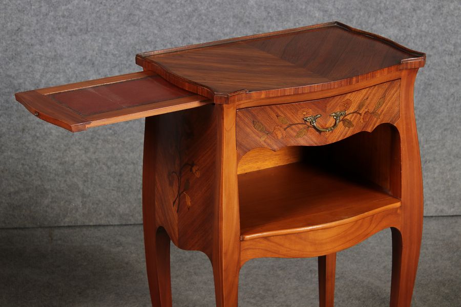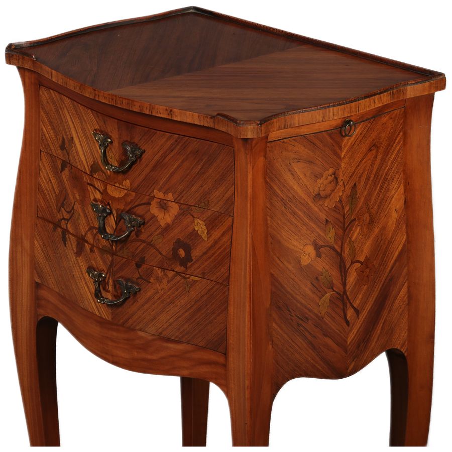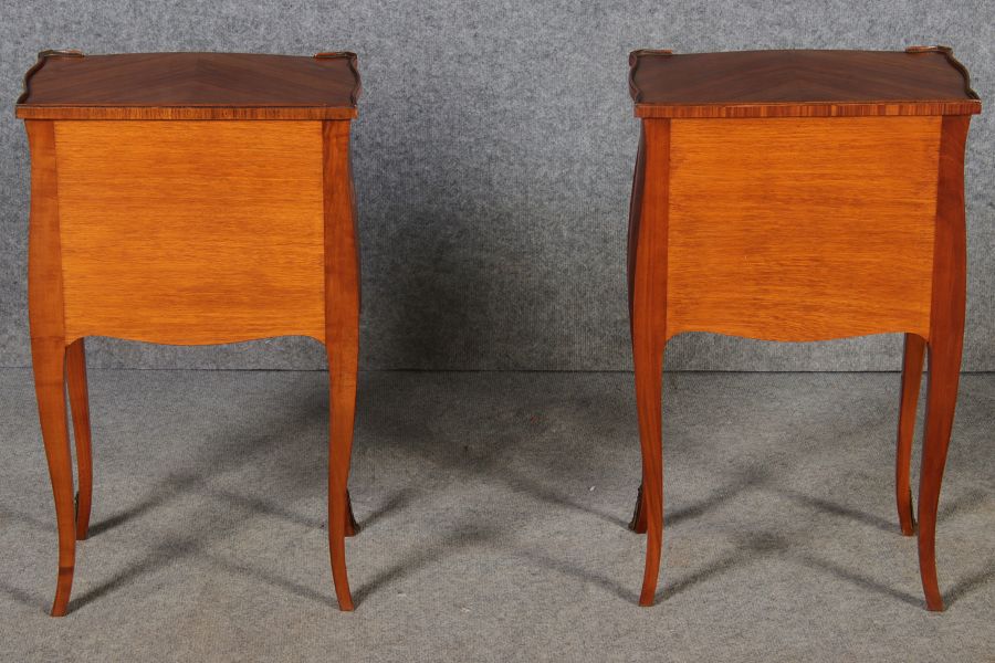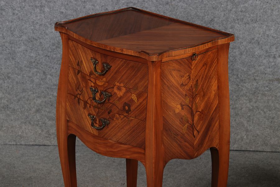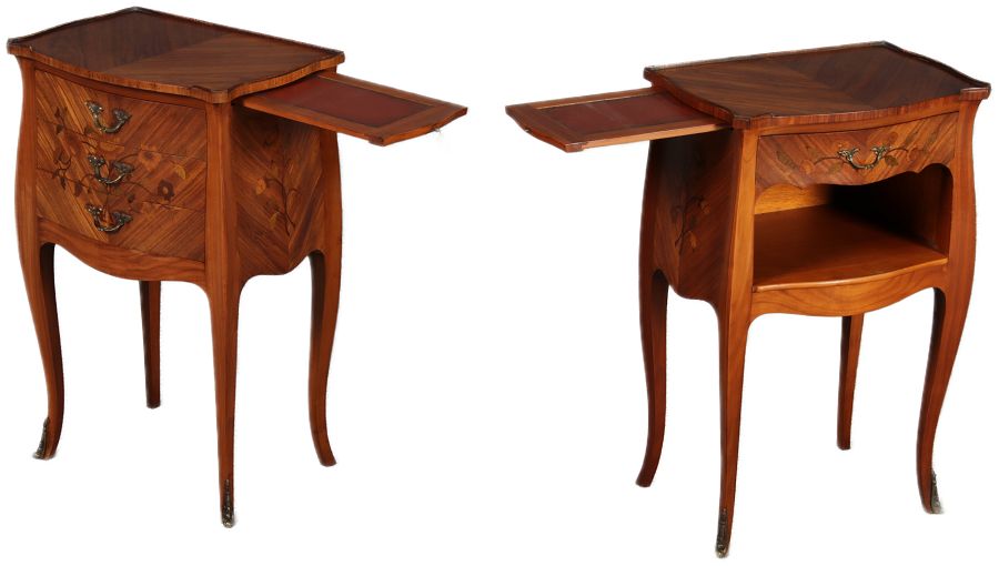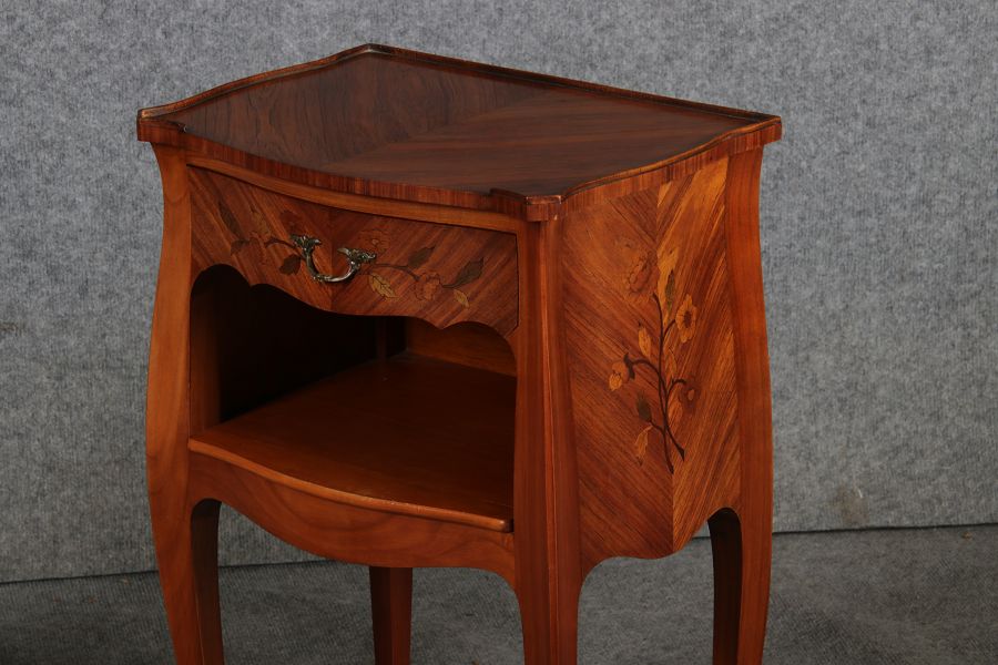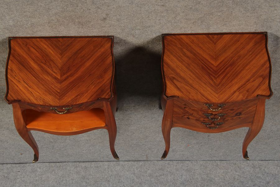 | zwei Antike Nachttische Blumen Intarsien Louis XV Stil | ||