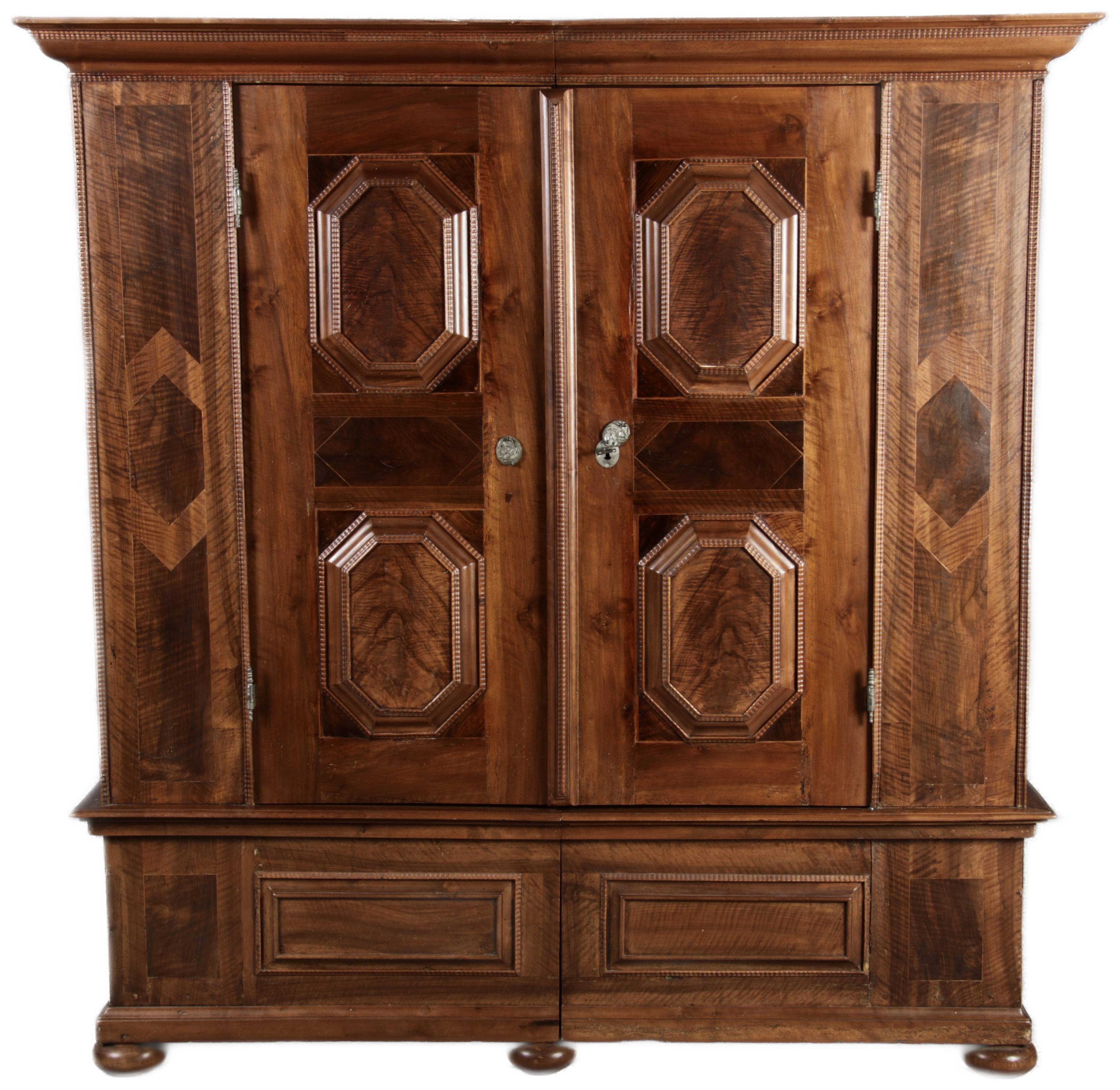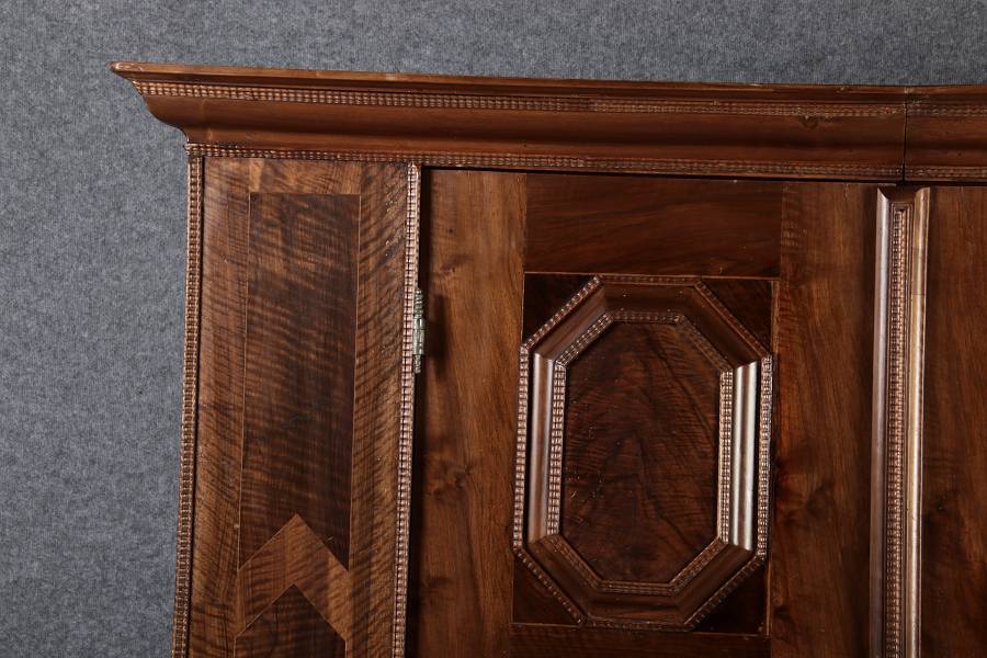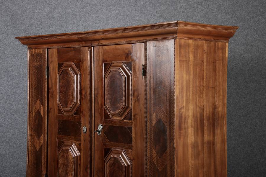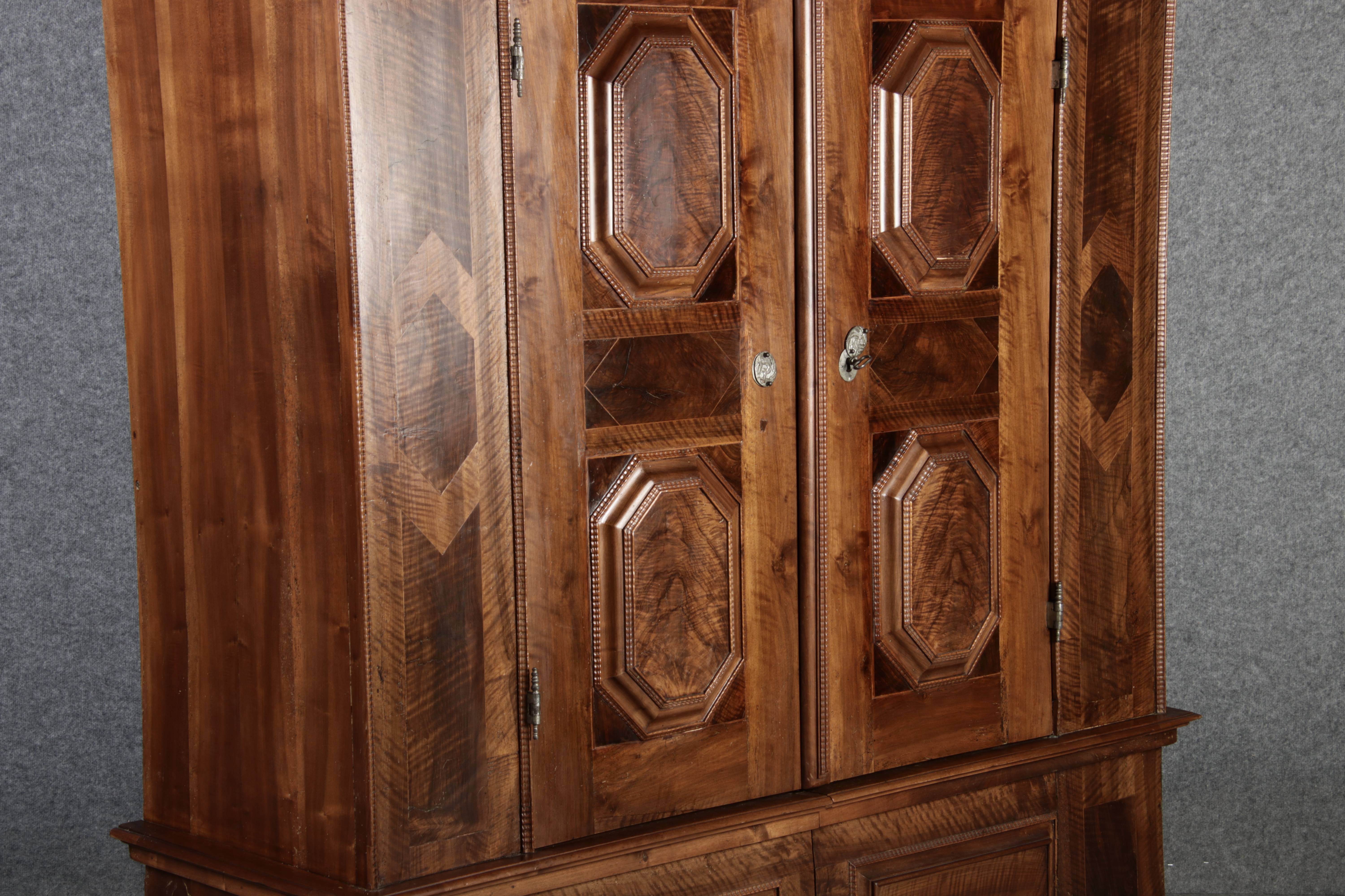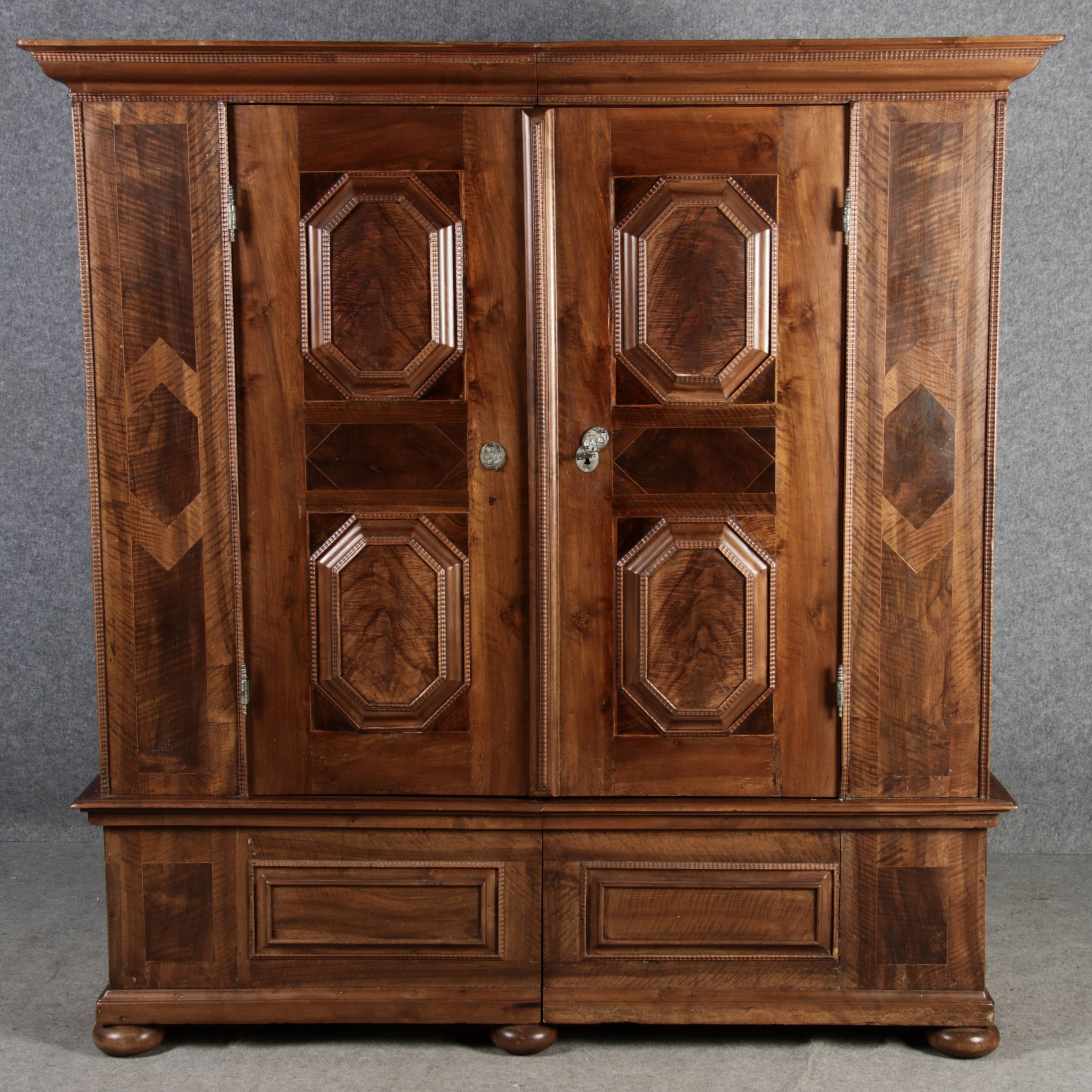 Antiker Renaissance Früh Barock Schrank um 1680 Nussbaum auf Weichholz mit Eisenschloss und Schlüssel In dem Buch Züricher und Nordschweizer Möbel findet sich auf Seite 113 ein ähnlicher Schrank. Laut Text, Herstellungsort Nordwestschweiz Zürich oder Winterthur und Datierung wurde um 1680-1690 angegeben. Die dendrochronologische Datierung ergab nach 1674.