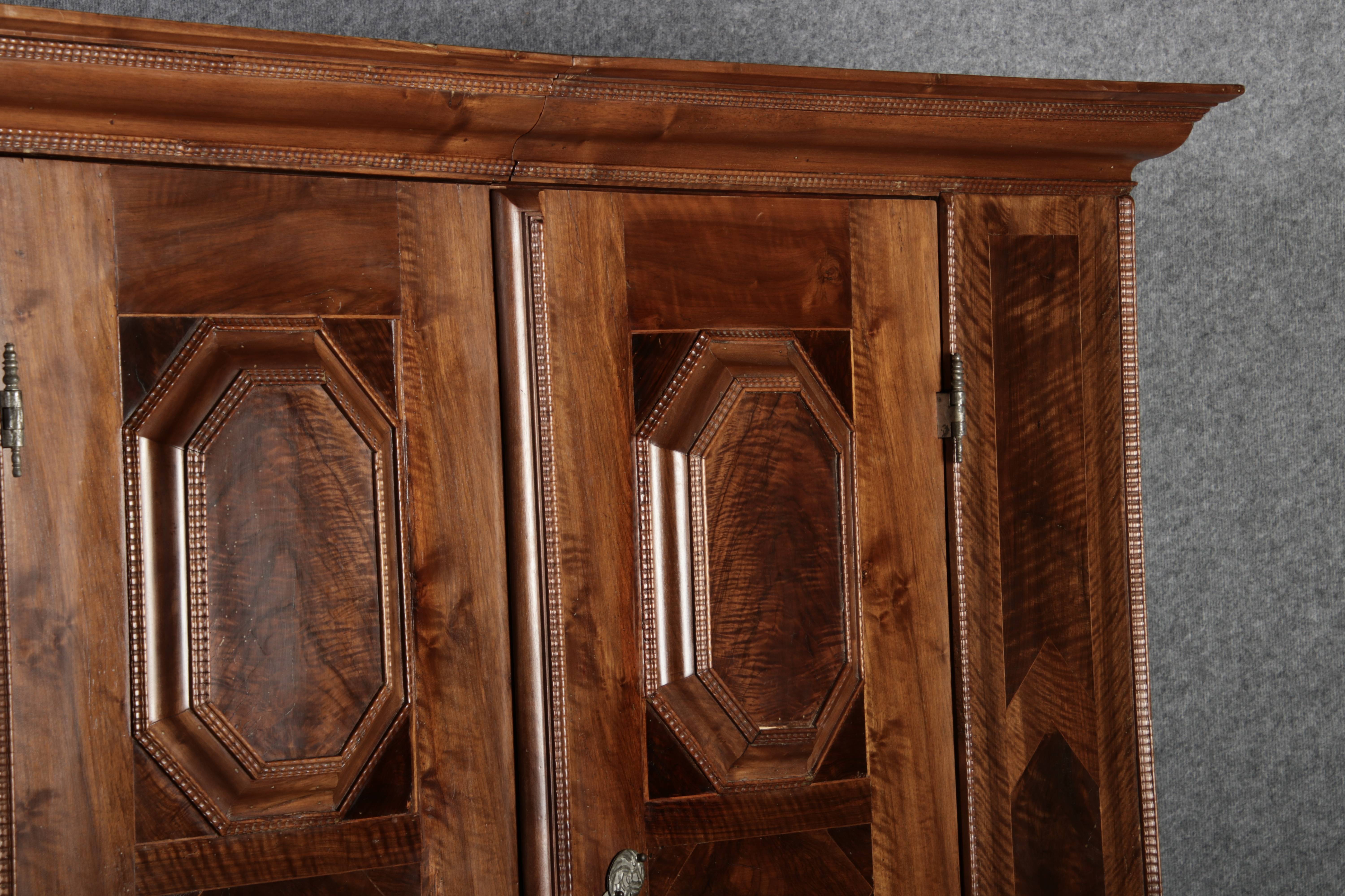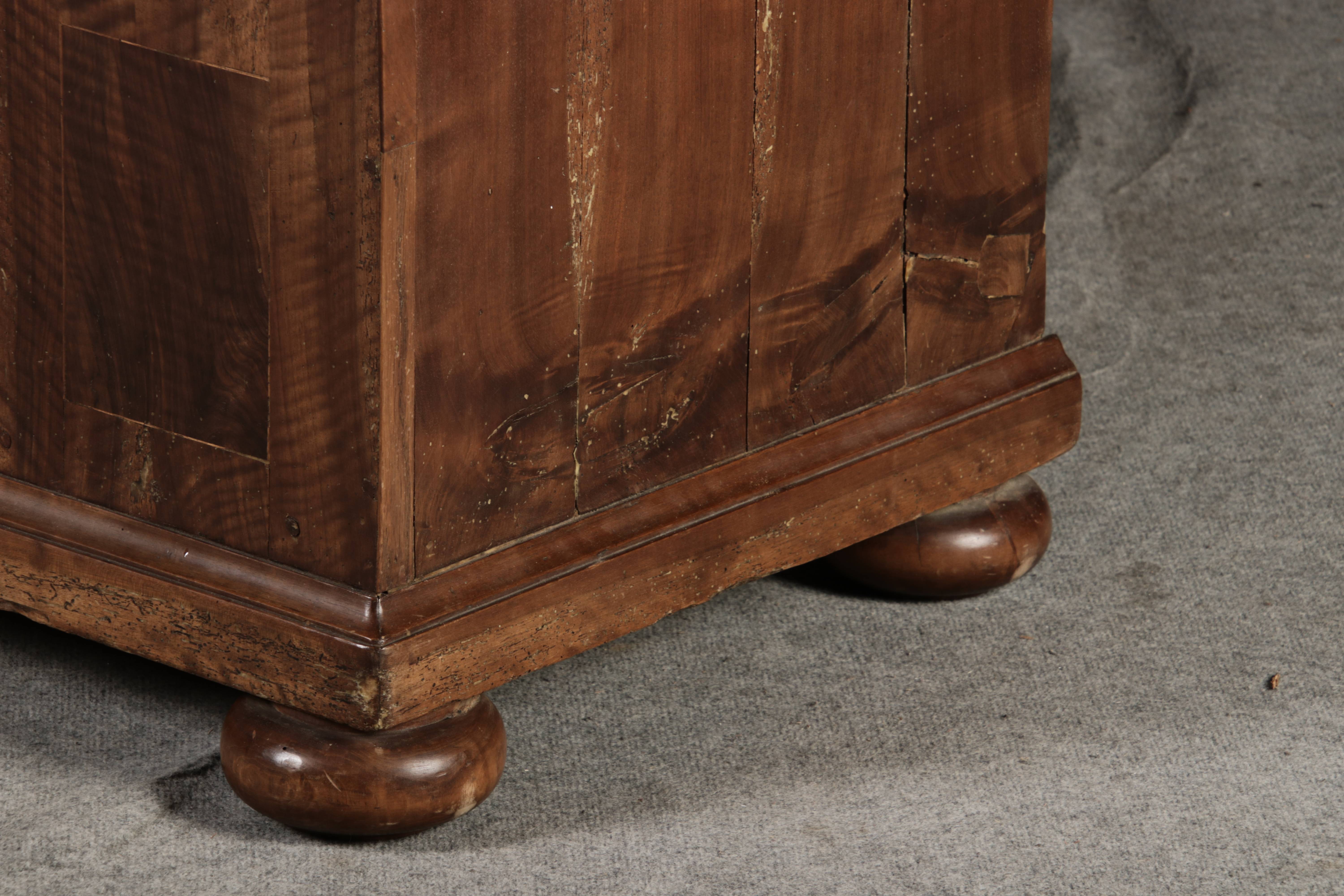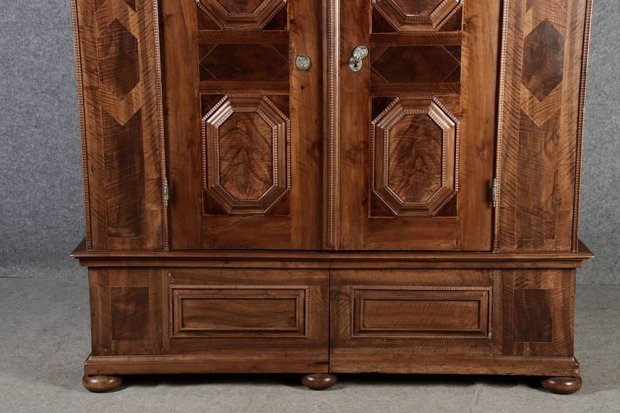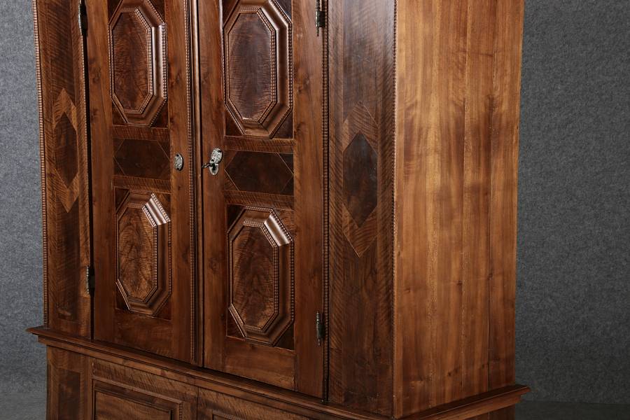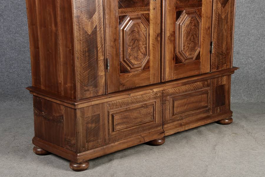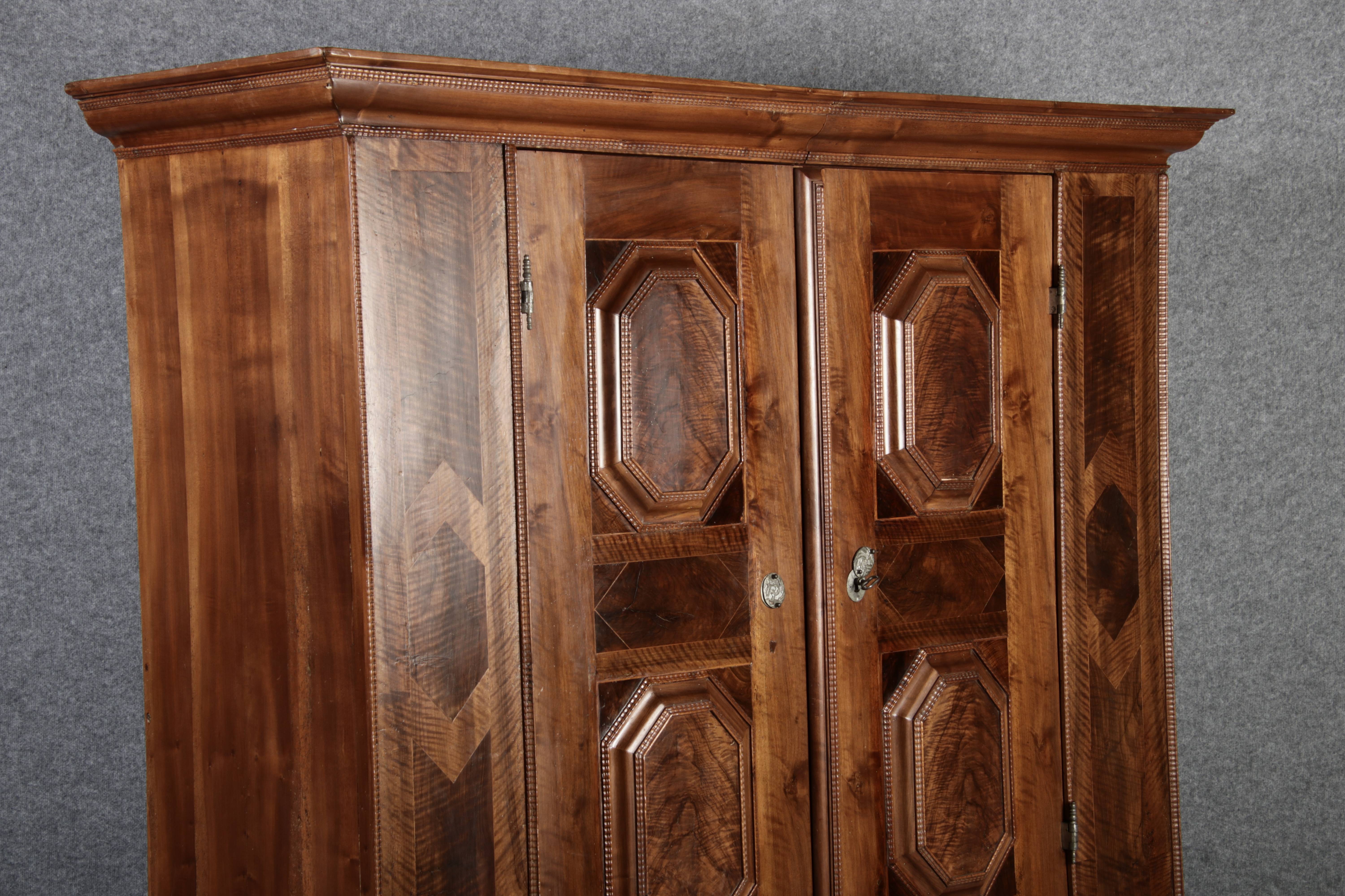 Antiker Renaissance Früh Barock Schrank um 1680 Nussbaum auf Weichholz mit Eisenschloss und Schlüssel In dem Buch Züricher und Nordschweizer Möbel findet sich auf Seite 113 ein ähnlicher Schrank. Laut Text, Herstellungsort Nordwestschweiz Zürich oder Winterthur und Datierung wurde um 1680-1690 angegeben. Die dendrochronologische Datierung ergab nach 1674.