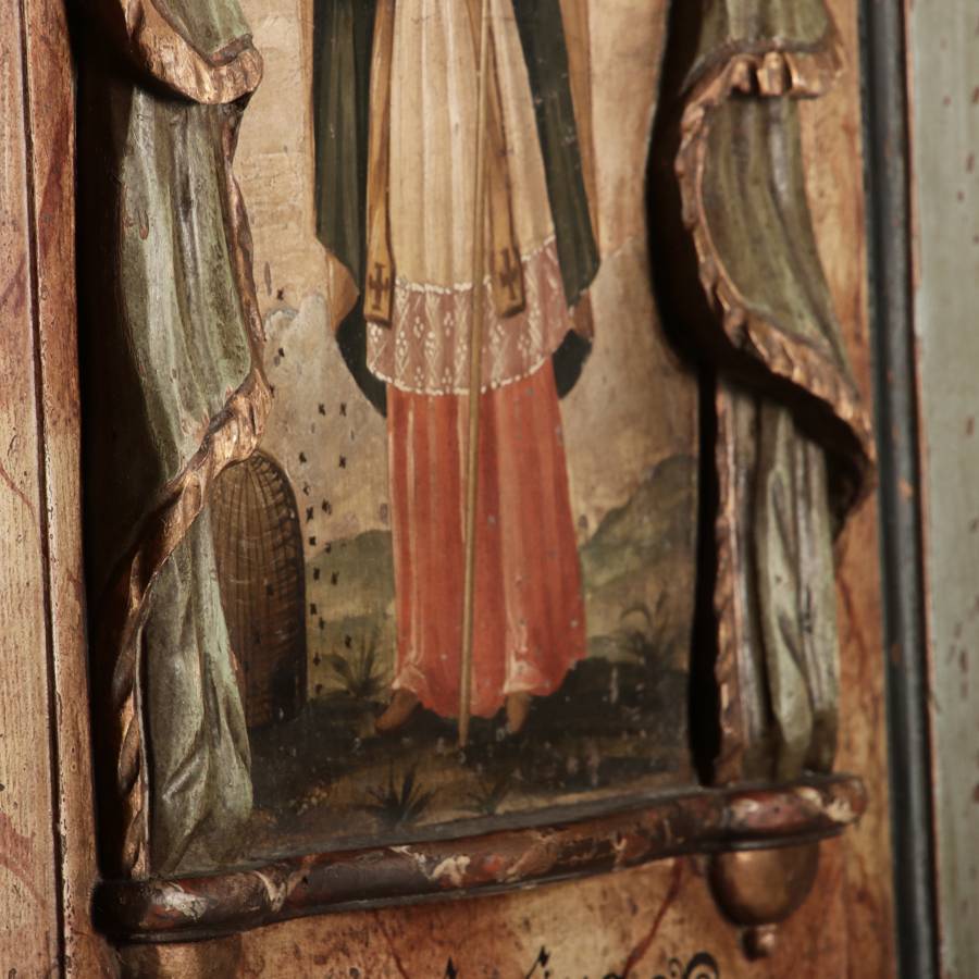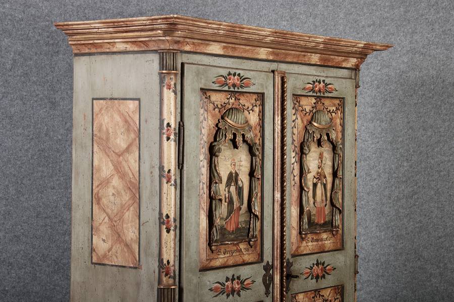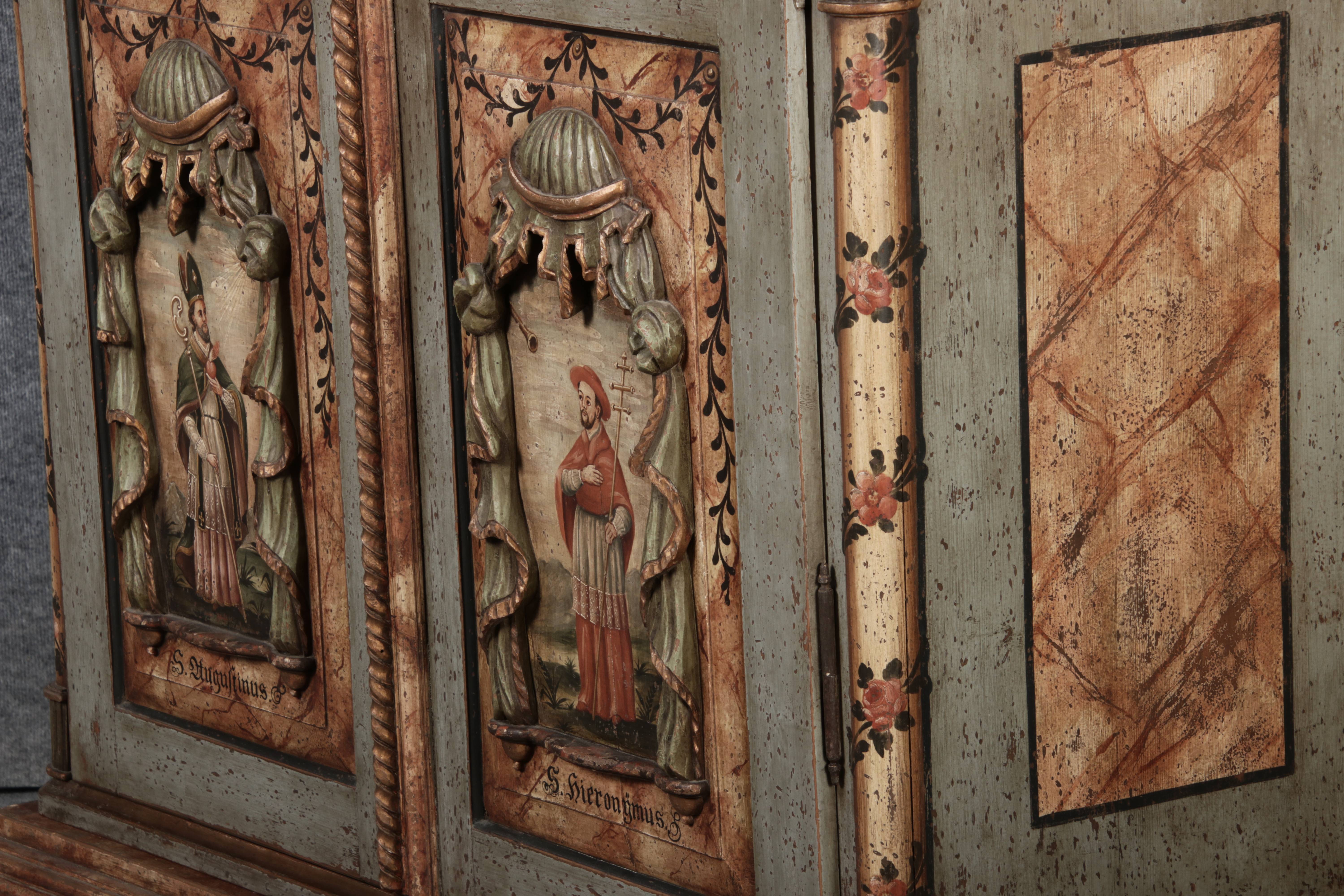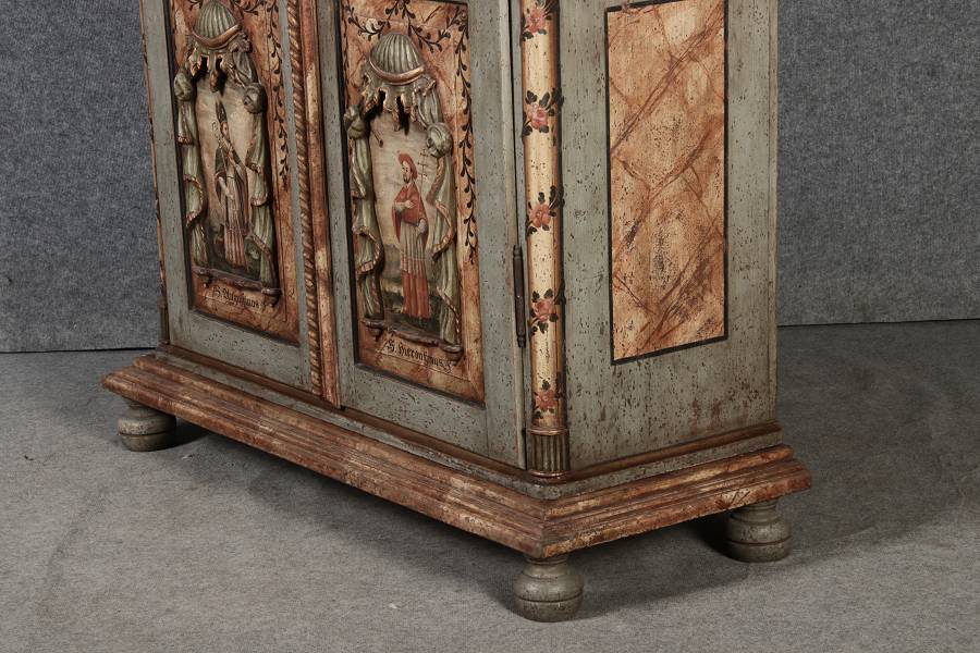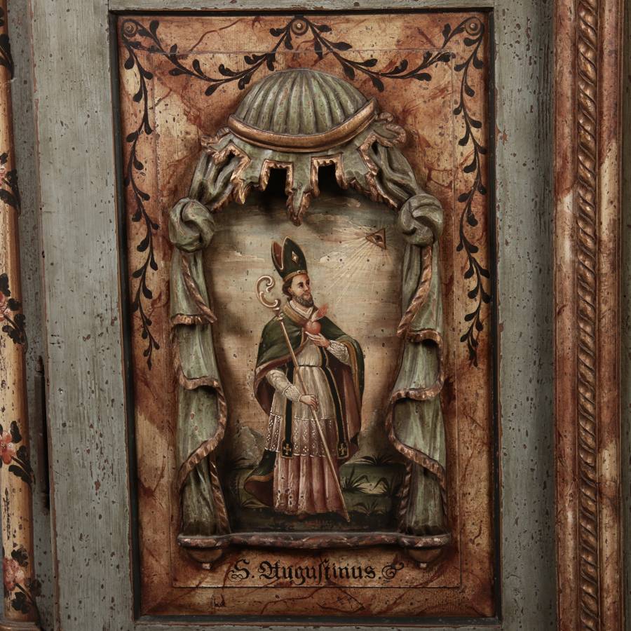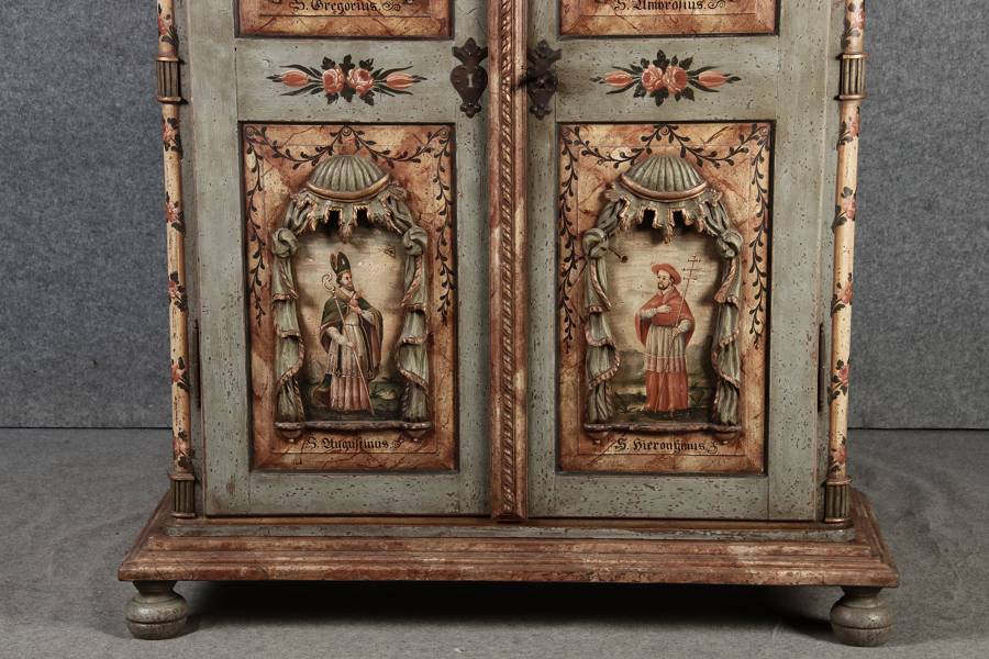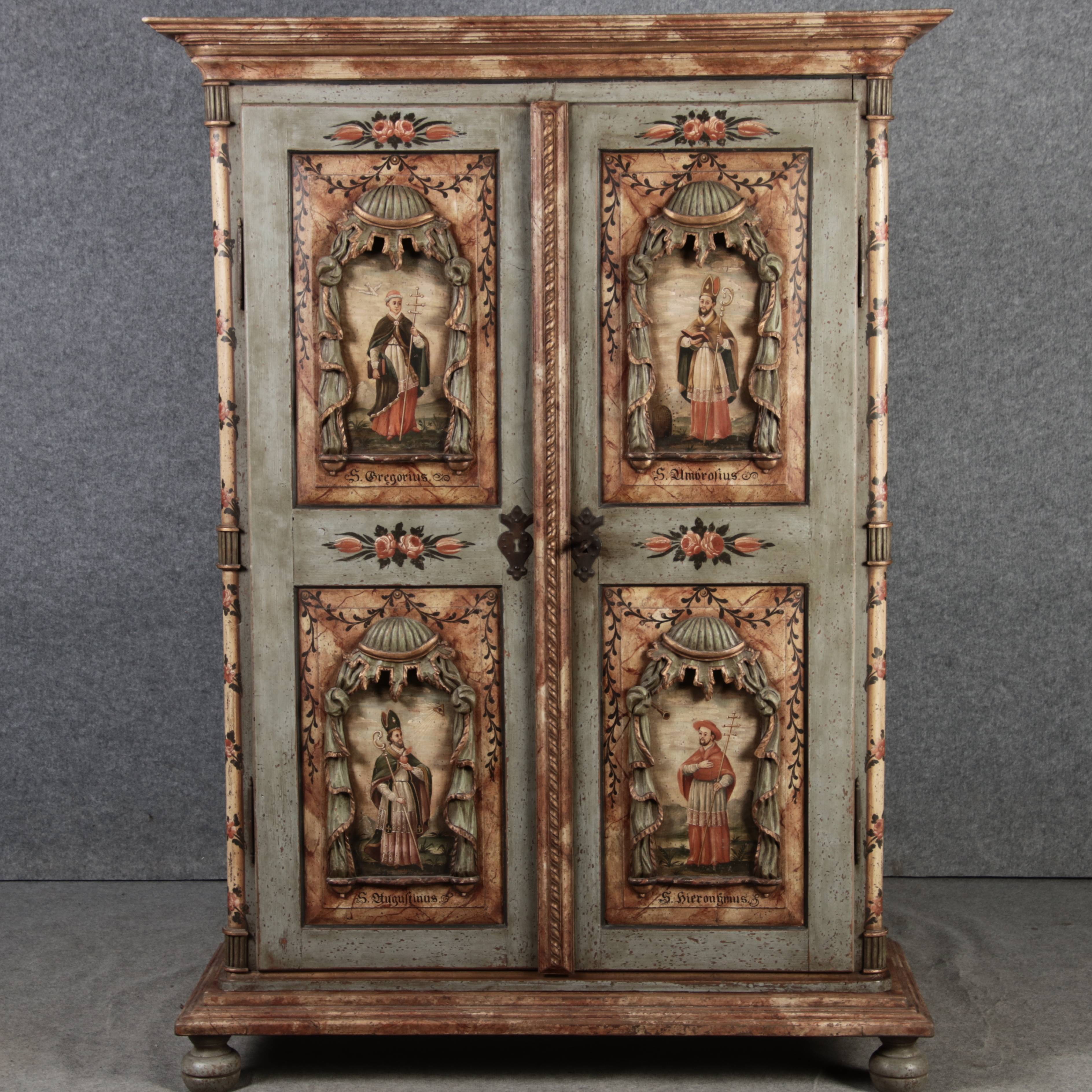 Beschreibung/description: Barockschrank aus dem 19 Jh. mit aufwendig geschnitzten Türfeldern.Die vier Felder mit Schnitzwerk und Darstellungen von S. Gregorius, S. Ambrosius, S. Augustinus und S. Hieronymus ArtikelNummer /number: sch122