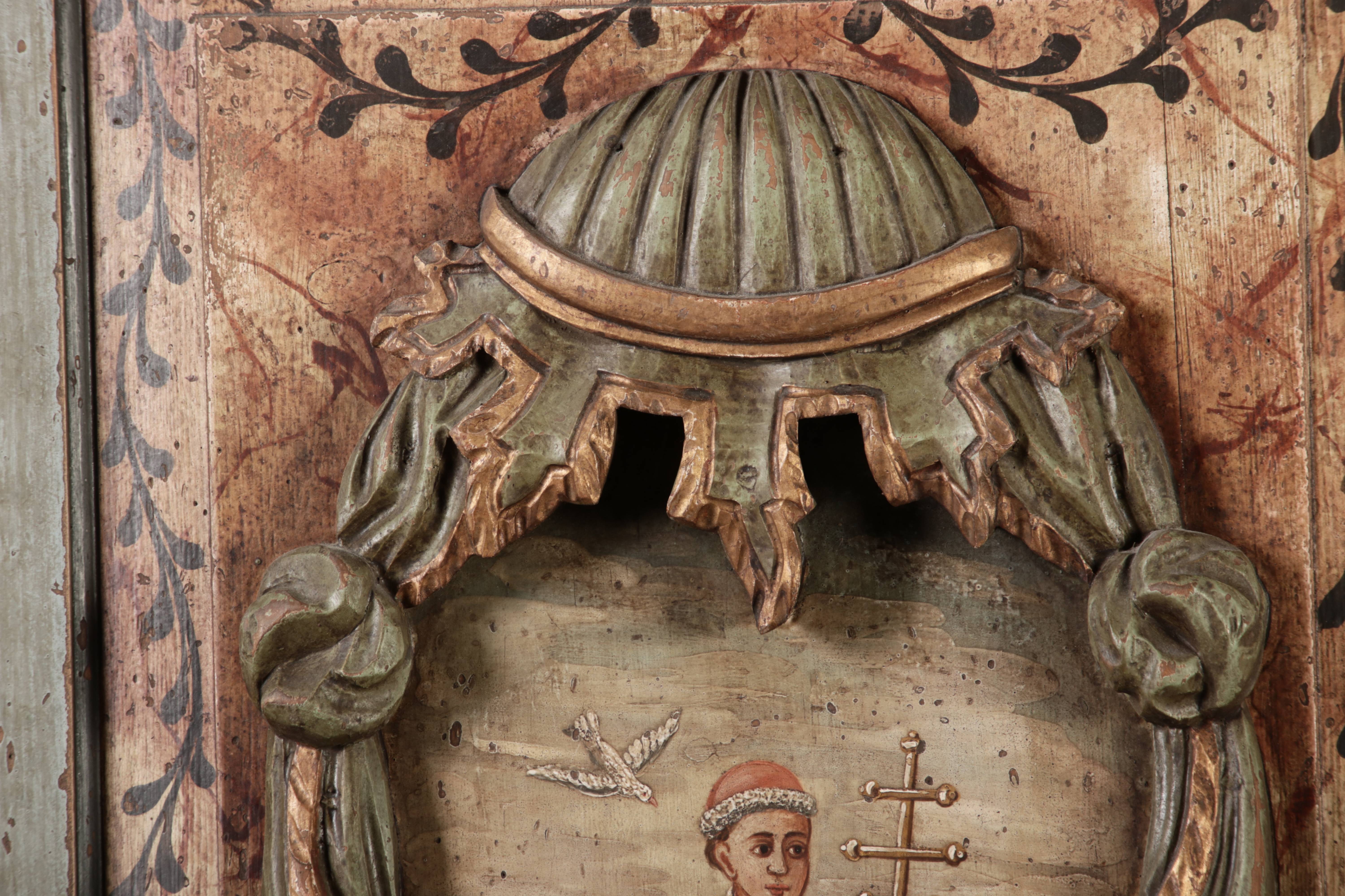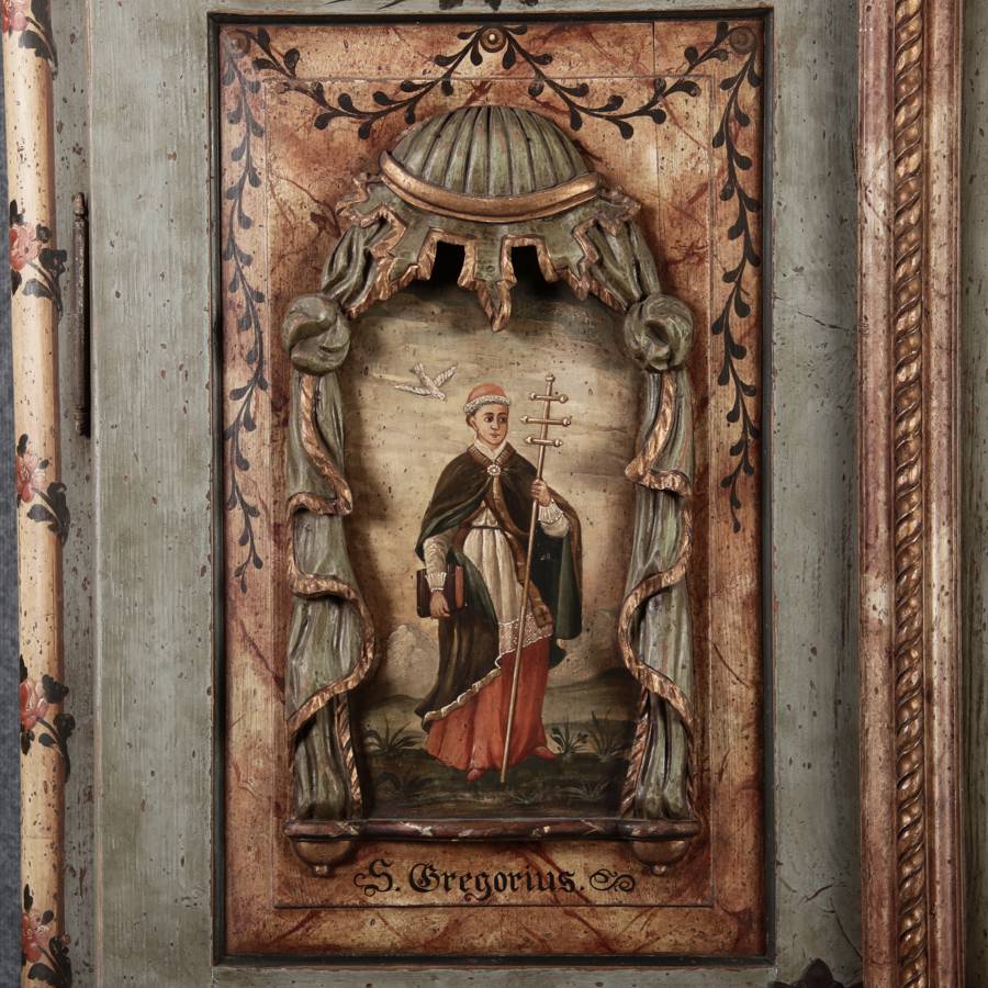Barockschrank aus dem 19 Jh. mit aufwendig geschnitzten Türfeldern.Die vier Felder mit Schnitzwerk und Darstellungen von S. Gregorius, S. Ambrosius, S. Augustinus und S. Hieronymus