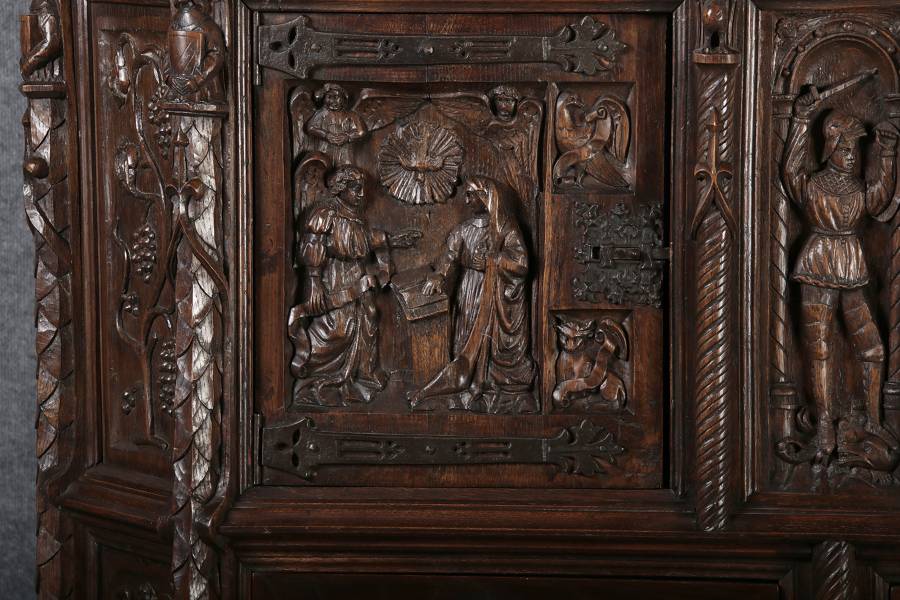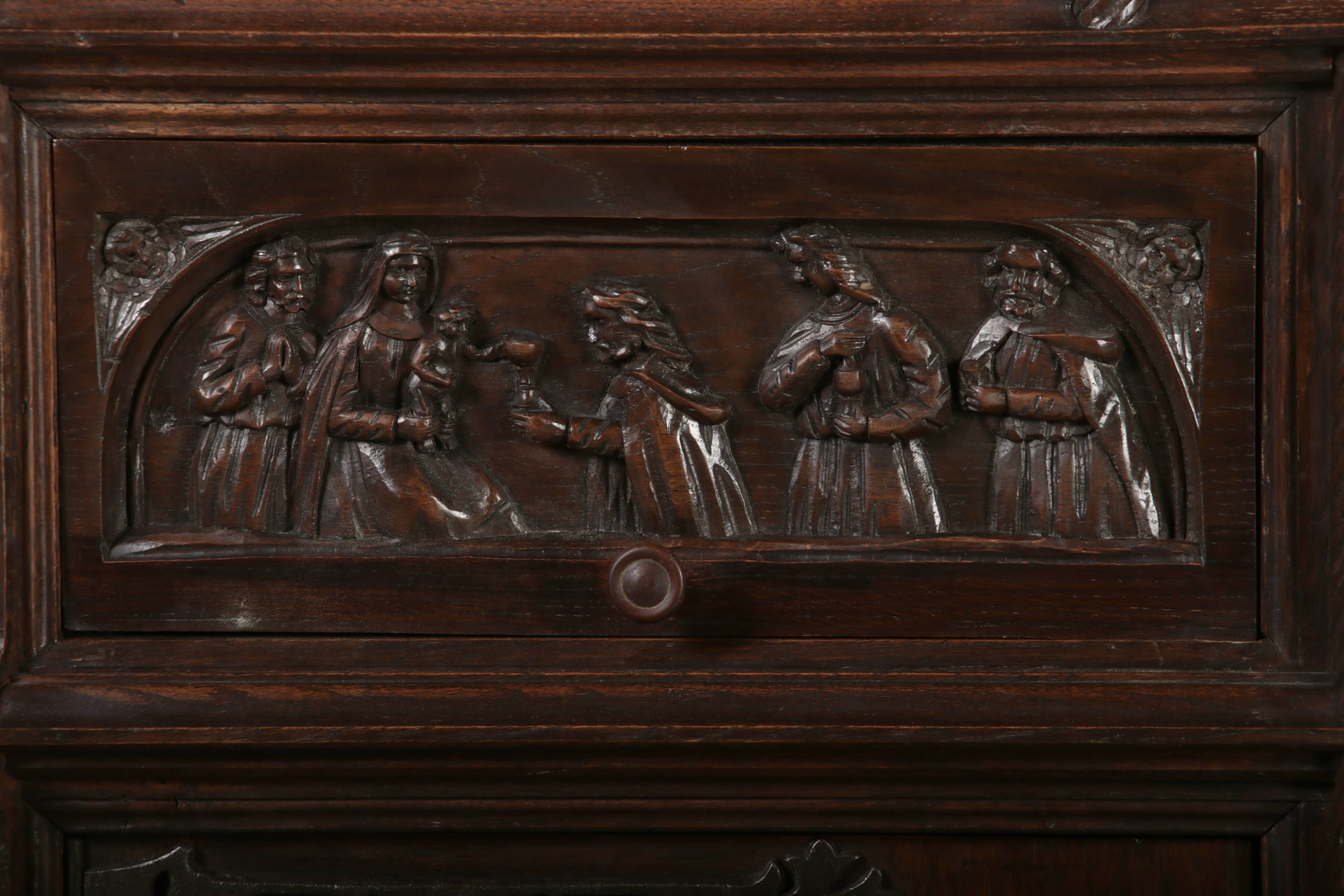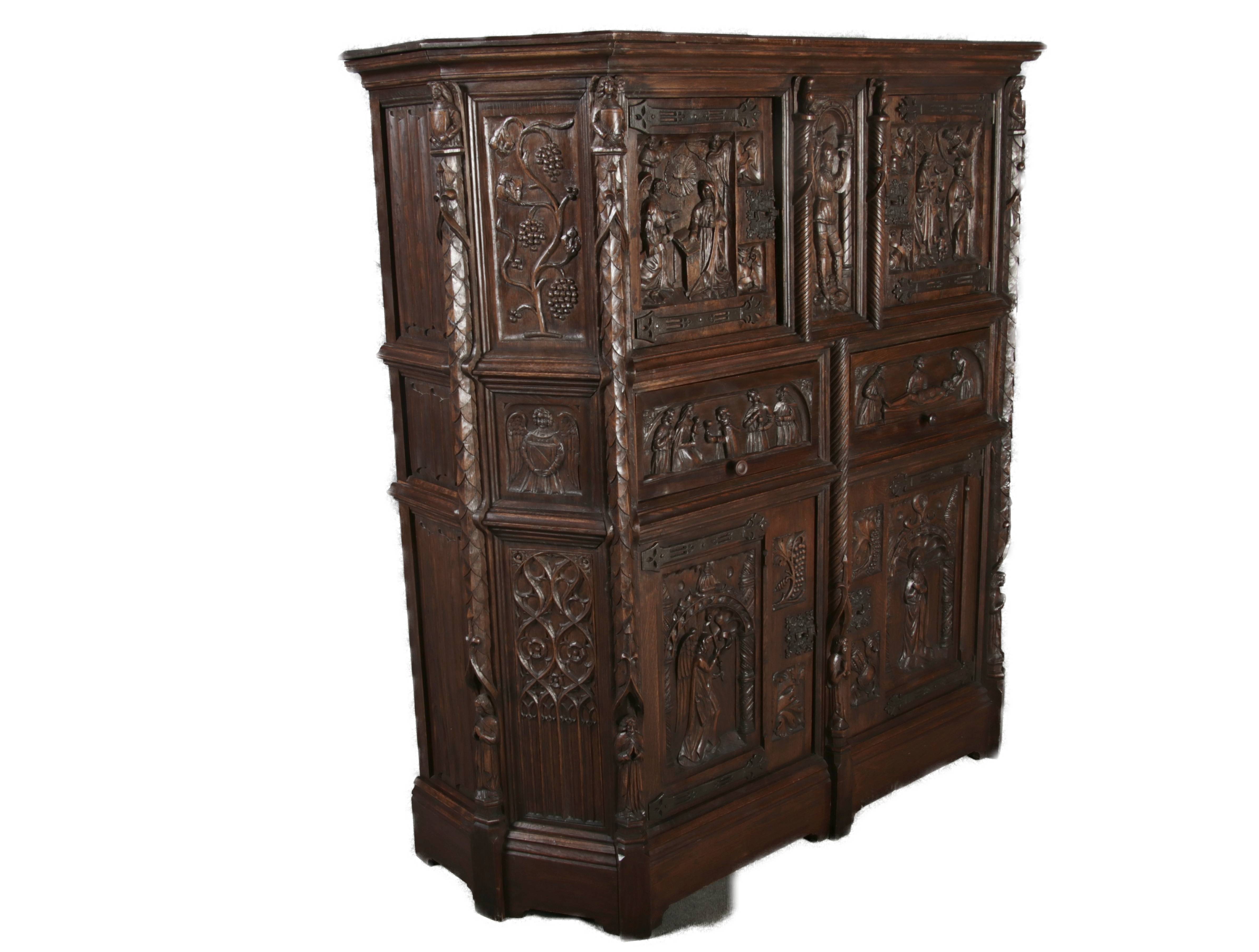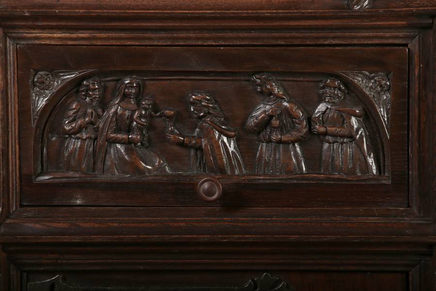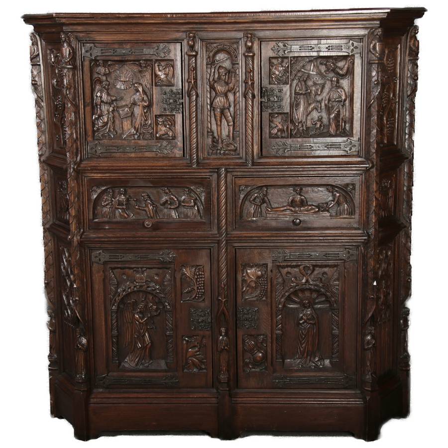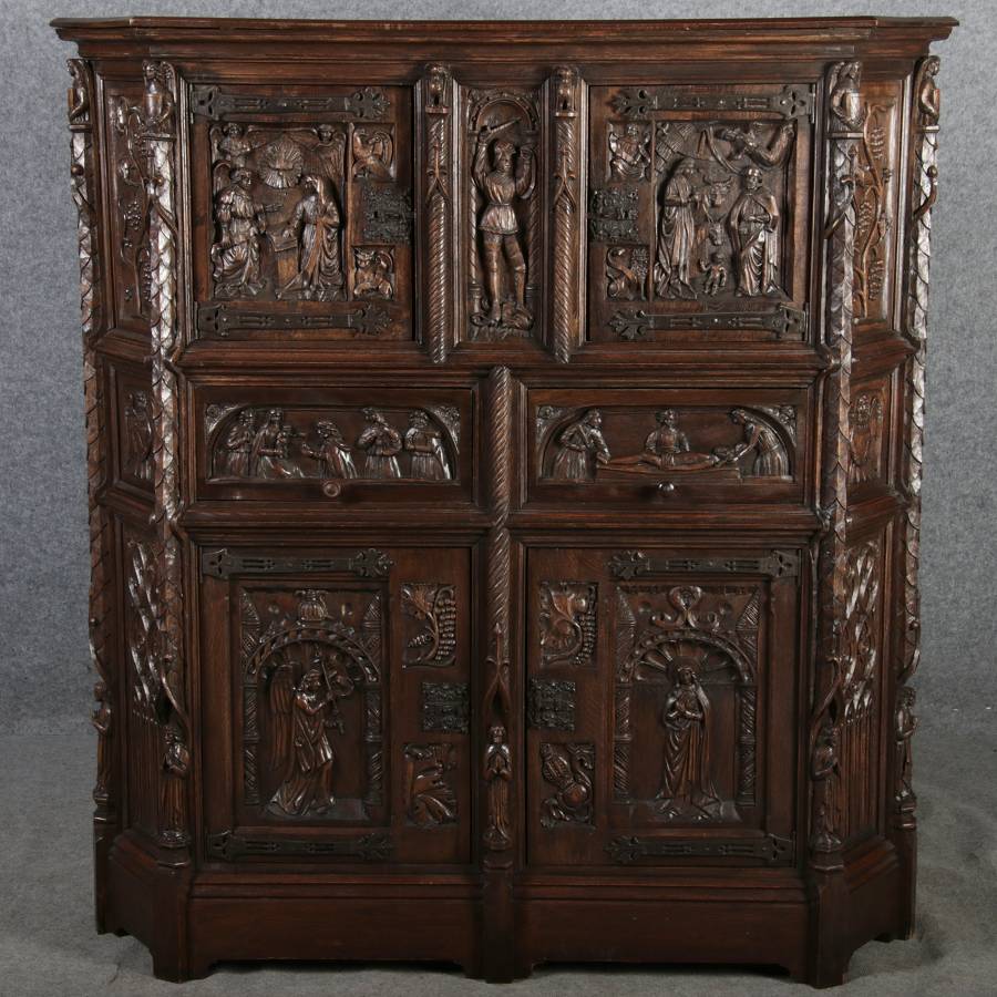 Prächtiger Schrank aus der Epoche des Historismus, gefertigt im späten 19. Jahrhundert. Das Möbel besticht durch sein außergewöhnlich reiches, tief gearbeitetes Schnitzwerk mit figürlichen und ornamentalen Darstellungen. Die Front ist in mehrere Felder gegliedert und zeigt reliefierte Szenen mit menschlichen Figuren, biblischen bzw. allegorischen Motiven sowie floralen und architektonischen Elementen. Der Korpus ist aus massivem Eichen Holz gearbeitet und zeigt eine warme, dunkel patinierte Oberfläche. Mit geschnitzten Säulen, profilierte Rahmen und aufwendig gestaltete Füllungen unterstreichen den repräsentativen Charakter des Schranks. Die handwerkliche Qualität und Detailtiefe der Schnitzereien zeugen von hoher Kunstfertigkeit. Innen bietet der Schrank großzügigen Stauraum und eignet sich sowohl als Aufbewahrungsmöbel als auch als eindrucksvolles Sammlerstück. Alters- und Gebrauchsspuren sind vorhanden und unterstreichen die Authentizität und den historischen Charakter des Möbels. Ein imposantes Originalstück des Historismus – ideal für Liebhaber historischer Möbel, repräsentative Interieurs oder Sammlungen.