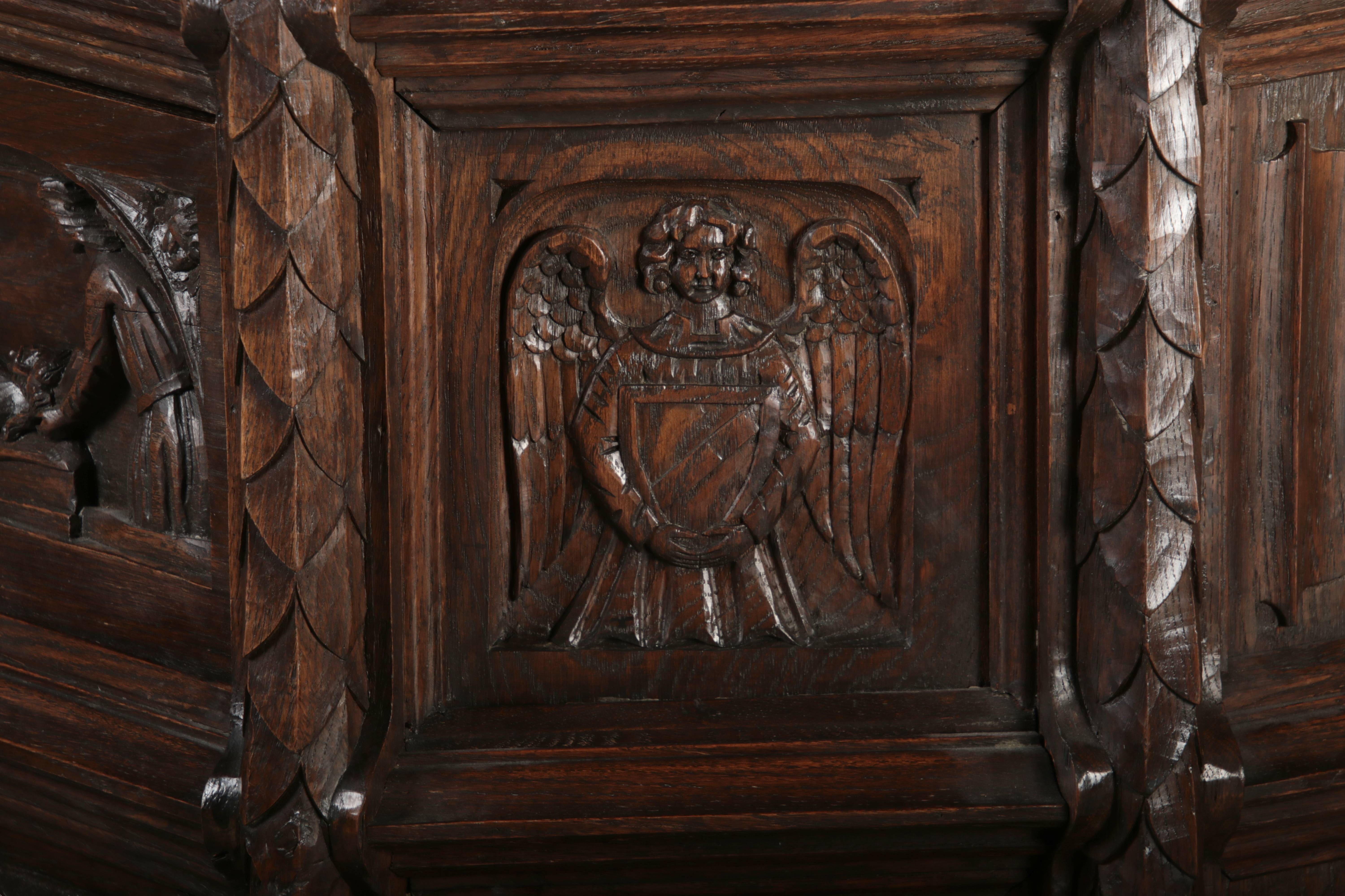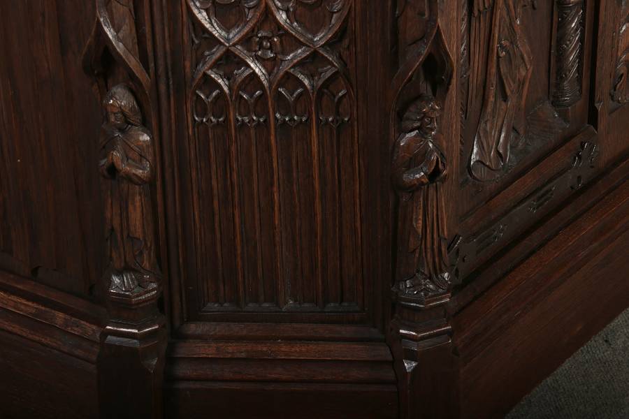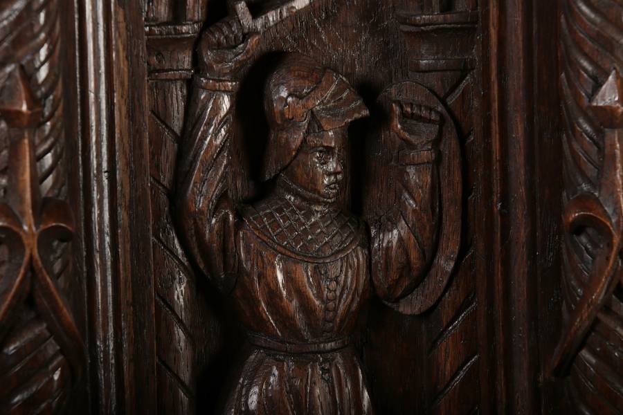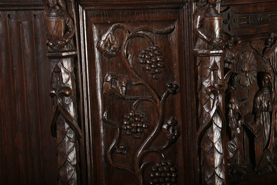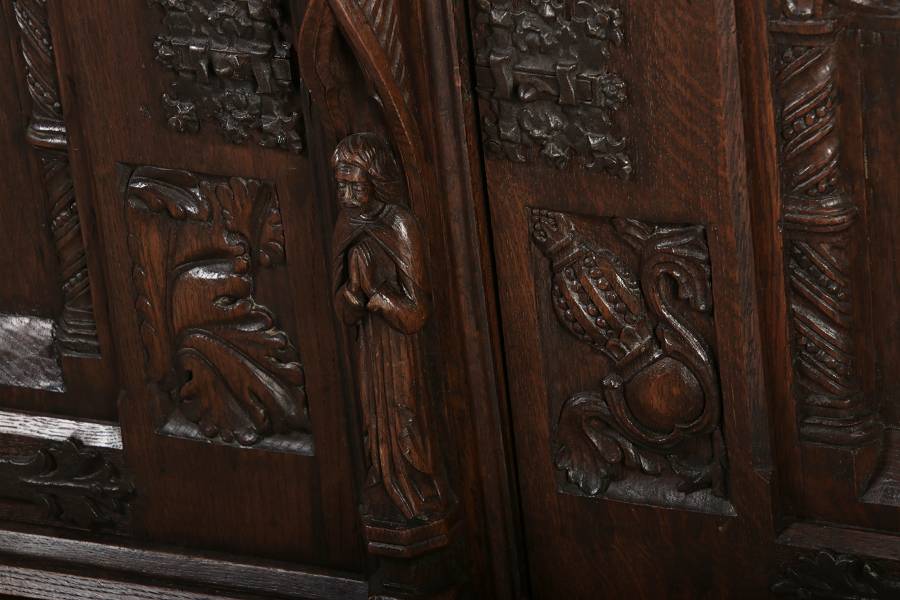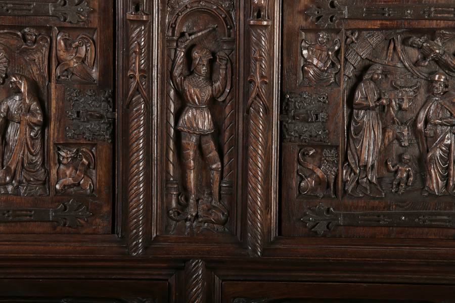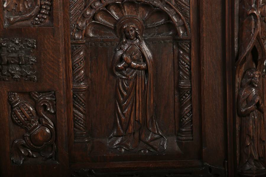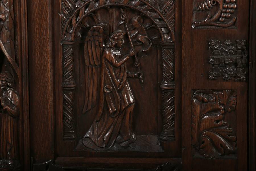 Prächtiger Schrank aus der Epoche des Historismus, gefertigt im späten 19. Jahrhundert. Das Möbel besticht durch sein außergewöhnlich reiches, tief gearbeitetes Schnitzwerk mit figürlichen und ornamentalen Darstellungen. Die Front ist in mehrere Felder gegliedert und zeigt reliefierte Szenen mit menschlichen Figuren, biblischen bzw. allegorischen Motiven sowie floralen und architektonischen Elementen. Der Korpus ist aus massivem Eichen Holz gearbeitet und zeigt eine warme, dunkel patinierte Oberfläche. Mit geschnitzten Säulen, profilierte Rahmen und aufwendig gestaltete Füllungen unterstreichen den repräsentativen Charakter des Schranks. Die handwerkliche Qualität und Detailtiefe der Schnitzereien zeugen von hoher Kunstfertigkeit. Innen bietet der Schrank großzügigen Stauraum und eignet sich sowohl als Aufbewahrungsmöbel als auch als eindrucksvolles Sammlerstück. Alters- und Gebrauchsspuren sind vorhanden und unterstreichen die Authentizität und den historischen Charakter des Möbels. Ein imposantes Originalstück des Historismus – ideal für Liebhaber historischer Möbel, repräsentative Interieurs oder Sammlungen.