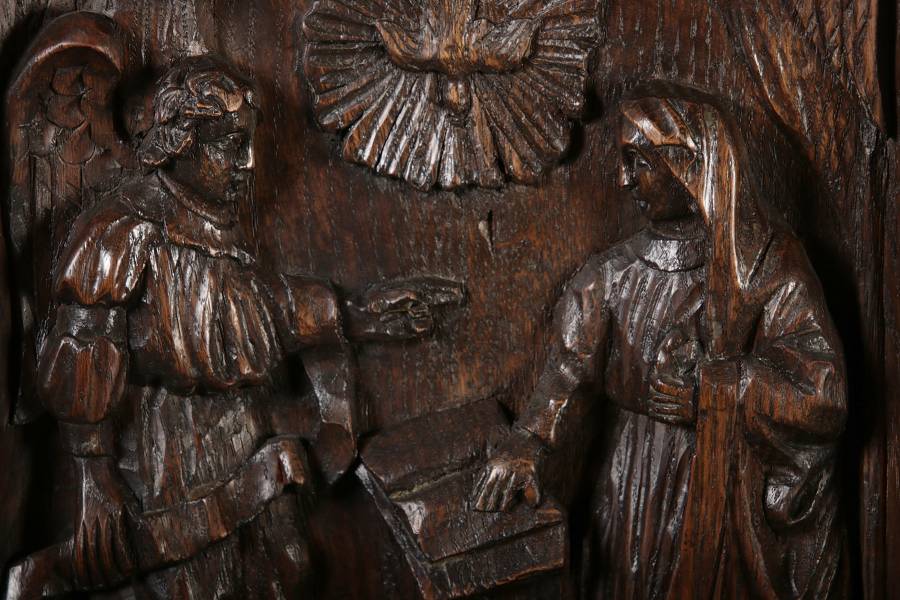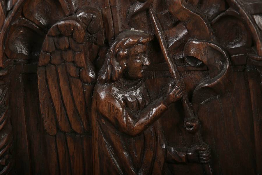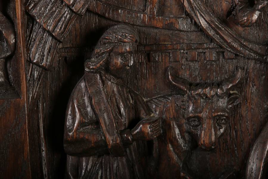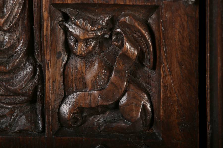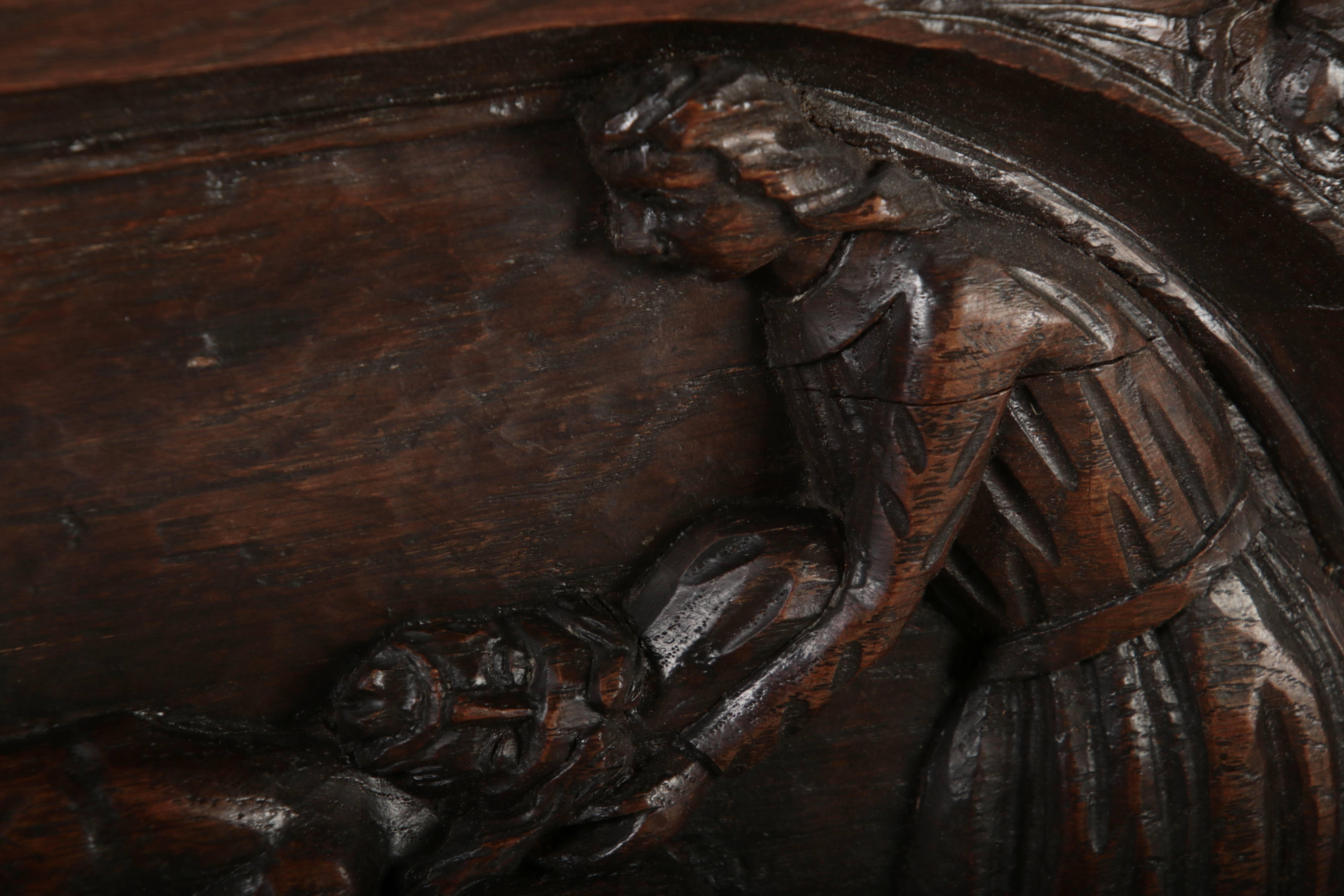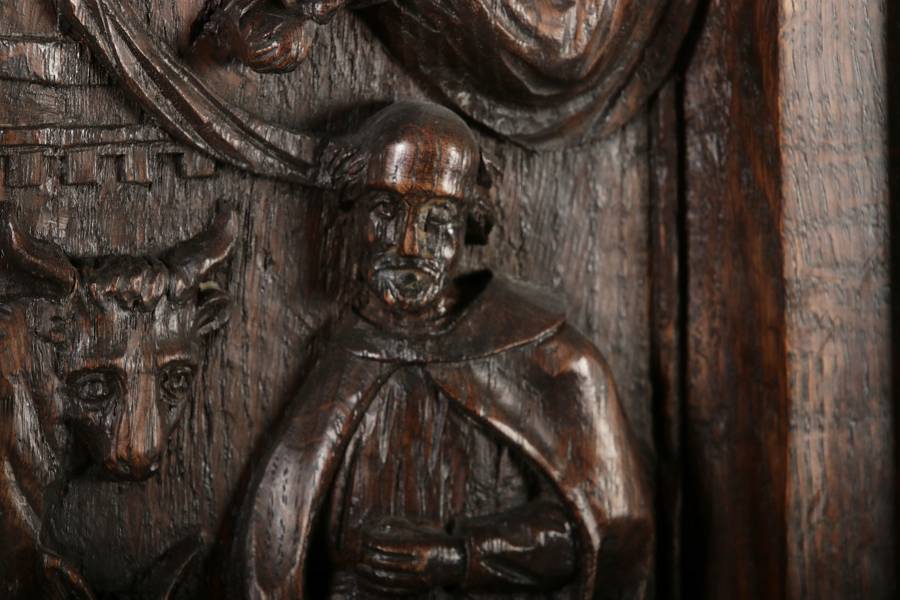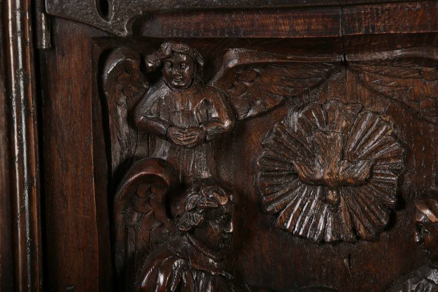 Prächtiger Schrank aus der Epoche des Historismus, gefertigt im späten 19. Jahrhundert. Das Möbel besticht durch sein außergewöhnlich reiches, tief gearbeitetes Schnitzwerk mit figürlichen und ornamentalen Darstellungen. Die Front ist in mehrere Felder gegliedert und zeigt reliefierte Szenen mit menschlichen Figuren, biblischen bzw. allegorischen Motiven sowie floralen und architektonischen Elementen. Der Korpus ist aus massivem Eichen Holz gearbeitet und zeigt eine warme, dunkel patinierte Oberfläche. Mit geschnitzten Säulen, profilierte Rahmen und aufwendig gestaltete Füllungen unterstreichen den repräsentativen Charakter des Schranks. Die handwerkliche Qualität und Detailtiefe der Schnitzereien zeugen von hoher Kunstfertigkeit. Innen bietet der Schrank großzügigen Stauraum und eignet sich sowohl als Aufbewahrungsmöbel als auch als eindrucksvolles Sammlerstück. Alters- und Gebrauchsspuren sind vorhanden und unterstreichen die Authentizität und den historischen Charakter des Möbels. Ein imposantes Originalstück des Historismus – ideal für Liebhaber historischer Möbel, repräsentative Interieurs oder Sammlungen.