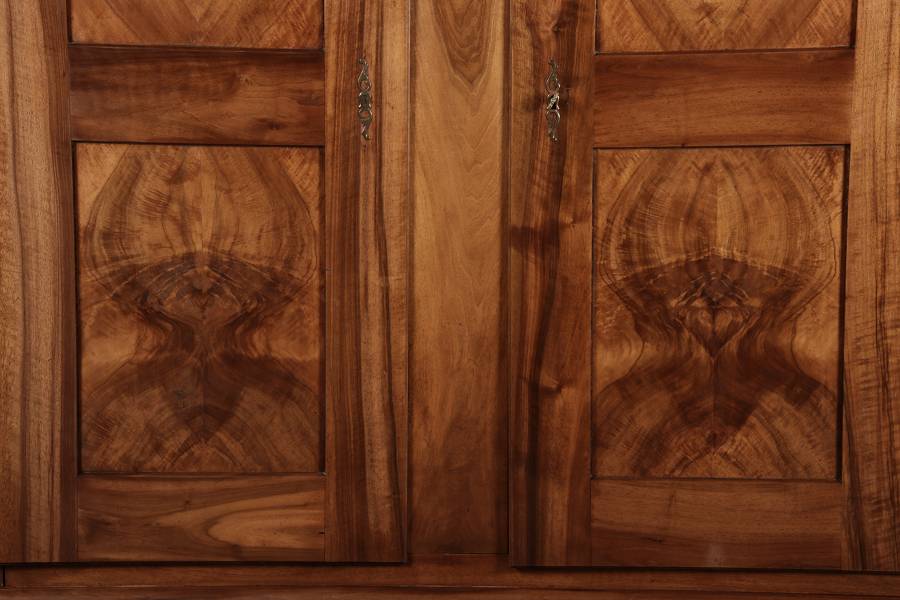 Beschreibung/description: Biedermeier Schrank aus Nussbaum, um 1830 – innen neu ausgeschlagen, sehr sauberDieser elegante Biedermeierschrank um 1830 präsentiert sich in wunderschönem Nussbaum, dessen spiegelbildliche Maserung (Fladerung) auf den Türen ein besonders edles und harmonisches Gesamtbild erzeugt. Die klaren Linien und die zeittypische, zurückhaltende Formgebung machen diesen Schrank zu einem klassischen Vertreter der Biedermeier-Epoche. Der Innenraum wurde vollständig mit neuem Holz ausgeschlagen und befindet sich in absolut sauberem, gepflegtem Zustand – ideal für den sofortigen praktischen Einsatz. Die Rückwand wurde sachgerecht ergänzt, was zur Stabilität und Langlebigkeit des Möbelstücks beiträgt, ohne die authentische Gesamtwirkung zu beeinträchtigen. Merkmale: