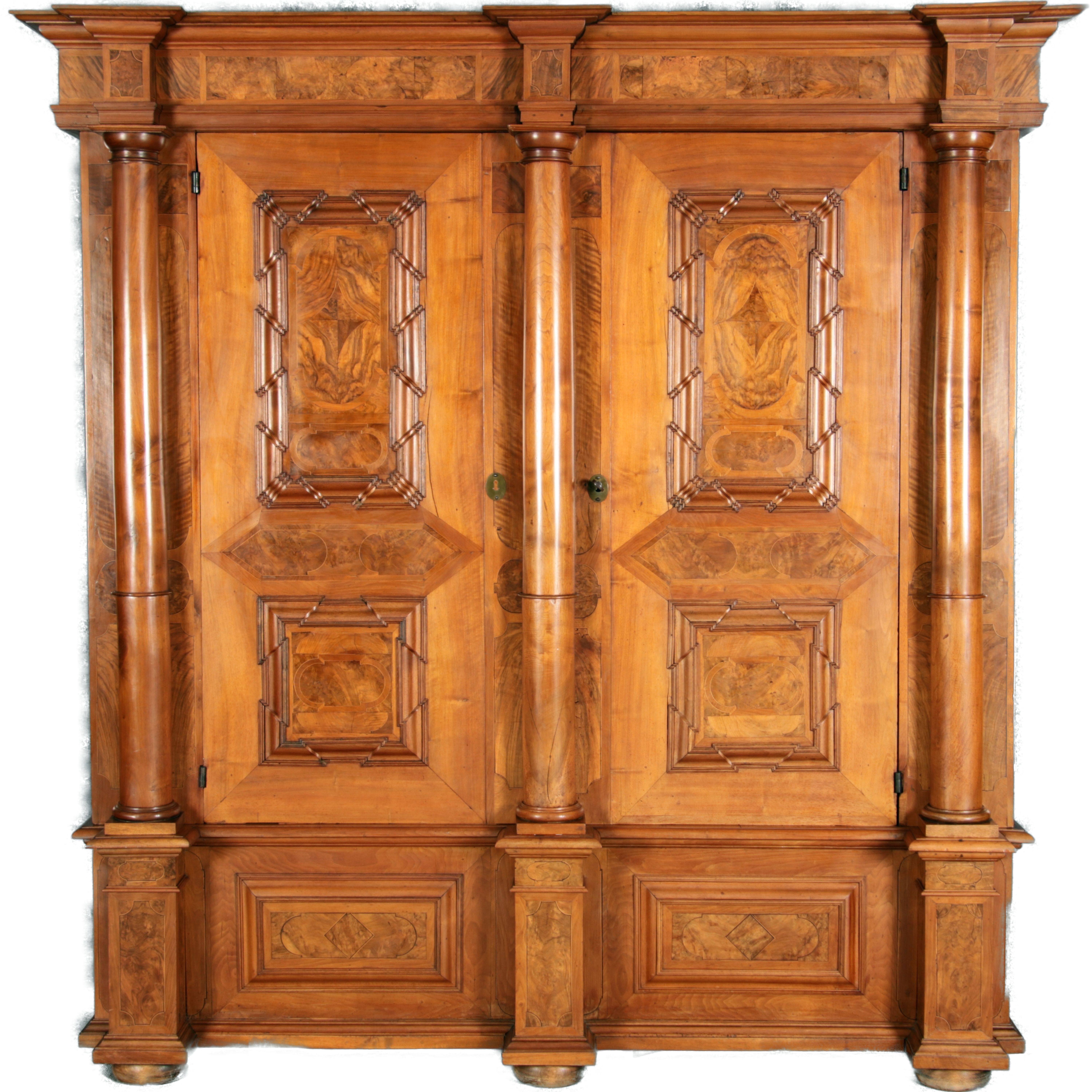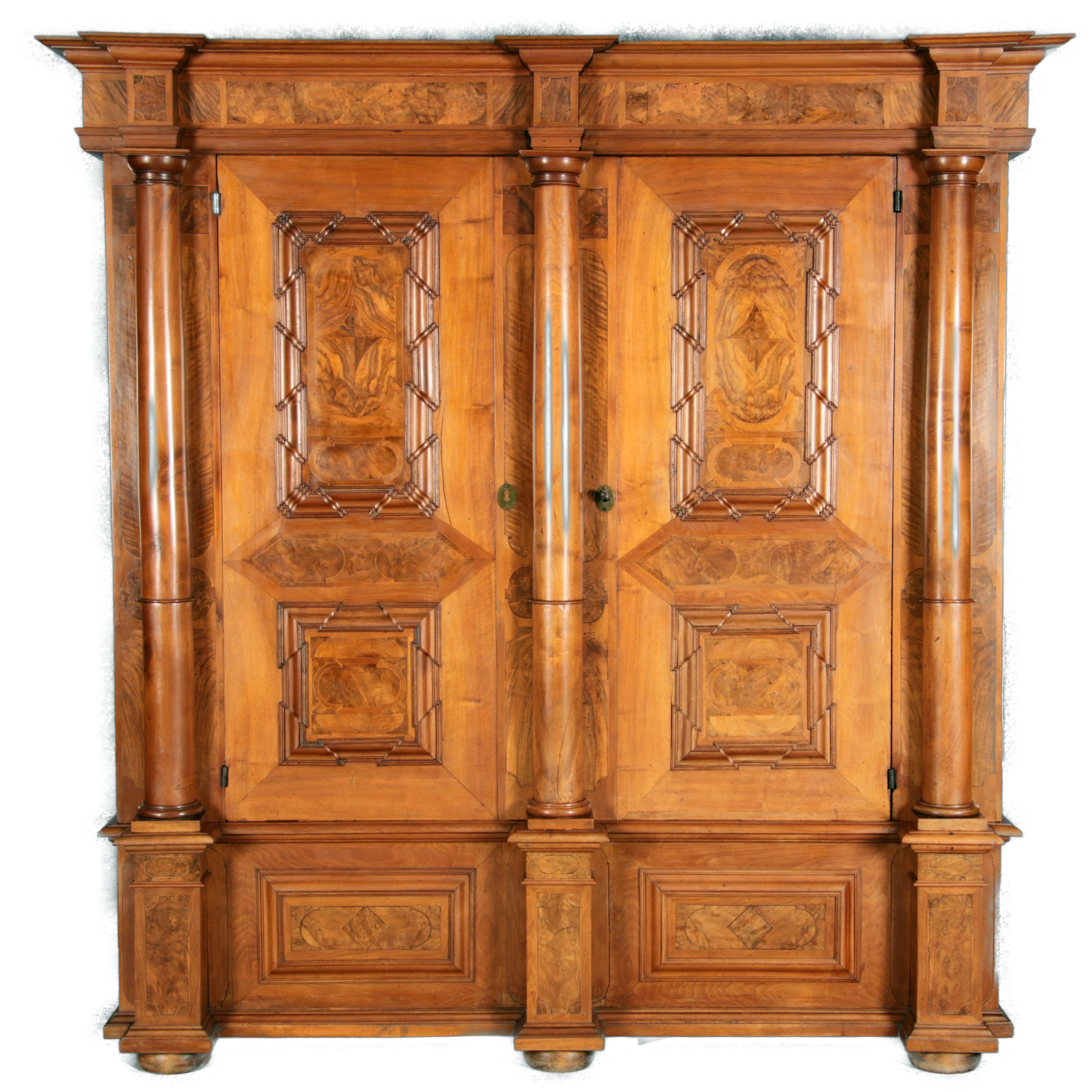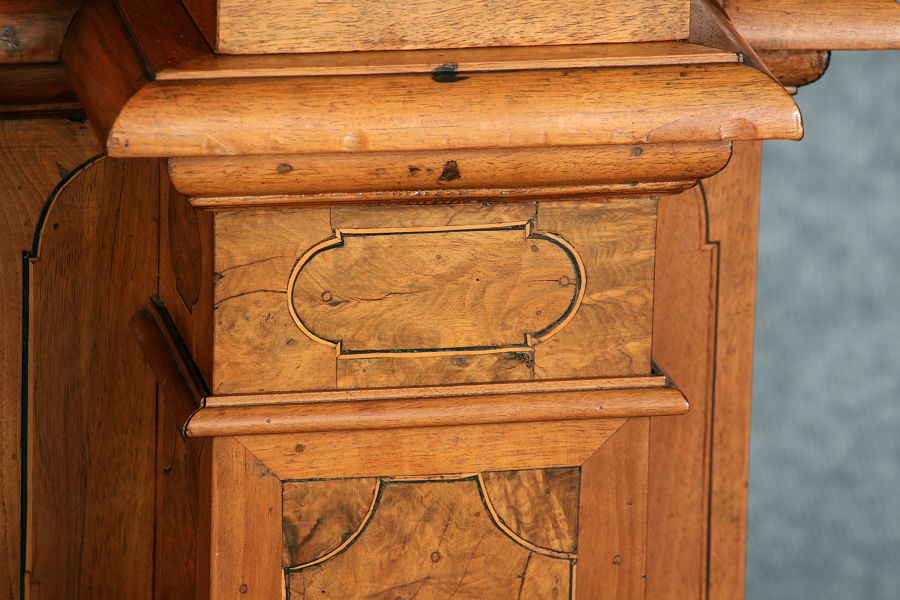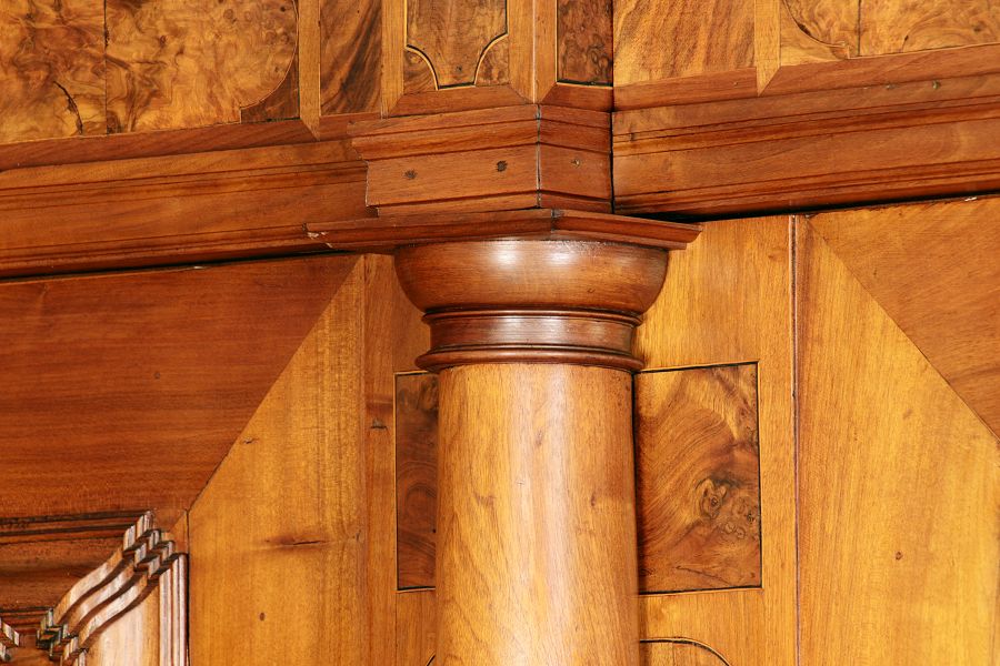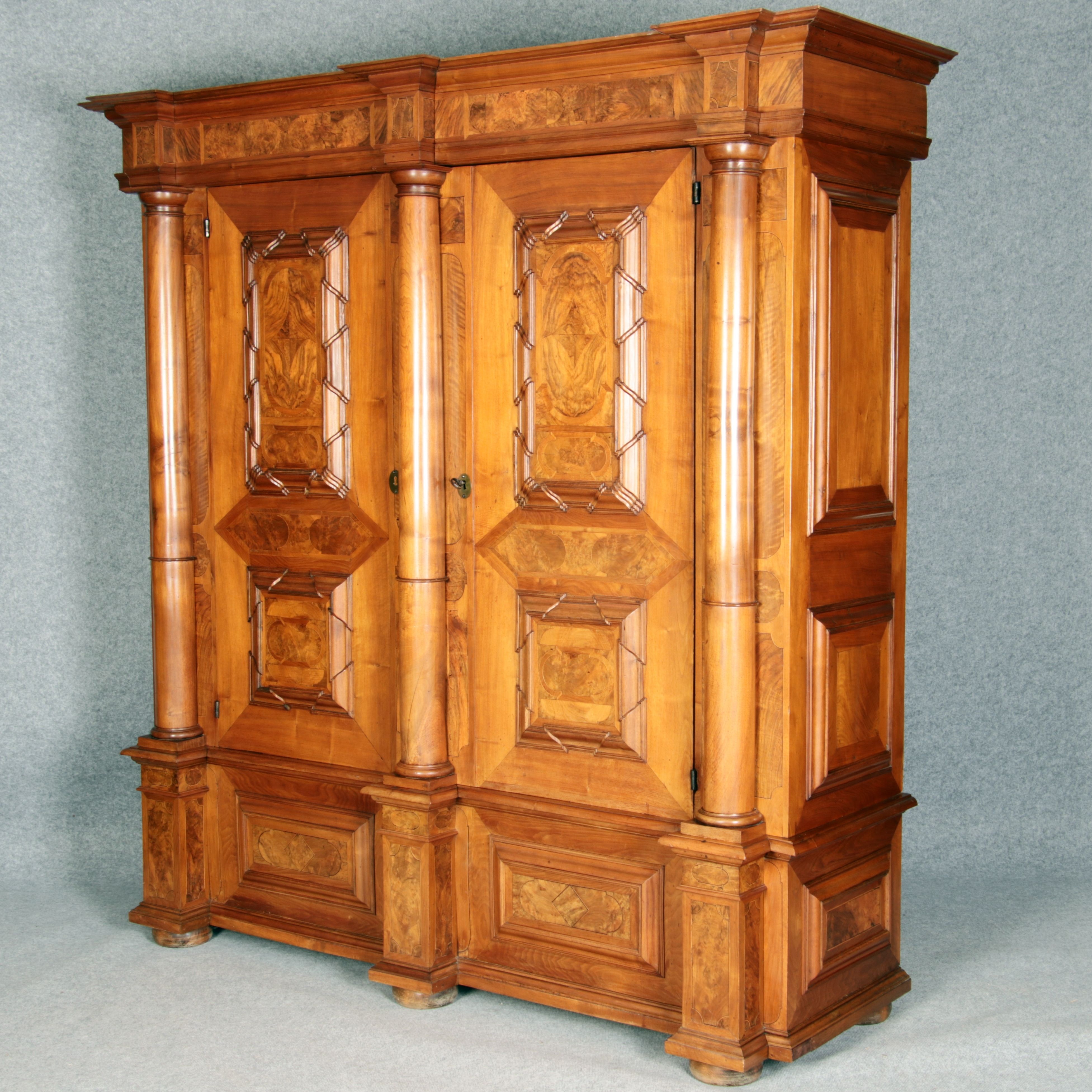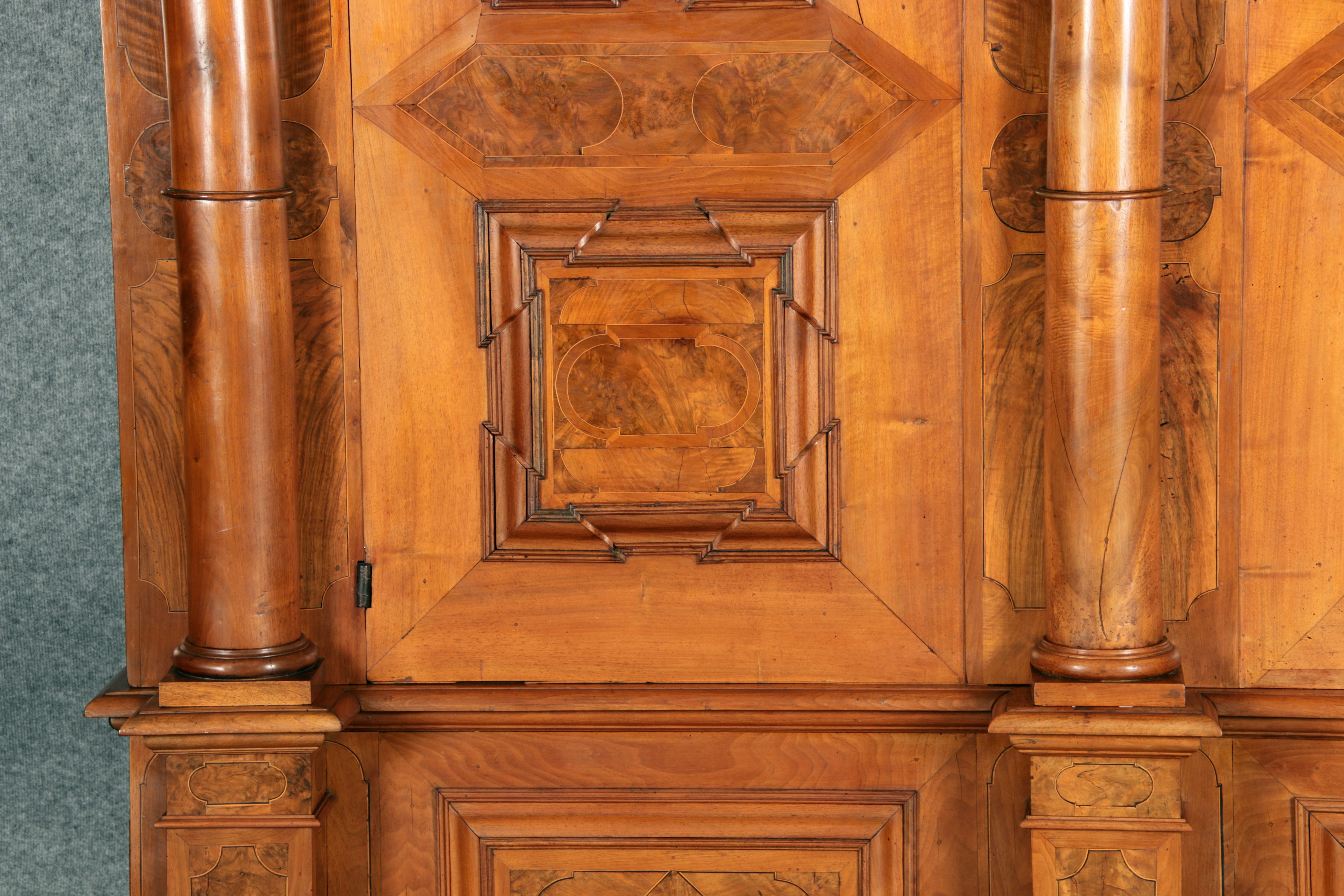 mit drei massiven großen Säulen Kassetenfüllungen und Einlegearbeiten.
