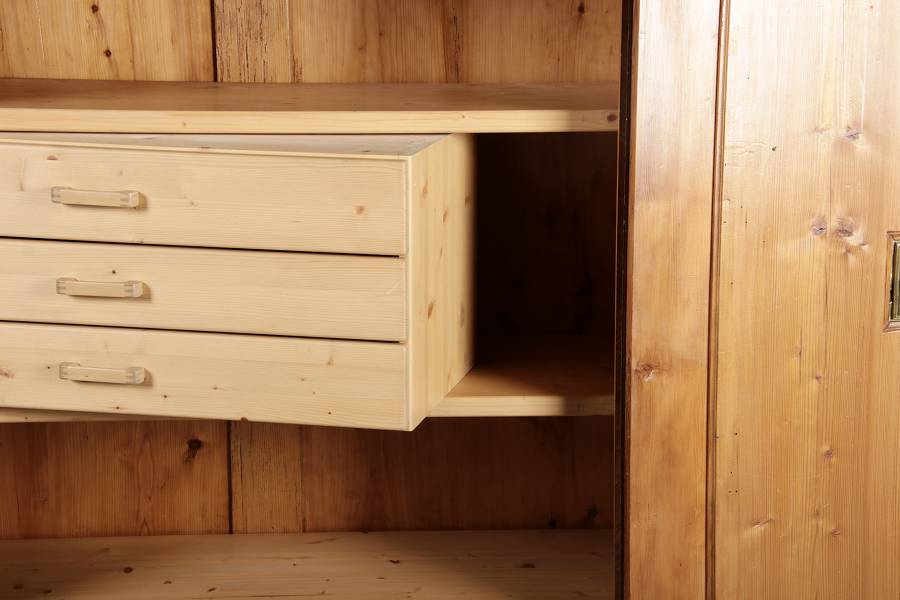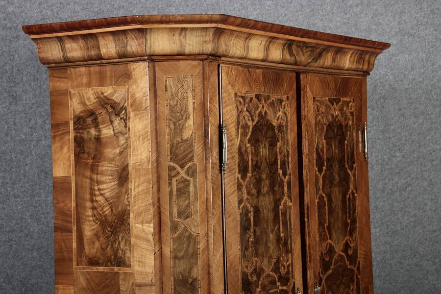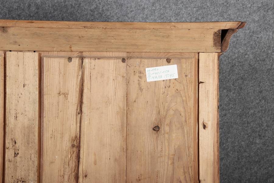 Masse/dimensions: Höhe/Height ca. 190 cm, Breite Korpus/Broad Boda ca. 140 cm, Breite Gesims/Broad cornice ca. 157 cm, Tiefe Korpus/Deep body ca. 48 cm, Tiefe Gesims/Deep cornice ca. 58 cm,