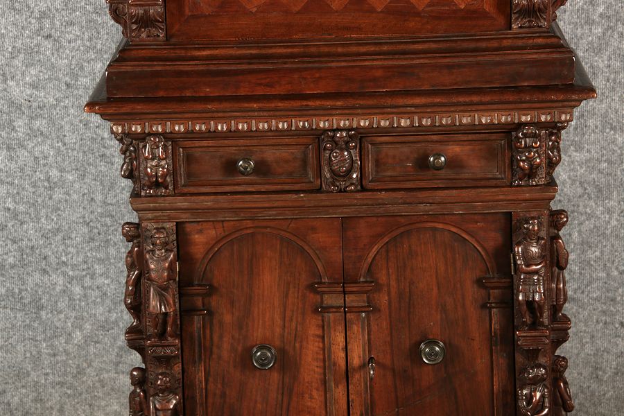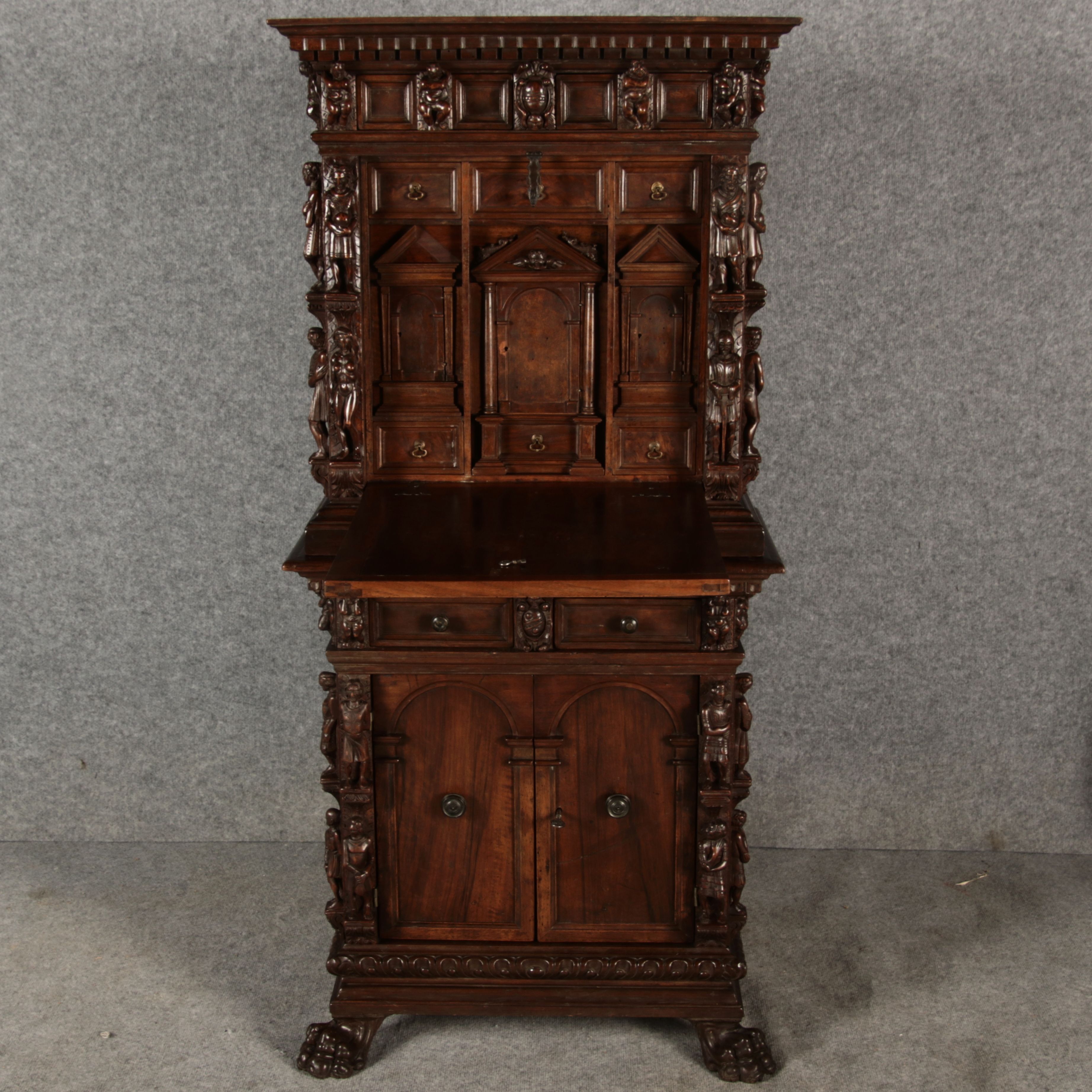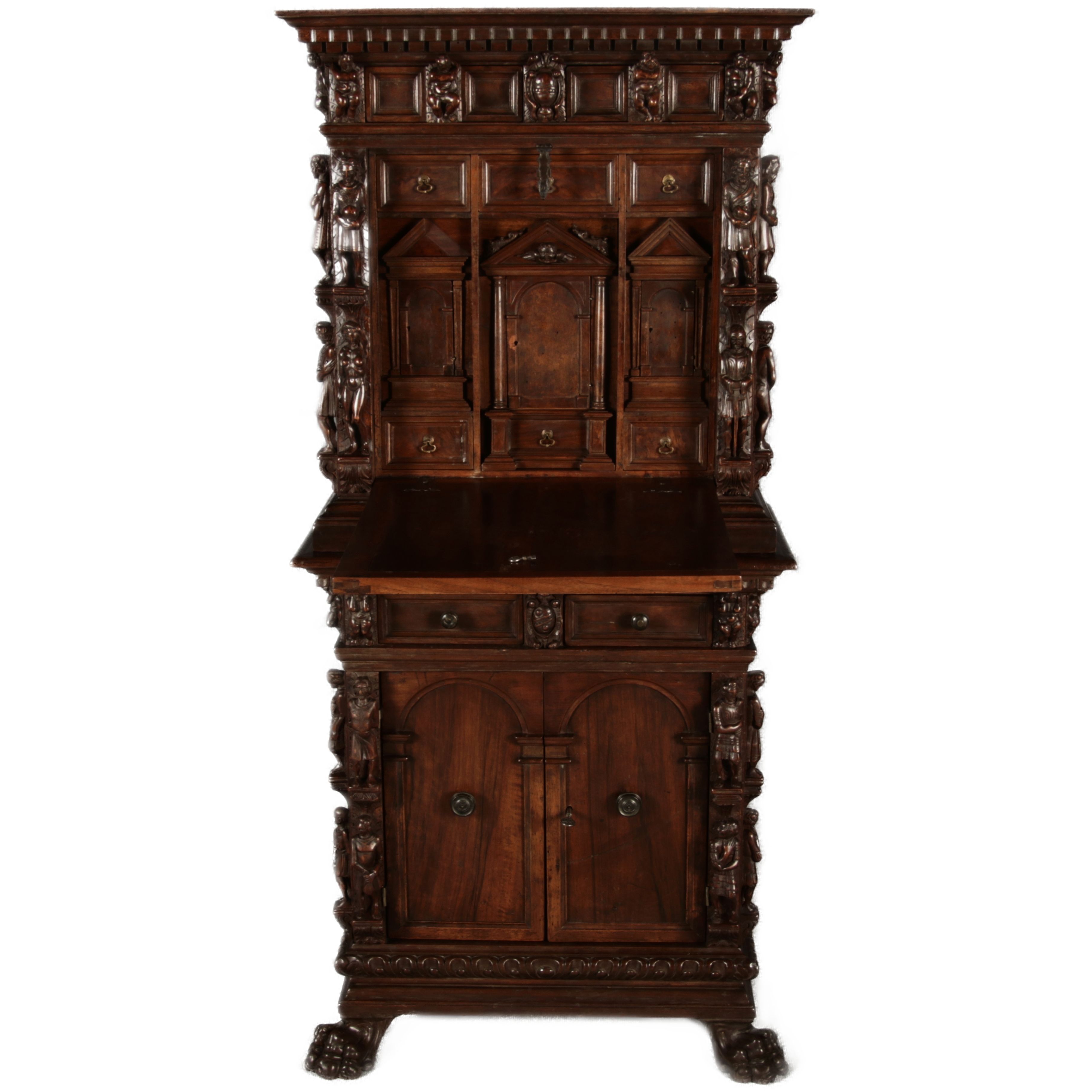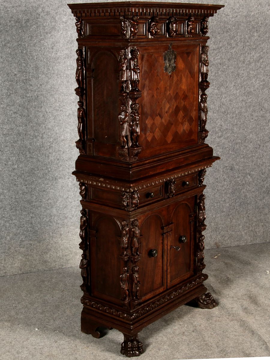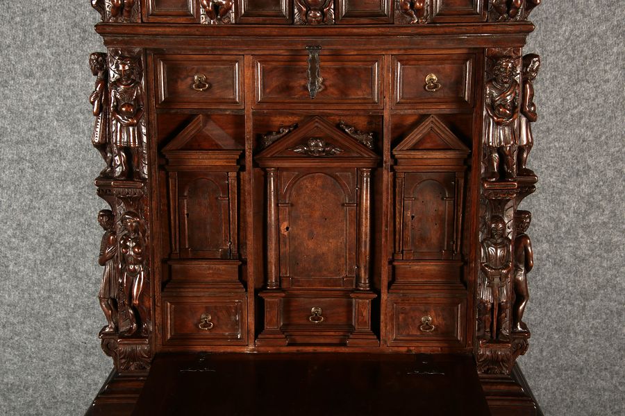 Kleiner Antiker Renaissance-Sekretär, Nussbaum, 17.-19. Jahrhundert Dieser kleine dennoch imposante Renaissance-Sekretär aus Nussbaumholz stammt aus der Zeit zwischen dem 17. und 19. (Teile des Sekretärs lassen darauf schließen, das er im 19 Jh. gefertigt worden ist, eventuell aus alten Teilen.) Jahrhundert und repräsentiert den Stil und die Handwerkskunst der Renaissance-Epoche. Das Möbelstück beeindruckt durch seine aufwendigen Schnitzereien, die kunstvolle Gestaltung und die kraftvolle Präsenz. Dieser Renaissance-Sekretär ist ein beeindruckendes Kunstwerk, das sowohl dekorativ als auch funktional ist. Seine massive Bauweise, gepaart mit der kunstvollen Gestaltung, macht ihn zu einem wahren Prunkstück für jeden Liebhaber historischer Möbel. Der Sekretär bietet nicht nur großzügigen Stauraum, sondern ist auch ein Zeugnis der meisterhaften Handwerkskunst vergangener Jahre. |