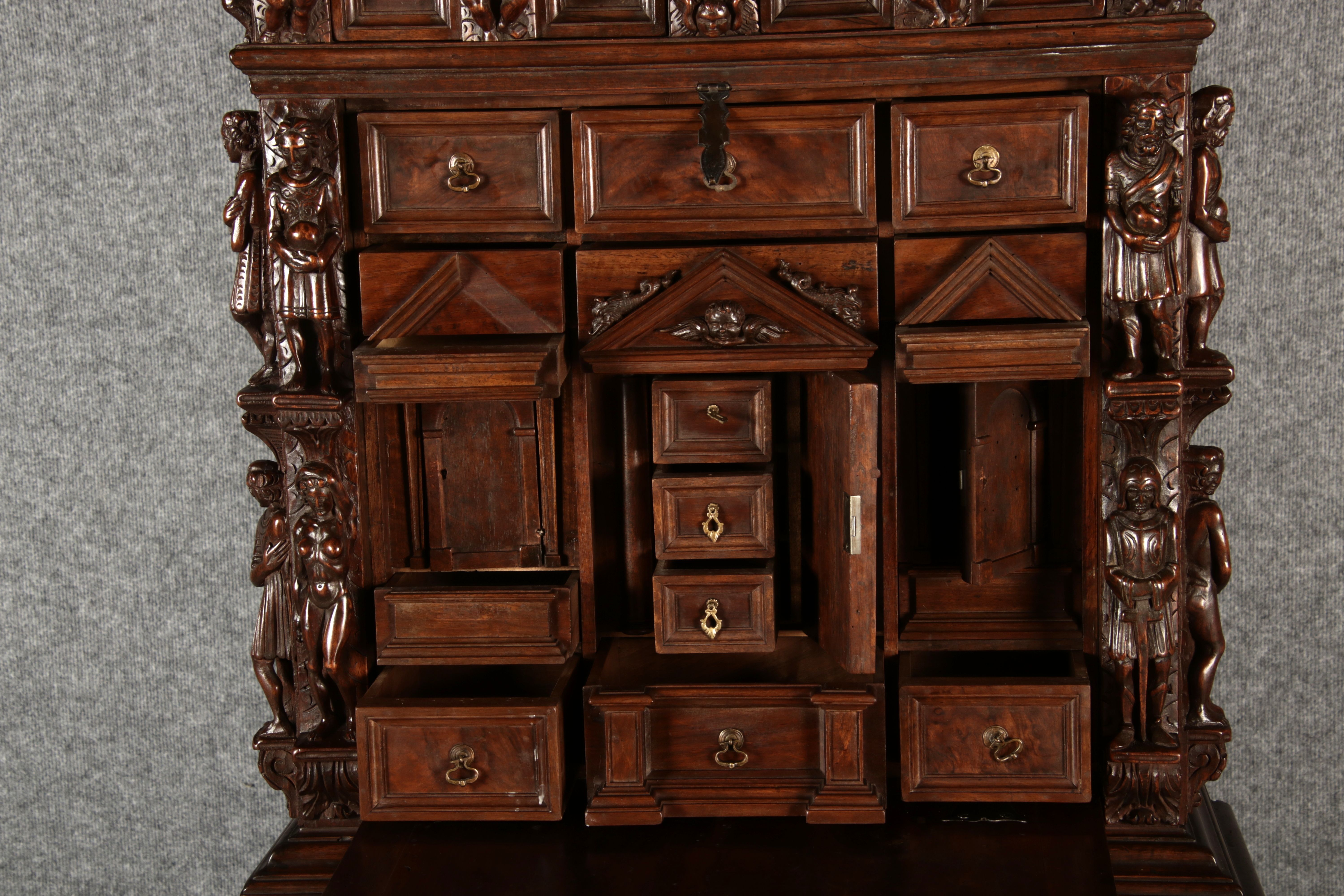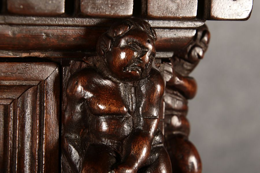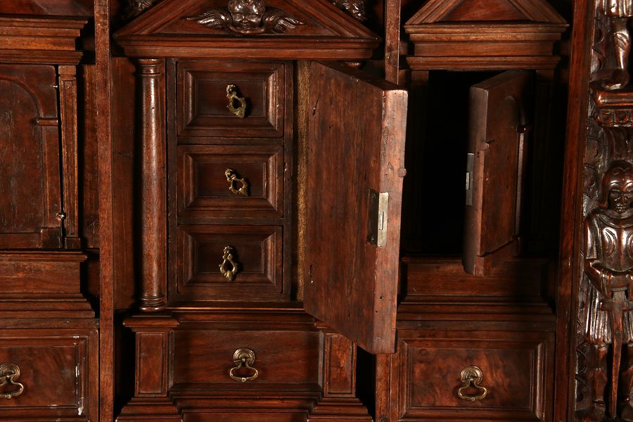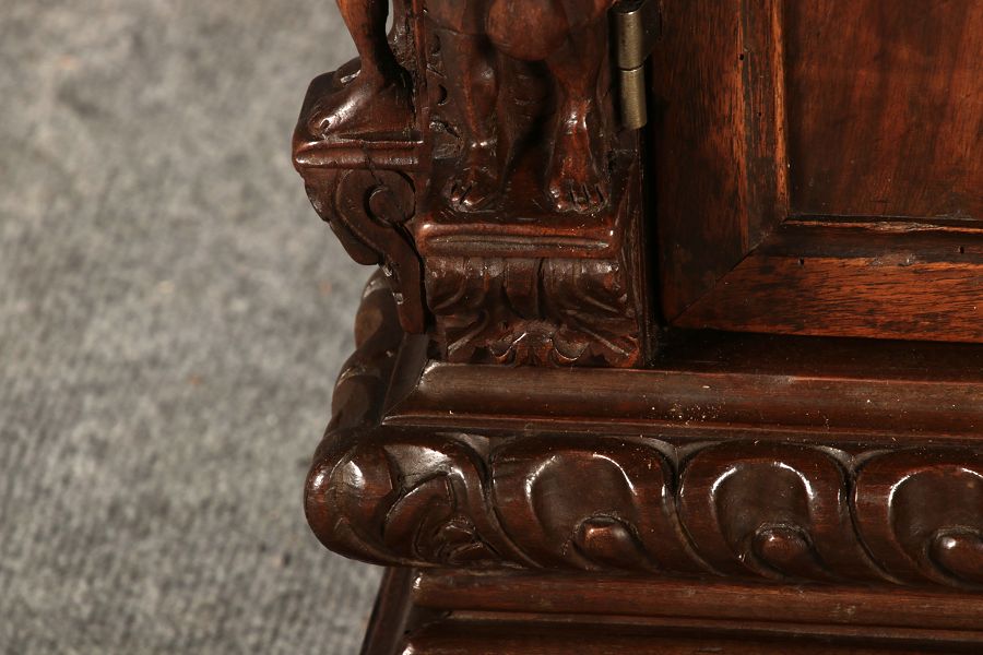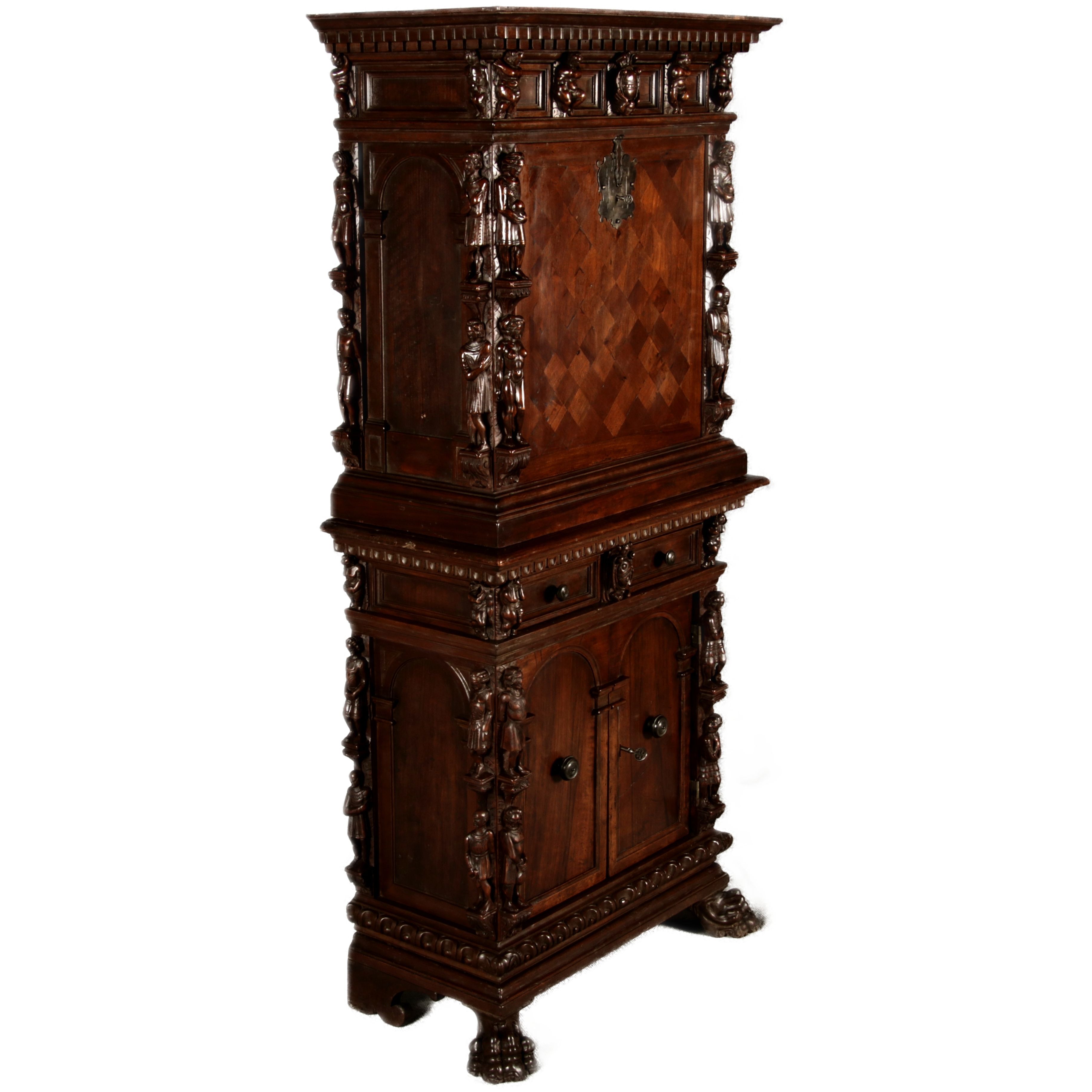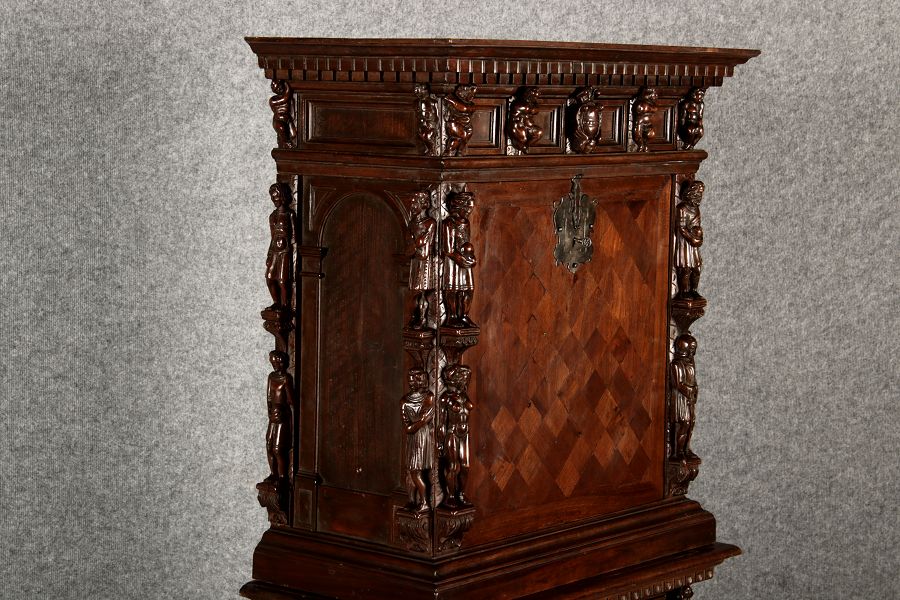 Kleiner Antiker Renaissance-Sekretär, Nussbaum, 17.-19. Jahrhundert Dieser kleine dennoch imposante Renaissance-Sekretär aus Nussbaumholz stammt aus der Zeit zwischen dem 17. und 19. (Teile des Sekretärs lassen darauf schließen, das er im 19 Jh. gefertigt worden ist, eventuell aus alten Teilen.) Jahrhundert und repräsentiert den Stil und die Handwerkskunst der Renaissance-Epoche. Das Möbelstück beeindruckt durch seine aufwendigen Schnitzereien, die kunstvolle Gestaltung und die kraftvolle Präsenz. Dieser Renaissance-Sekretär ist ein beeindruckendes Kunstwerk, das sowohl dekorativ als auch funktional ist. Seine massive Bauweise, gepaart mit der kunstvollen Gestaltung, macht ihn zu einem wahren Prunkstück für jeden Liebhaber historischer Möbel. Der Sekretär bietet nicht nur großzügigen Stauraum, sondern ist auch ein Zeugnis der meisterhaften Handwerkskunst vergangener Jahre. |