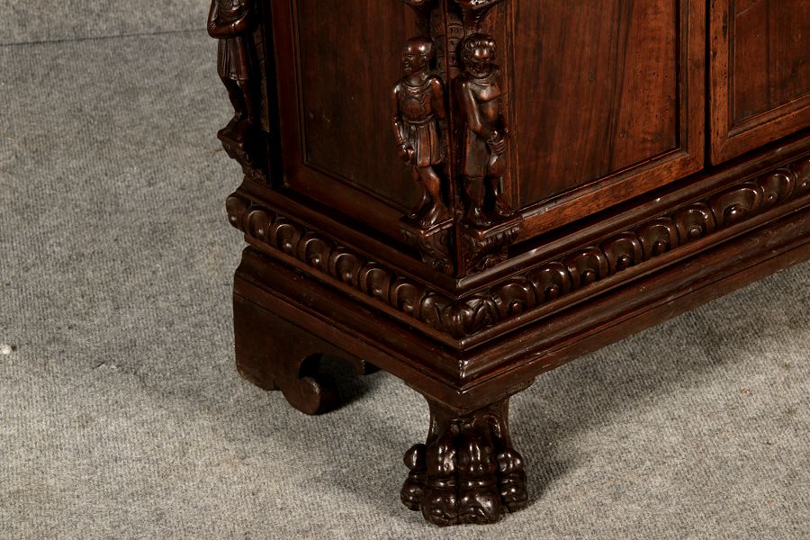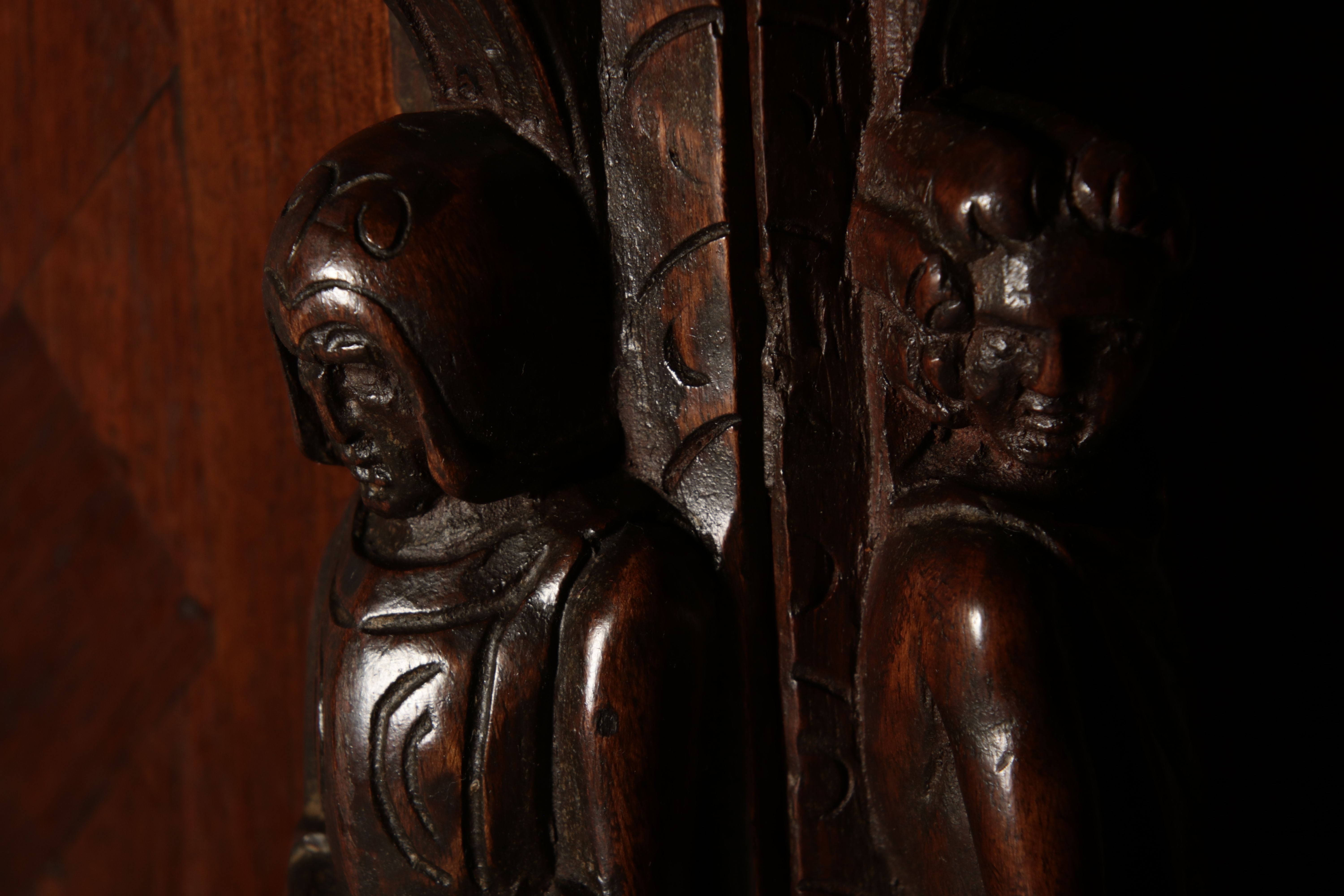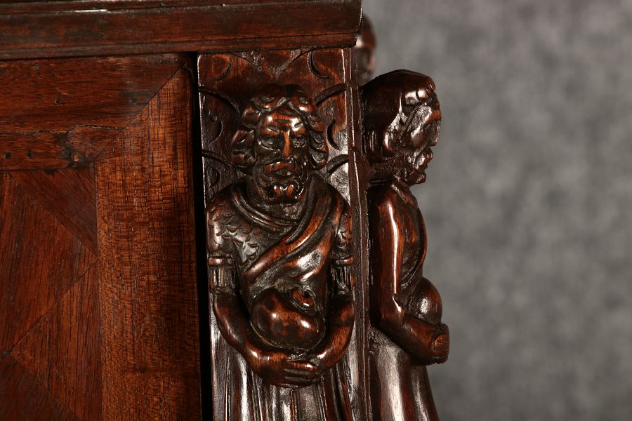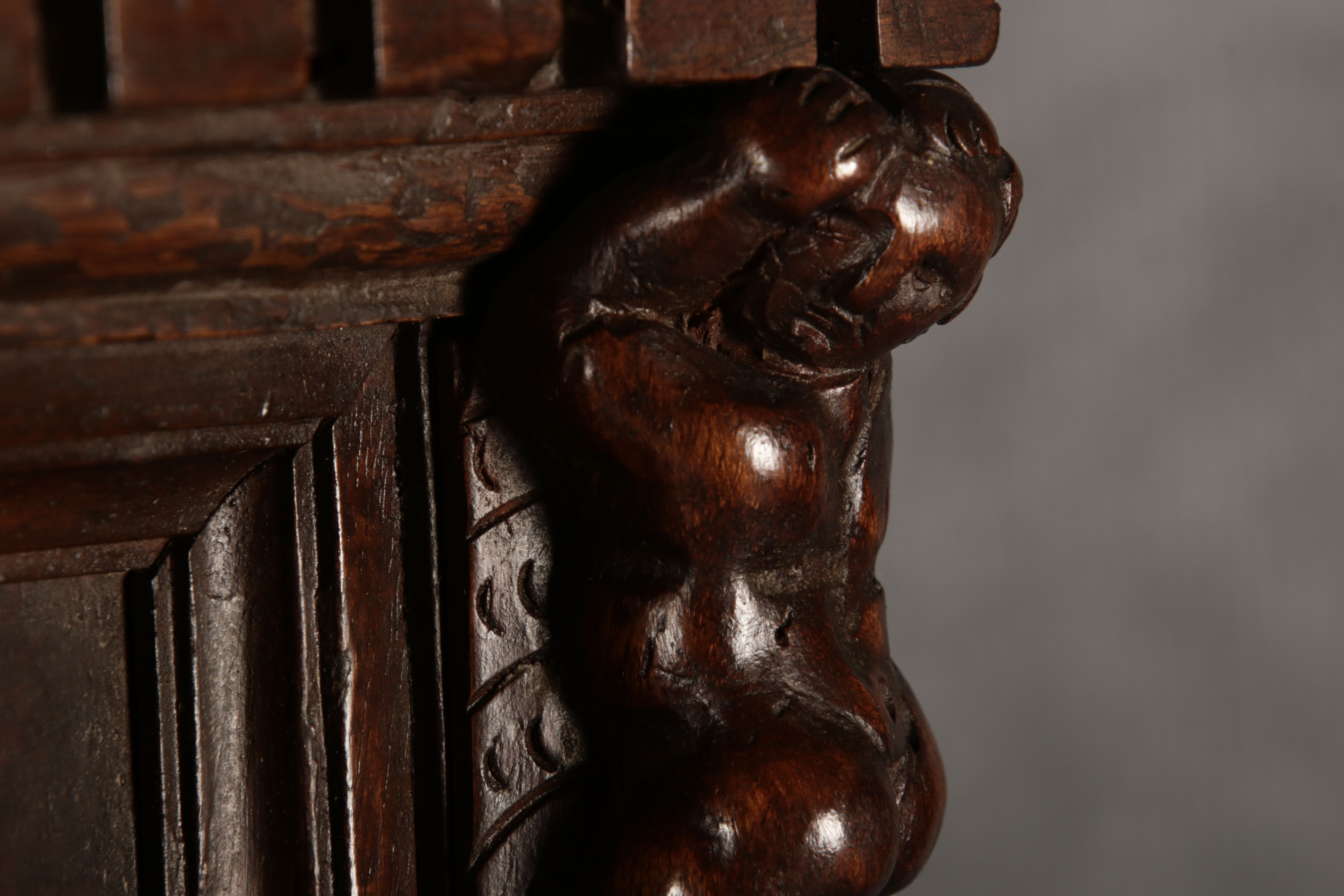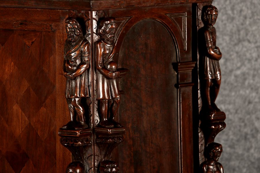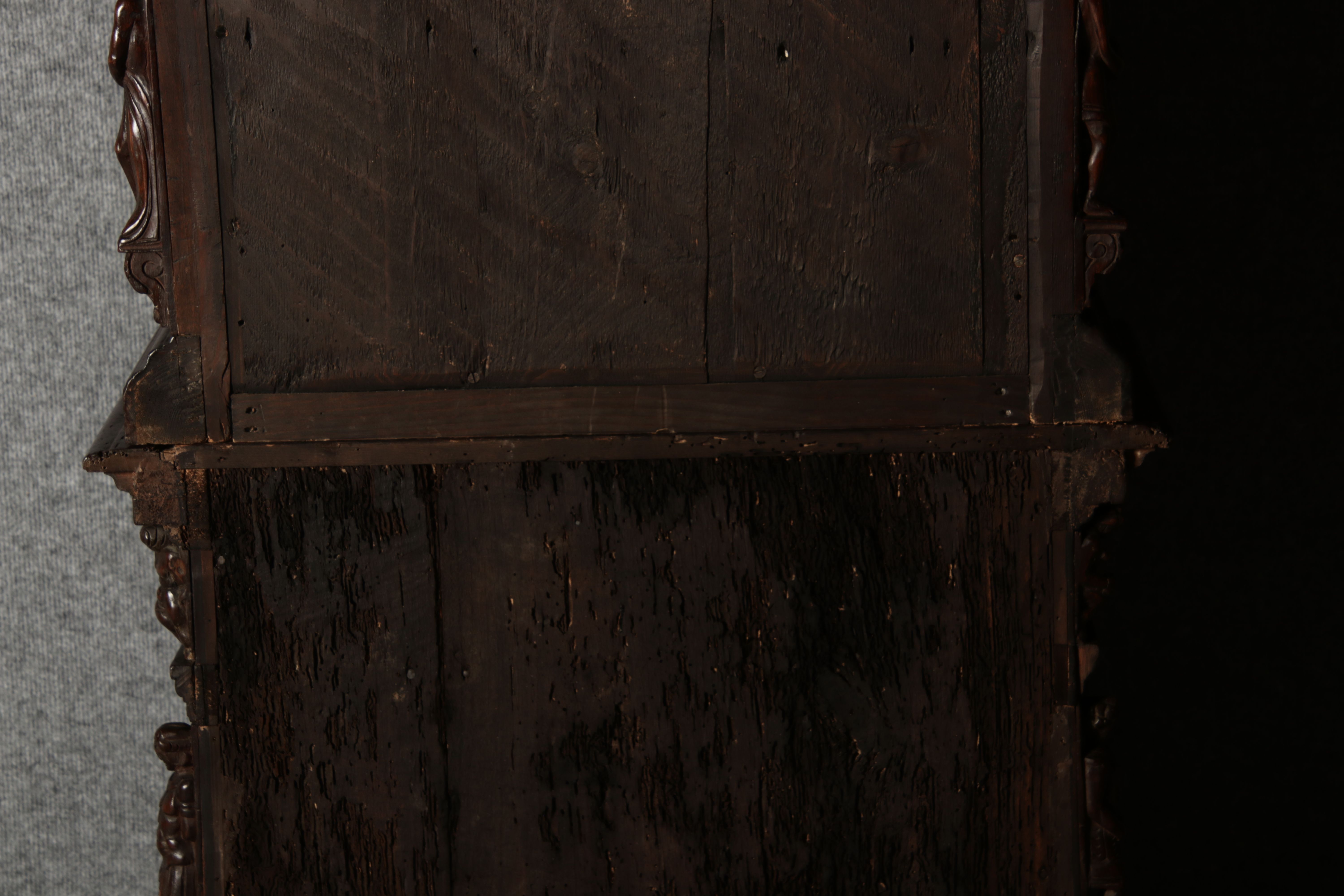Kleiner Antiker Renaissance-Sekretär, Nussbaum, 17.-19. Jahrhundert Dieser kleine dennoch imposante Renaissance-Sekretär aus Nussbaumholz stammt aus der Zeit zwischen dem 17. und 19. (Teile des Sekretärs lassen darauf schließen, das er im 19 Jh. gefertigt worden ist, eventuell aus alten Teilen.) Jahrhundert und repräsentiert den Stil und die Handwerkskunst der Renaissance-Epoche. Das Möbelstück beeindruckt durch seine aufwendigen Schnitzereien, die kunstvolle Gestaltung und die kraftvolle Präsenz. Dieser Renaissance-Sekretär ist ein beeindruckendes Kunstwerk, das sowohl dekorativ als auch funktional ist. Seine massive Bauweise, gepaart mit der kunstvollen Gestaltung, macht ihn zu einem wahren Prunkstück für jeden Liebhaber historischer Möbel. Der Sekretär bietet nicht nur großzügigen Stauraum, sondern ist auch ein Zeugnis der meisterhaften Handwerkskunst vergangener Jahre. |