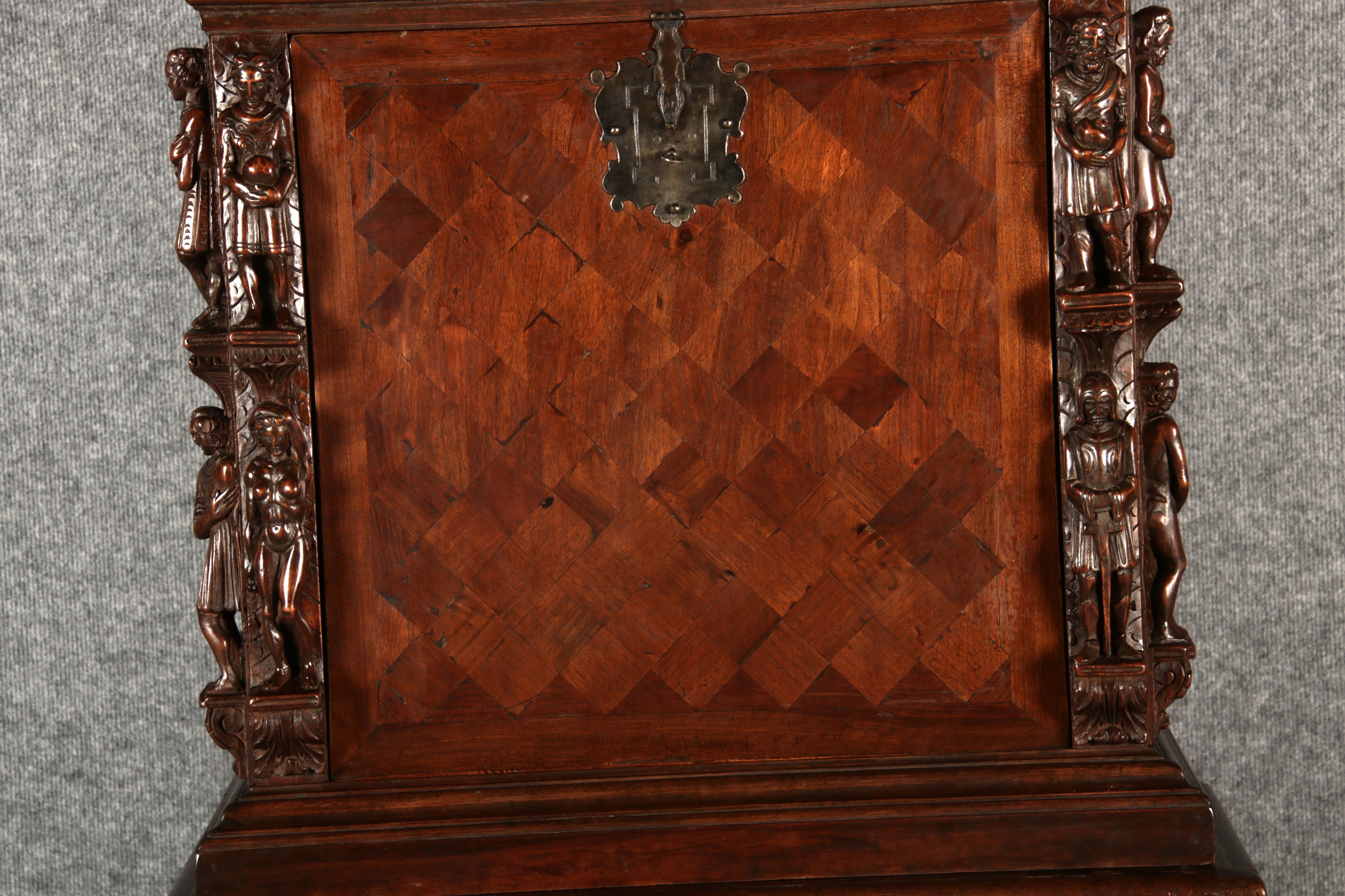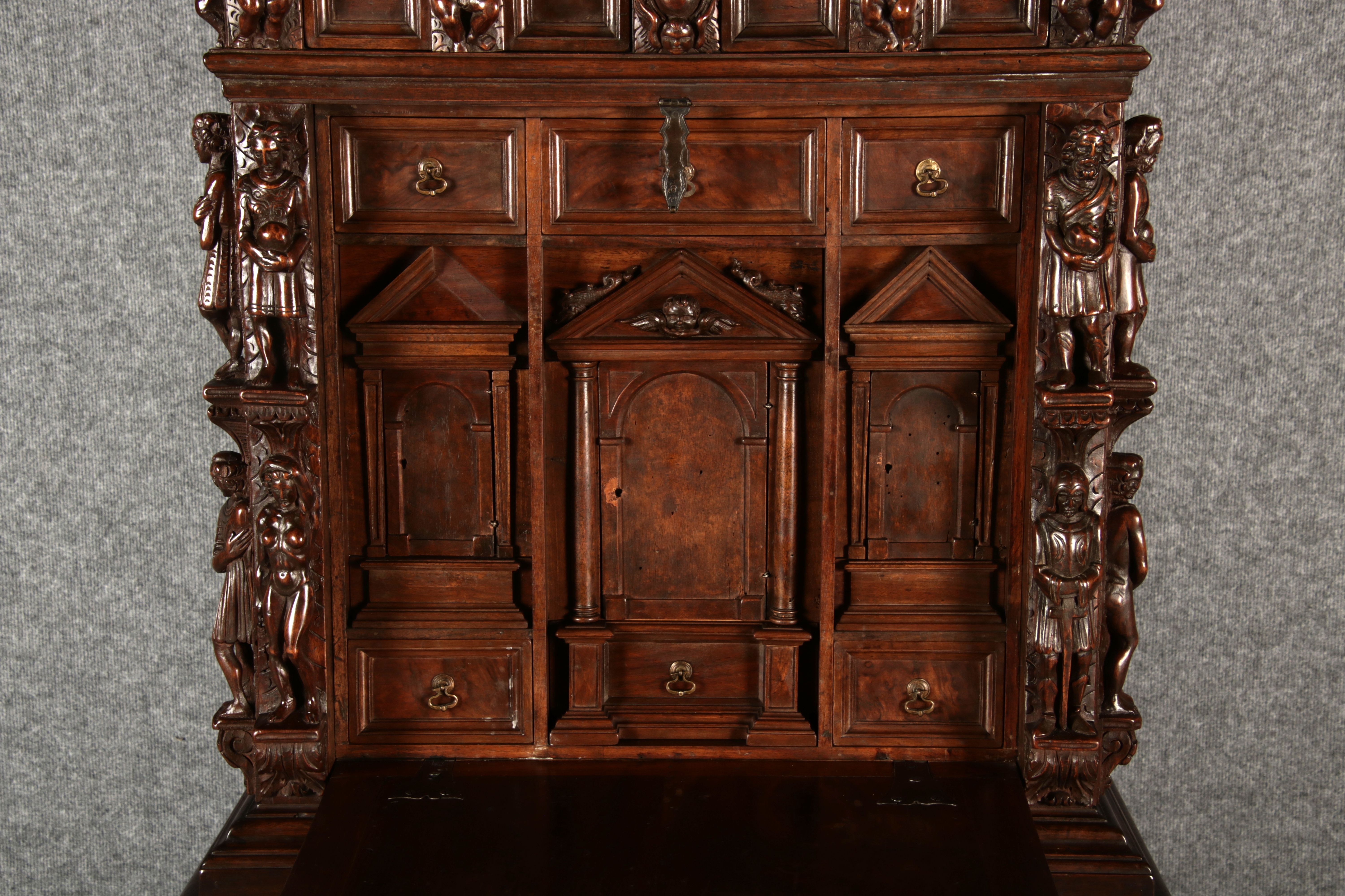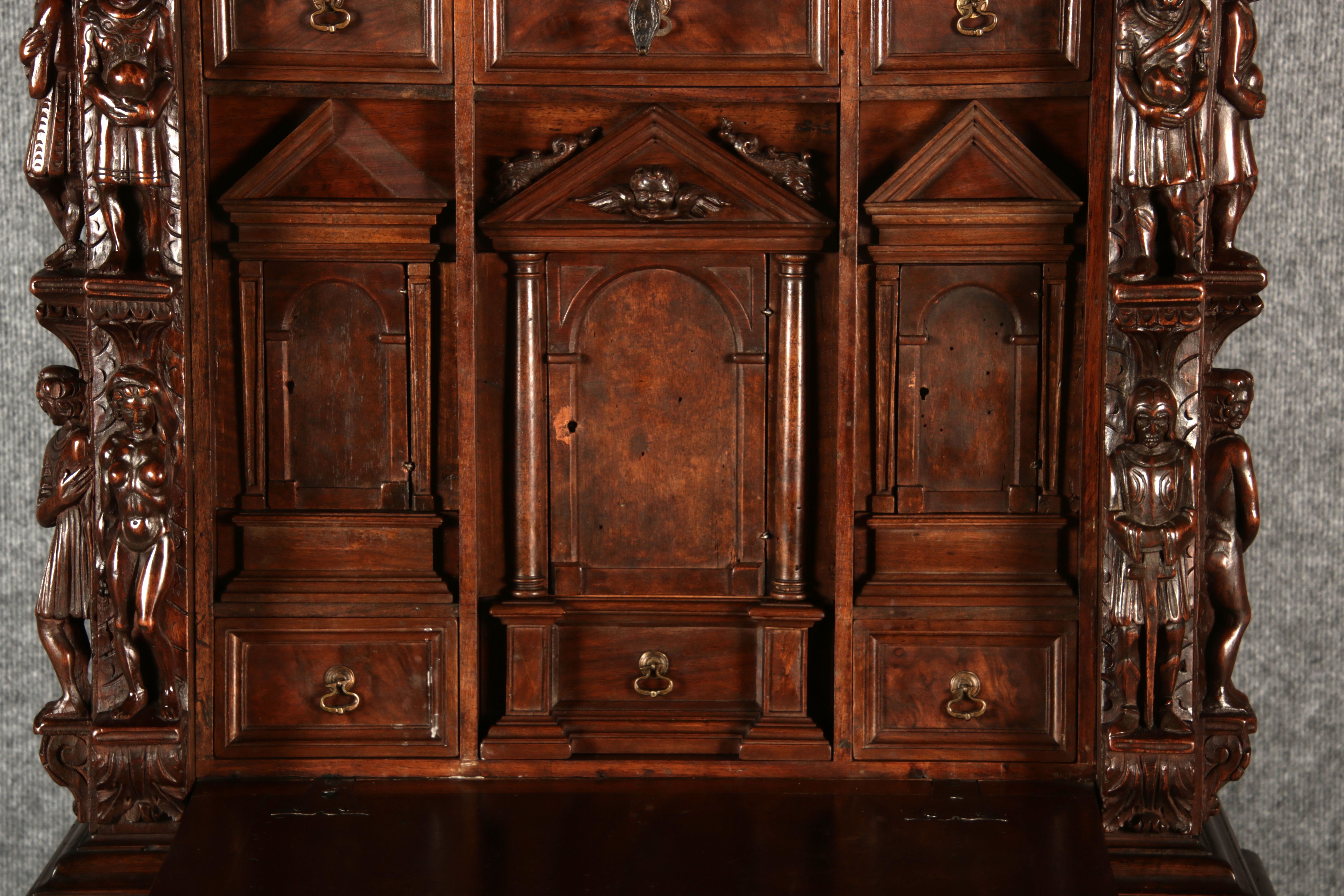 Kleiner Antiker Renaissance-Sekretär, Nussbaum, 17.-19. Jahrhundert Dieser kleine dennoch imposante Renaissance-Sekretär aus Nussbaumholz stammt aus der Zeit zwischen dem 17. und 19. (Teile des Sekretärs lassen darauf schließen, das er im 19 Jh. gefertigt worden ist, eventuell aus alten Teilen.) Jahrhundert und repräsentiert den Stil und die Handwerkskunst der Renaissance-Epoche. Das Möbelstück beeindruckt durch seine aufwendigen Schnitzereien, die kunstvolle Gestaltung und die kraftvolle Präsenz. Dieser Renaissance-Sekretär ist ein beeindruckendes Kunstwerk, das sowohl dekorativ als auch funktional ist. Seine massive Bauweise, gepaart mit der kunstvollen Gestaltung, macht ihn zu einem wahren Prunkstück für jeden Liebhaber historischer Möbel. Der Sekretär bietet nicht nur großzügigen Stauraum, sondern ist auch ein Zeugnis der meisterhaften Handwerkskunst vergangener Jahre. ArtikelNummer /number: sek119