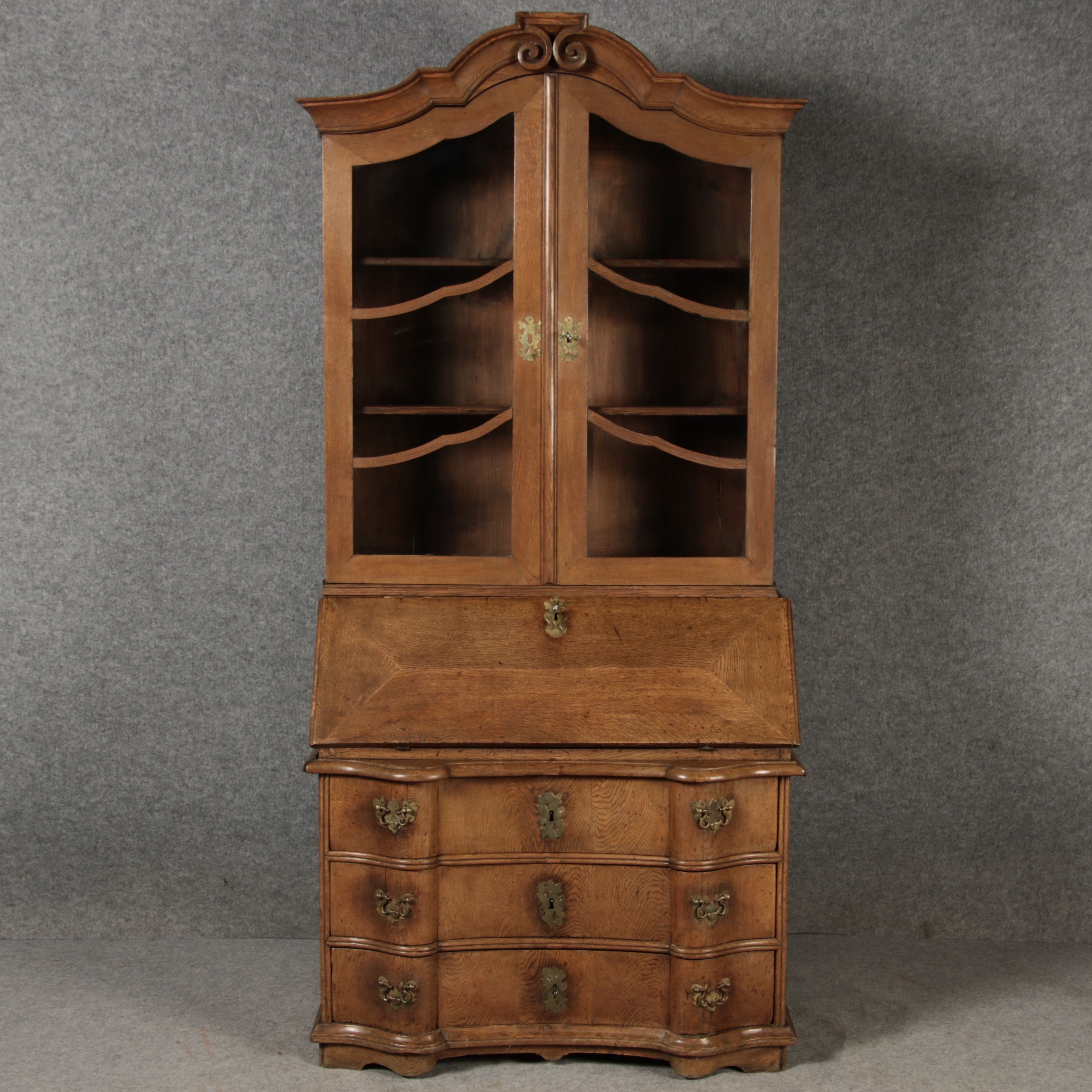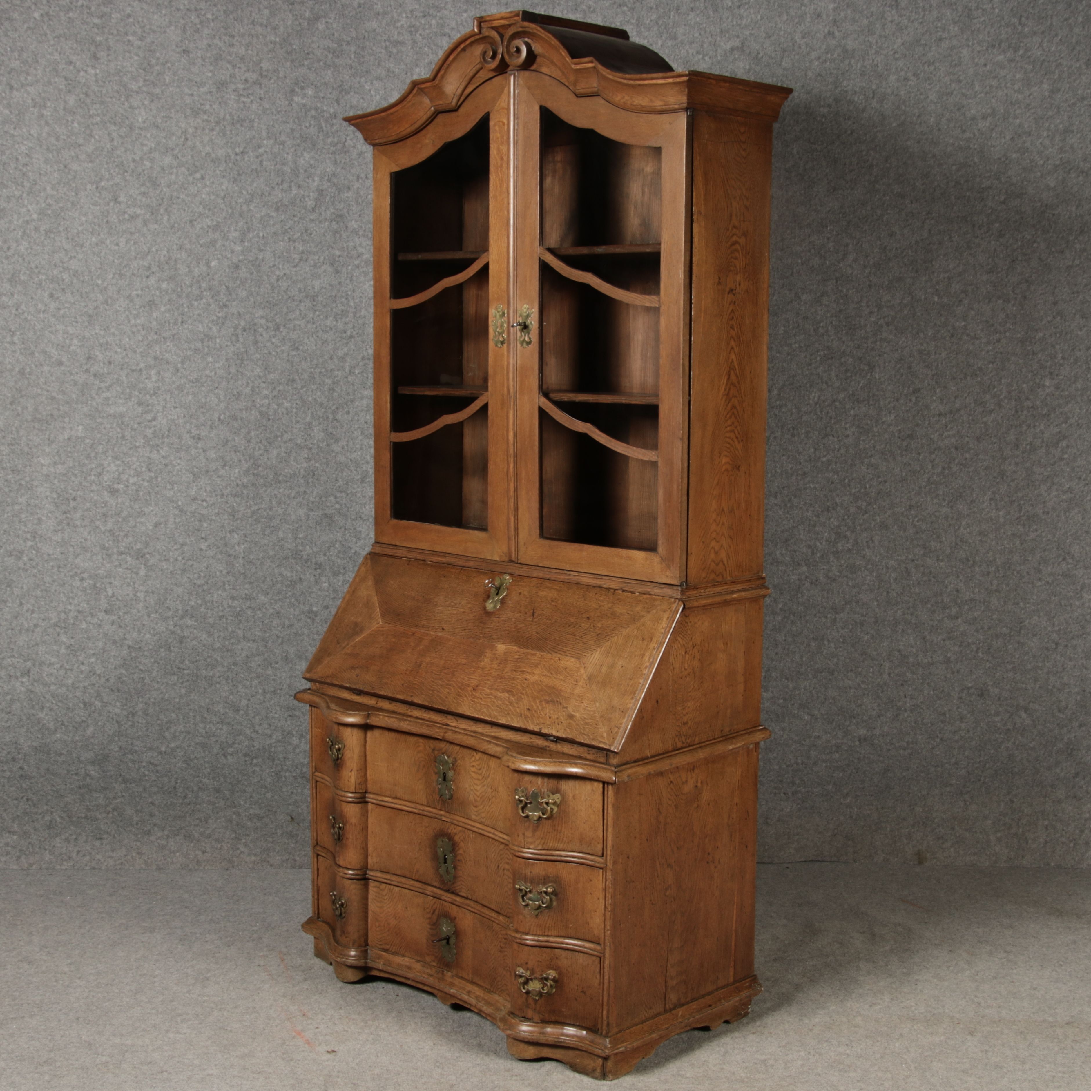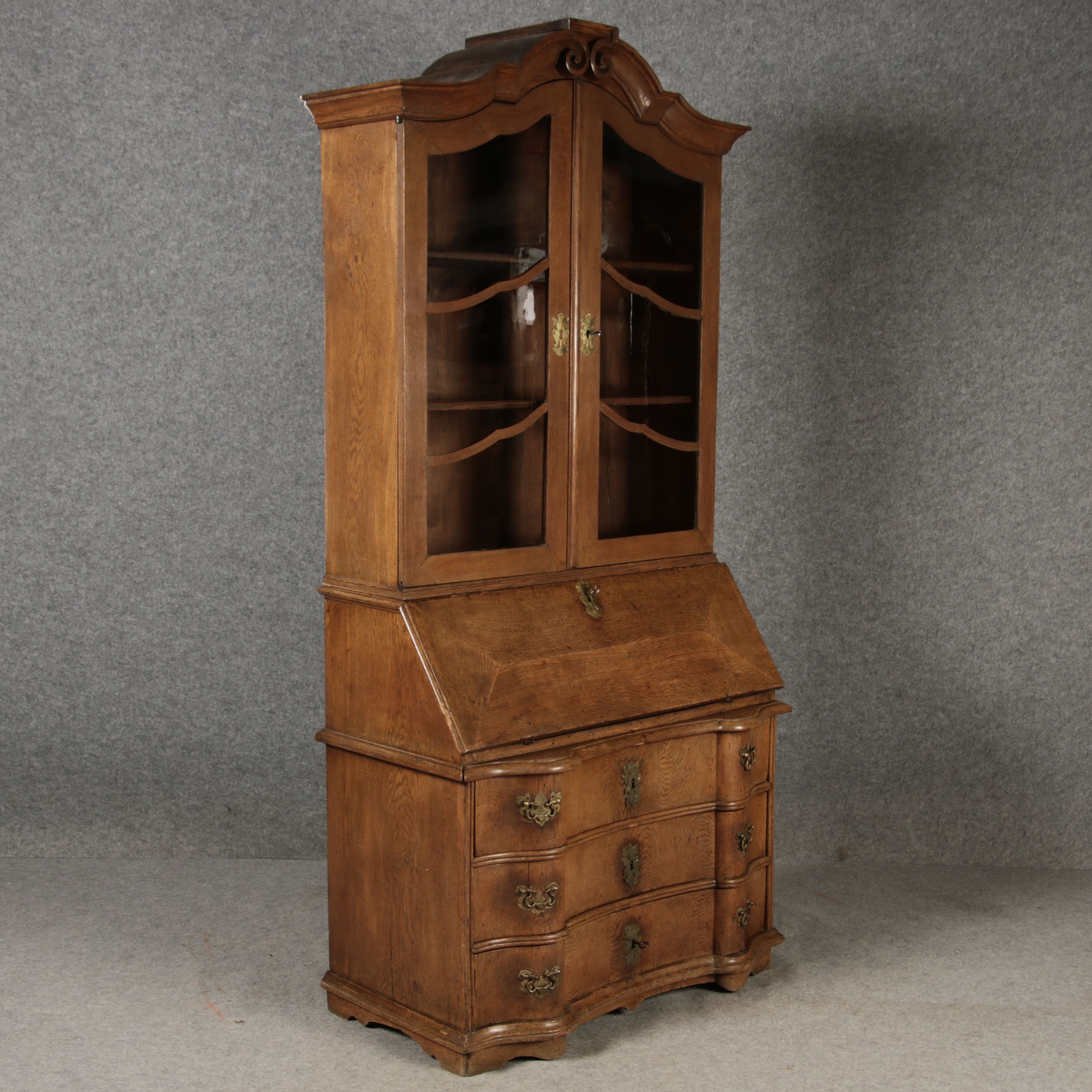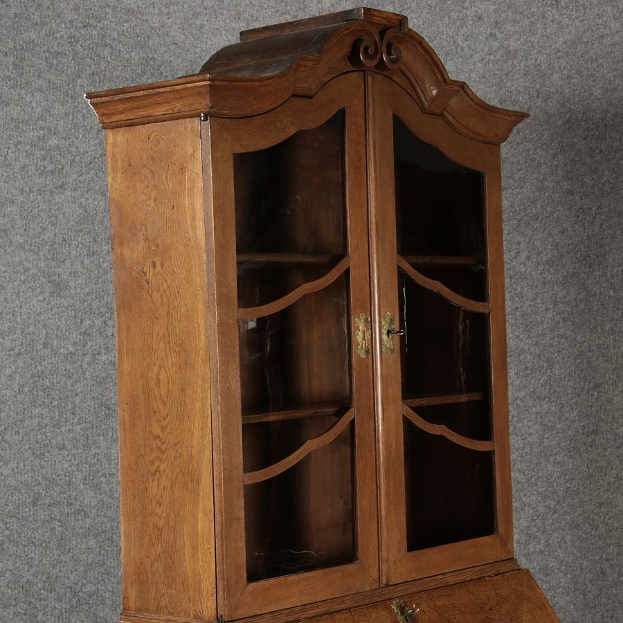 Antiker Spätbarock Sekretär Eichenholz 18 Jh. mit Vitrinen OberteilDieser Sekretär im Stil des Spätbarock besticht durch seine elegante antike Formgebung und die Verwendung von massivem Eichenholz. Das Stück vereint kunstvolle Schnitzereien und praktische Funktionalität, typisch für Möbel aus der Mitte des 18. Jahrhunderts. Seine geschwungenen Linien und die harmonische Gestaltung der Oberflächen machen ihn zu einem edlen Möbelstück, das in jeder Einrichtung einen besonderen Platz finden wird. Material und VerarbeitungGefertigt aus massivem und furnierten Eichenholz, überzeugt dieser Sekretär durch seine charakteristische, natürliche Holzmaserung. Das Eichenholz hat über die Jahre eine ansprechende Patina entwickelt, die seinen antiken Charme unterstreicht. Die geschwungenen Fronten und Seitenwände spiegeln den Einfluss des Barock breiter, mit weichen Linien und organischen Formen, die dem Möbelstück seine anmutige Präsenz verleihen. Design und AufbauDieser Sekretär kombiniert die Funktionalität eines Schranks mit einem praktischen Schreibbereich: