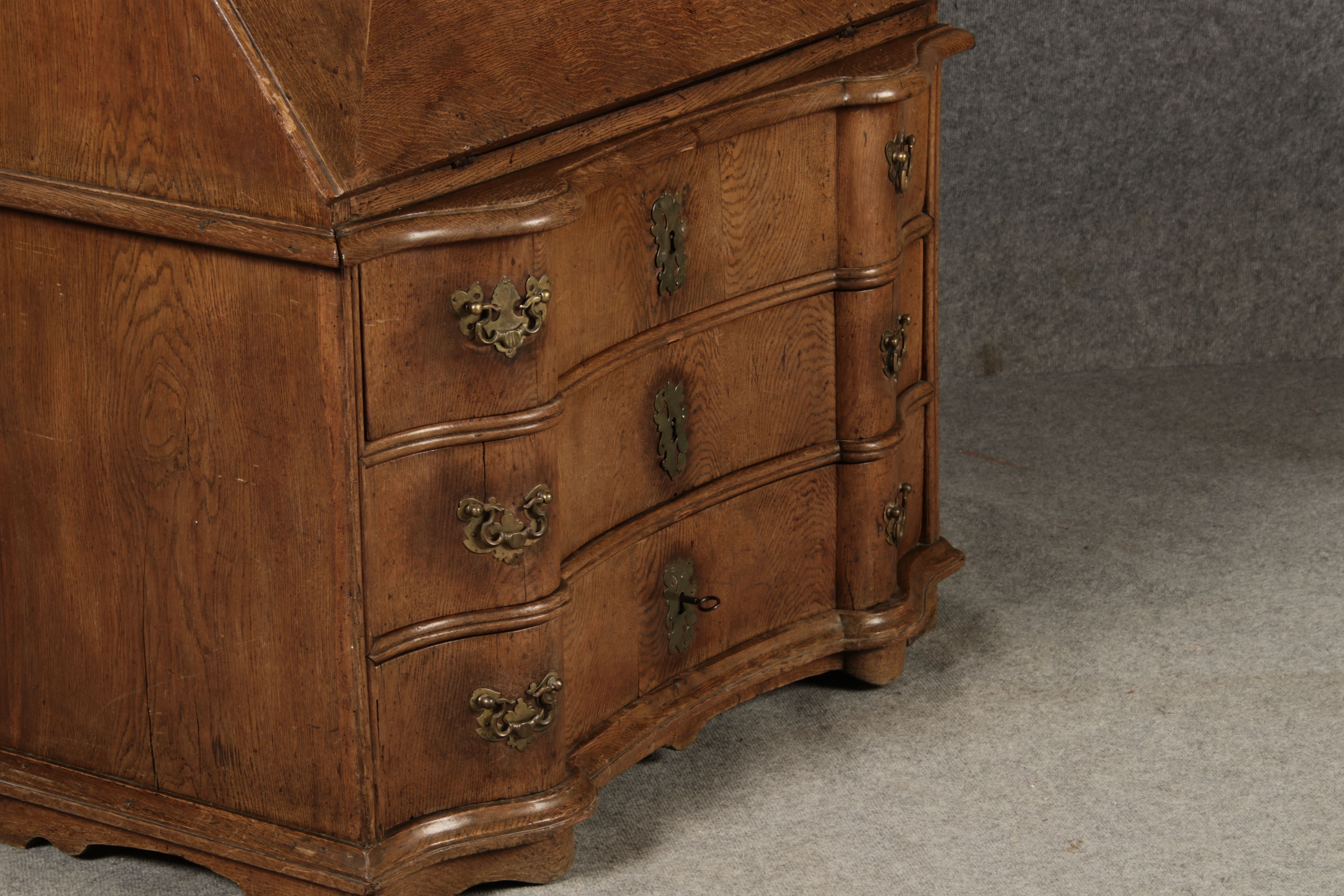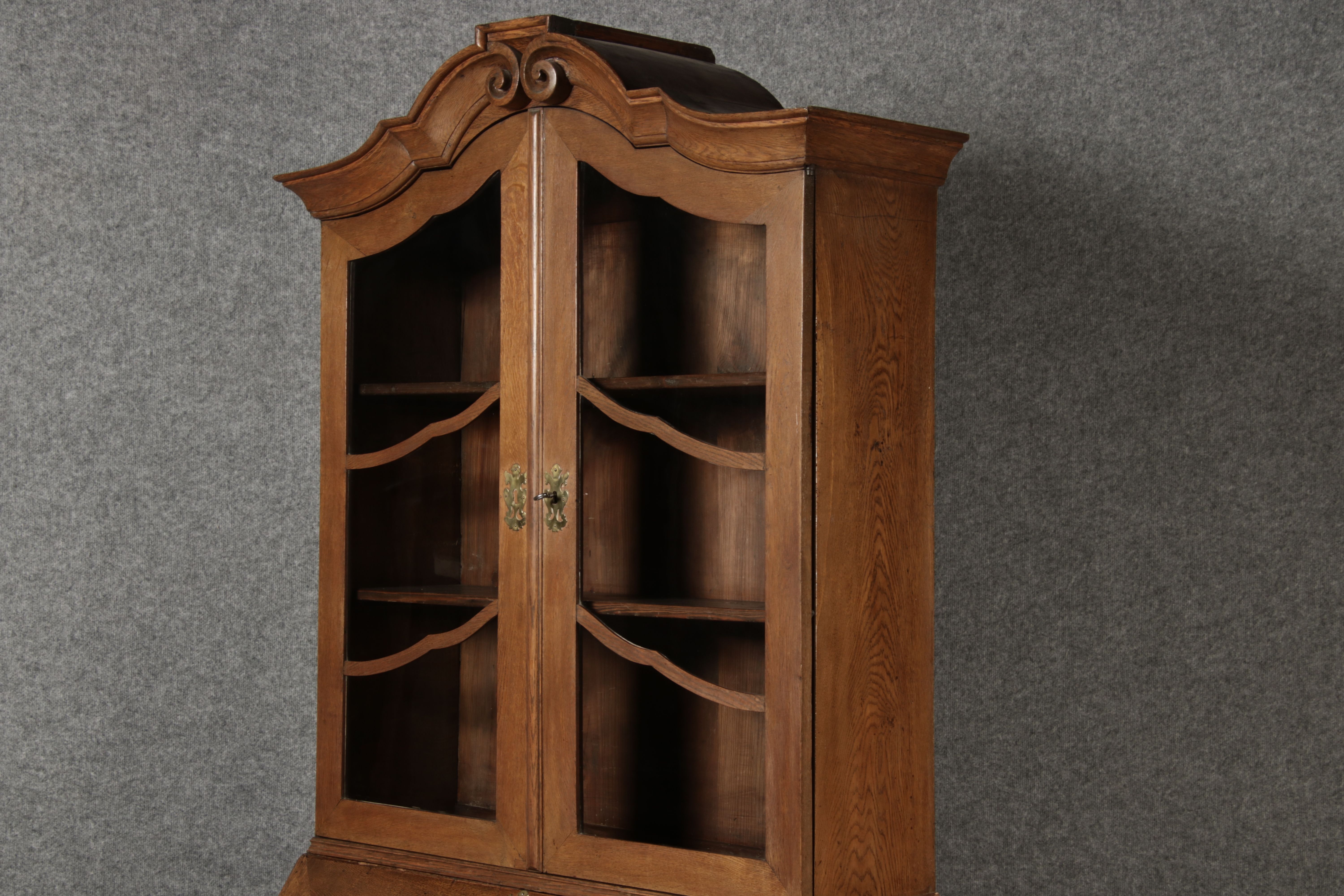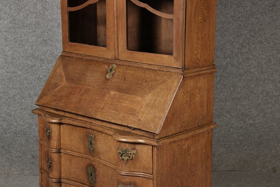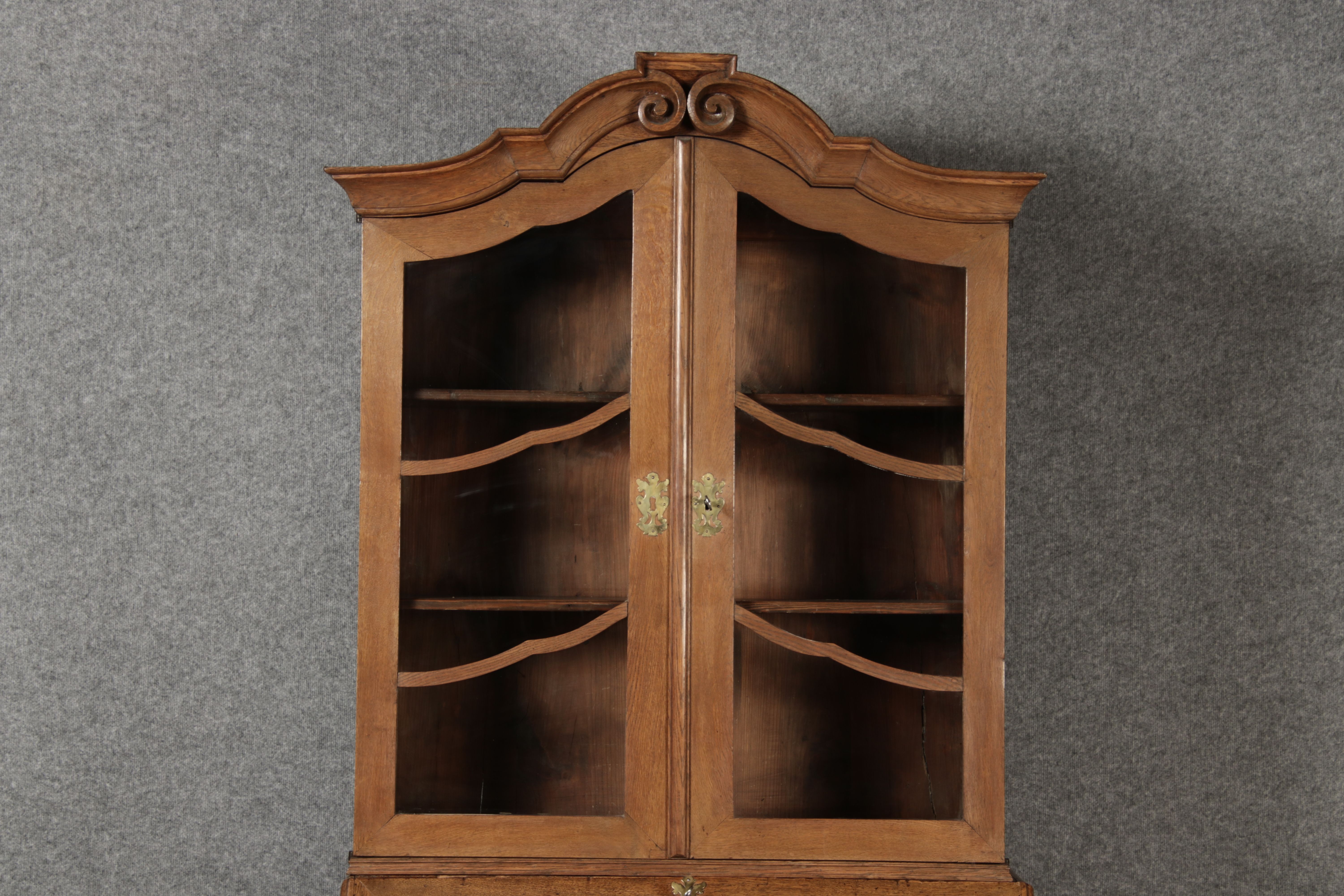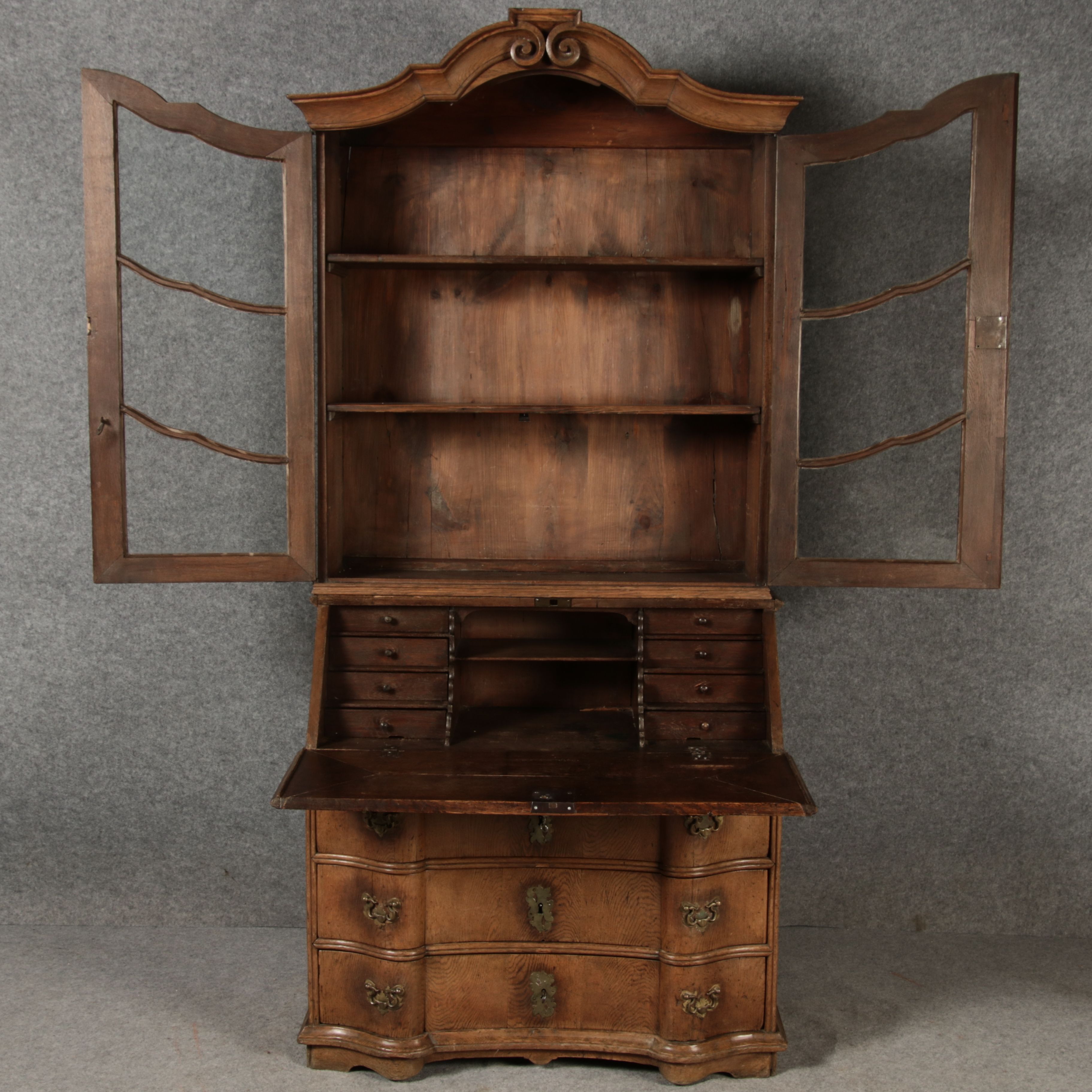 Antiker Spätbarock Sekretär Eichenholz 18 Jh. mit Vitrinen OberteilDieser Sekretär im Stil des Spätbarock besticht durch seine elegante antike Formgebung und die Verwendung von massivem Eichenholz. Das Stück vereint kunstvolle Schnitzereien und praktische Funktionalität, typisch für Möbel aus der Mitte des 18. Jahrhunderts. Seine geschwungenen Linien und die harmonische Gestaltung der Oberflächen machen ihn zu einem edlen Möbelstück, das in jeder Einrichtung einen besonderen Platz finden wird. Material und VerarbeitungGefertigt aus massivem und furnierten Eichenholz, überzeugt dieser Sekretär durch seine charakteristische, natürliche Holzmaserung. Das Eichenholz hat über die Jahre eine ansprechende Patina entwickelt, die seinen antiken Charme unterstreicht. Die geschwungenen Fronten und Seitenwände spiegeln den Einfluss des Barock breiter, mit weichen Linien und organischen Formen, die dem Möbelstück seine anmutige Präsenz verleihen. Design und AufbauDieser Sekretär kombiniert die Funktionalität eines Schranks mit einem praktischen Schreibbereich: