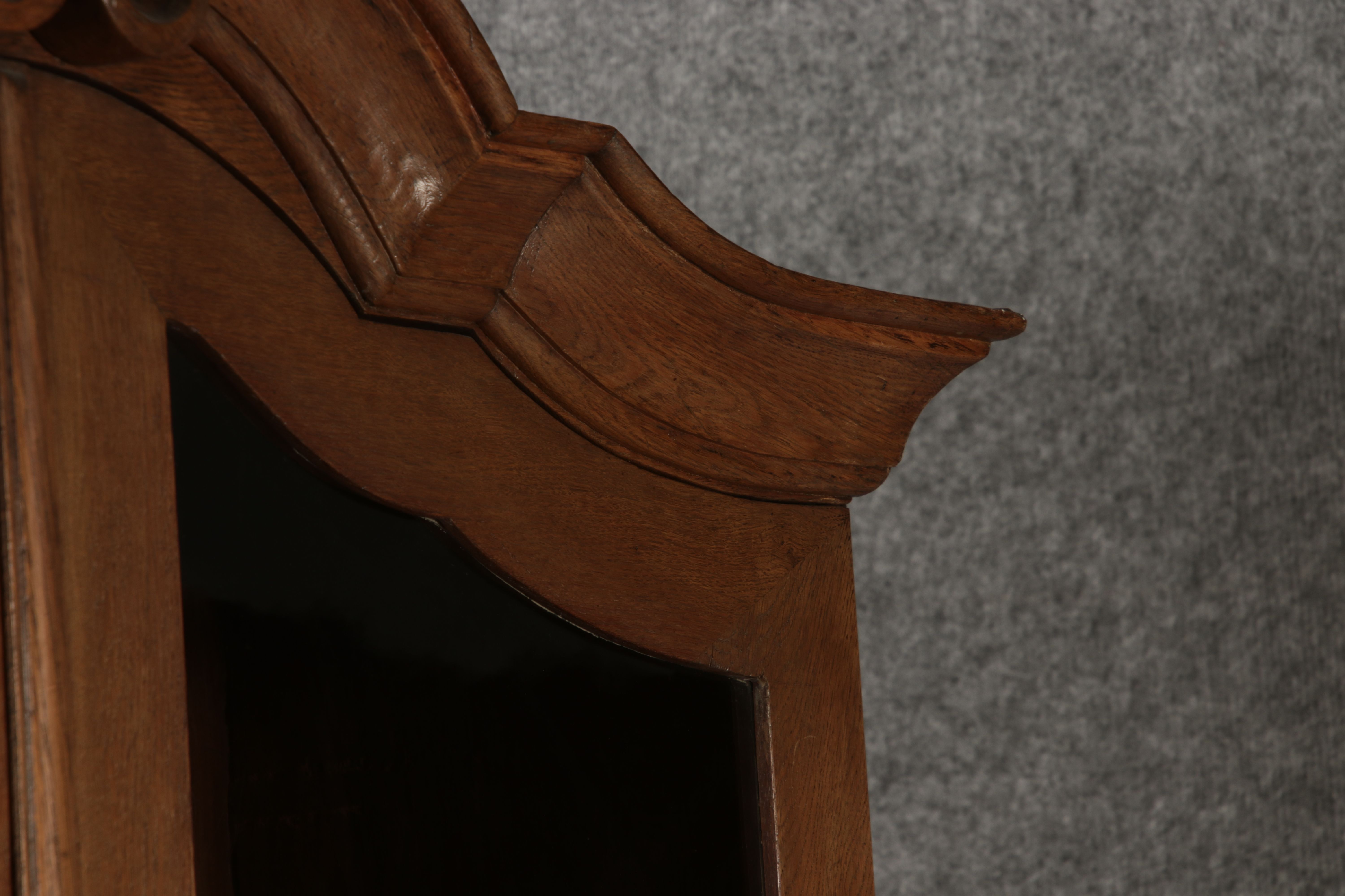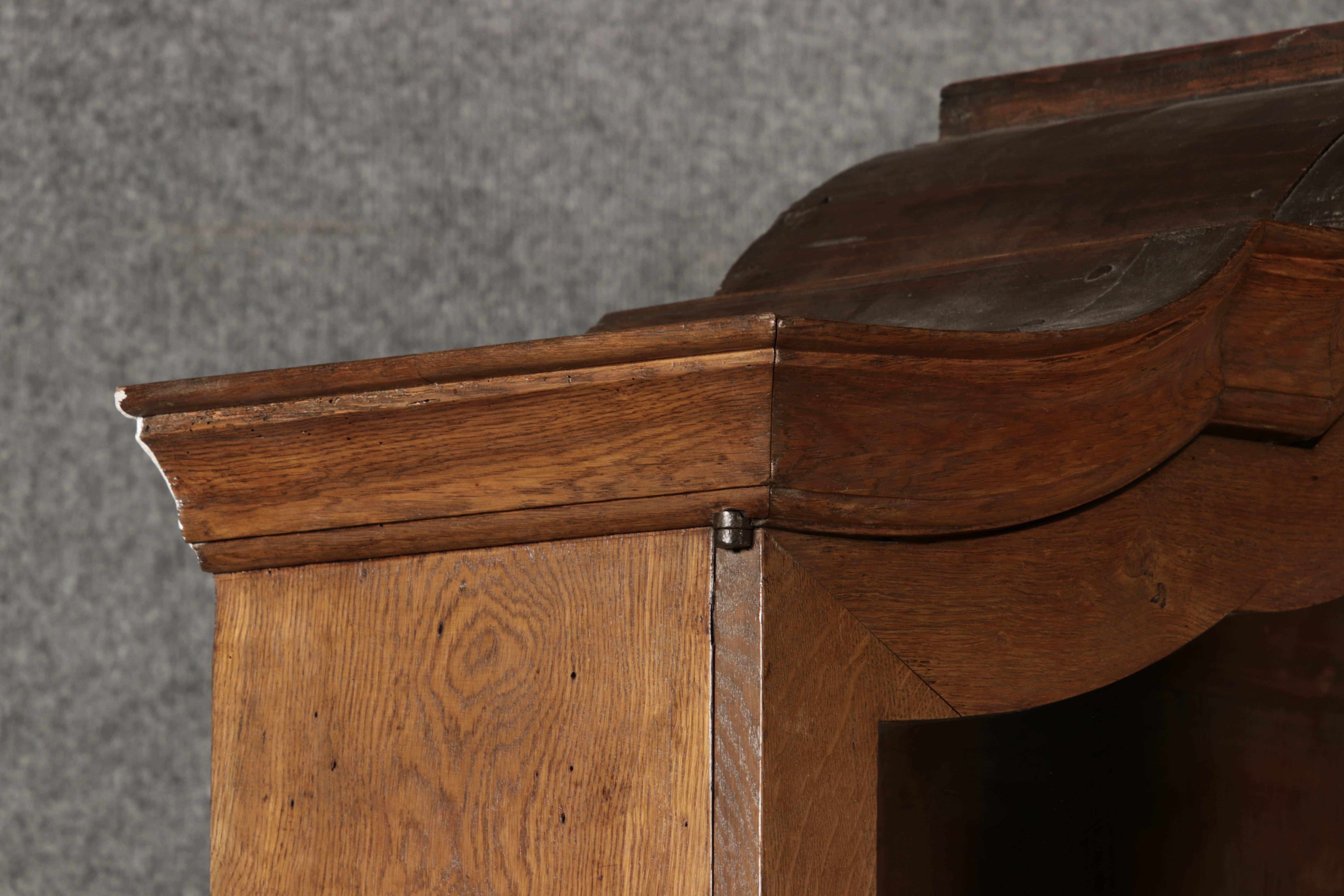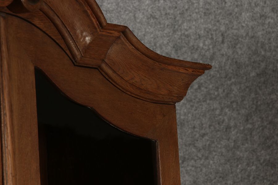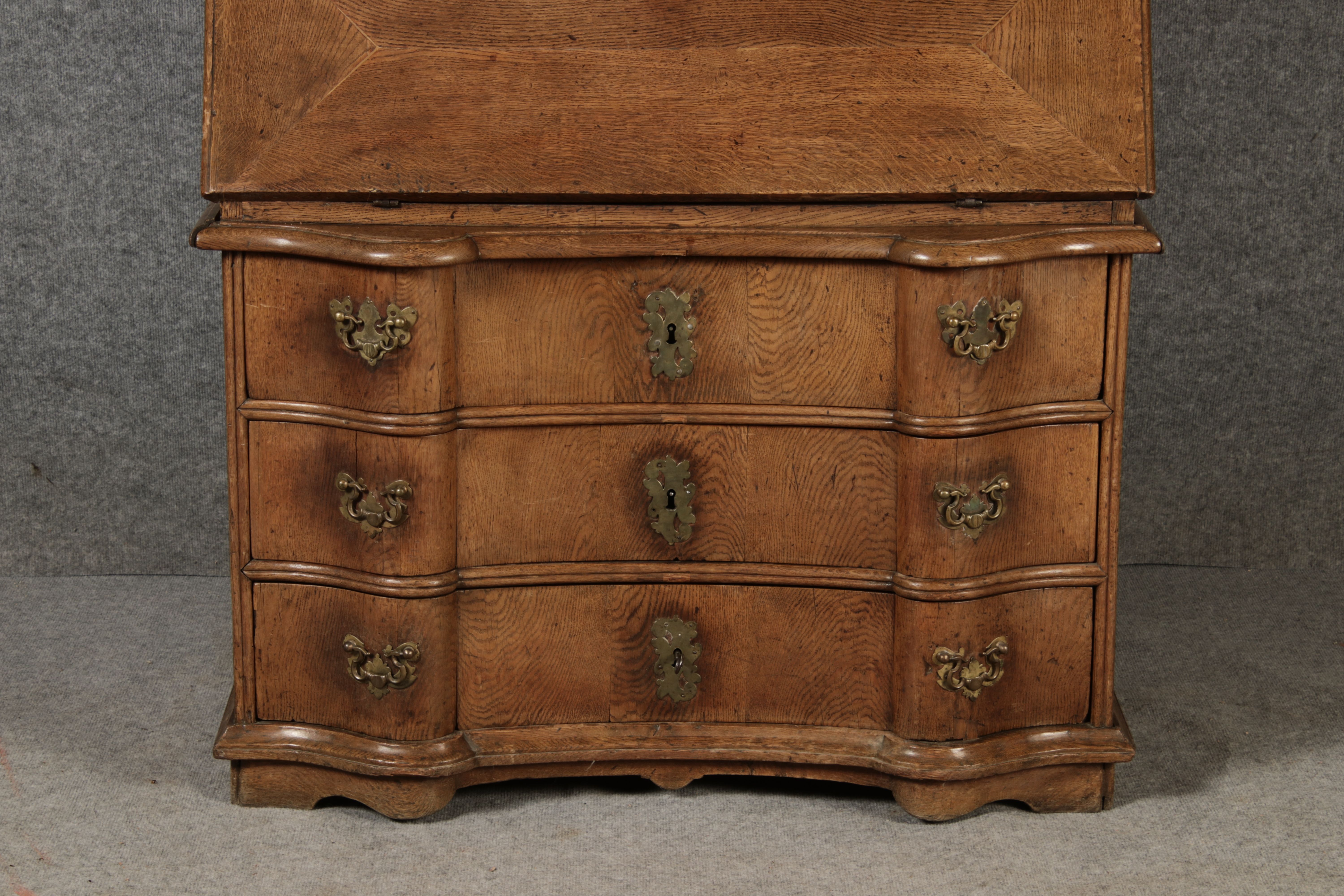 Antiker Spätbarock Sekretär Eichenholz 18 Jh. mit Vitrinen OberteilDieser Sekretär im Stil des Spätbarock besticht durch seine elegante antike Formgebung und die Verwendung von massivem Eichenholz. Das Stück vereint kunstvolle Schnitzereien und praktische Funktionalität, typisch für Möbel aus der Mitte des 18. Jahrhunderts. Seine geschwungenen Linien und die harmonische Gestaltung der Oberflächen machen ihn zu einem edlen Möbelstück, das in jeder Einrichtung einen besonderen Platz finden wird. Material und VerarbeitungGefertigt aus massivem und furnierten Eichenholz, überzeugt dieser Sekretär durch seine charakteristische, natürliche Holzmaserung. Das Eichenholz hat über die Jahre eine ansprechende Patina entwickelt, die seinen antiken Charme unterstreicht. Die geschwungenen Fronten und Seitenwände spiegeln den Einfluss des Barock breiter, mit weichen Linien und organischen Formen, die dem Möbelstück seine anmutige Präsenz verleihen. Design und AufbauDieser Sekretär kombiniert die Funktionalität eines Schranks mit einem praktischen Schreibbereich: