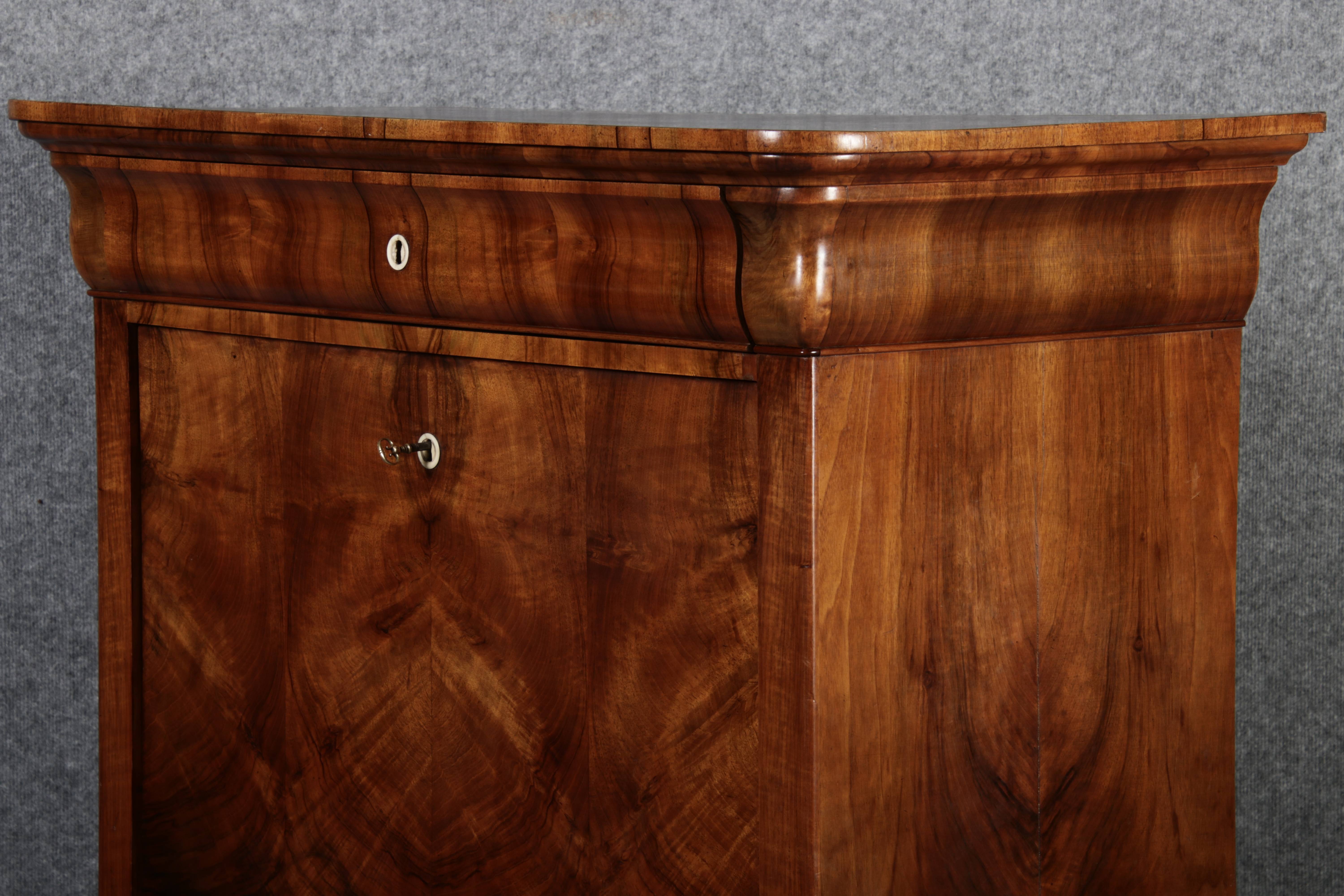 Beschreibung/description: Dieser elegante Sekretär stammt aus der Louis-Philippe-Epoche (ca. 1830–1860) und besticht durch seine edle Nussbaumholz-Oberfläche mit aufwendig gespiegelt furnierten Flächen. Das Möbel vereint Funktionalität mit klassischer Ästhetik und repräsentiert den Stil dieser Zeit durch seine harmonischen Proportionen und warmen Holztöne. Beschreibung: