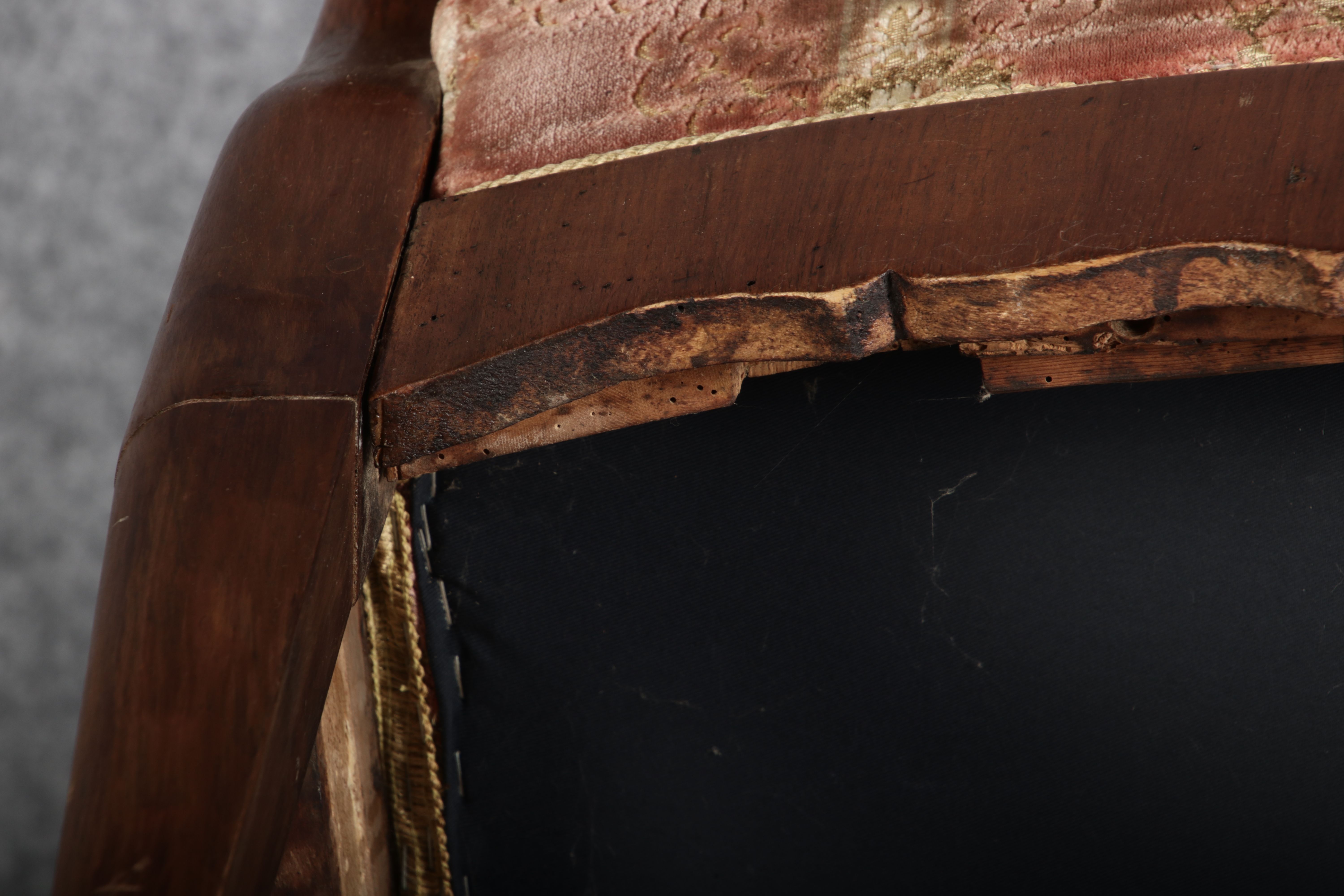 Zustand/condition: Mit Gebrauchsspuren, alt restauriert siehe Bilder. Die Polsterung ist gut und das Polster hat leichte gebrauchsspurenfest. Das Gestell aus massiv und furnierten Nussbaumholz ist stabil und weis leichte Gebrauchsspuren auf.