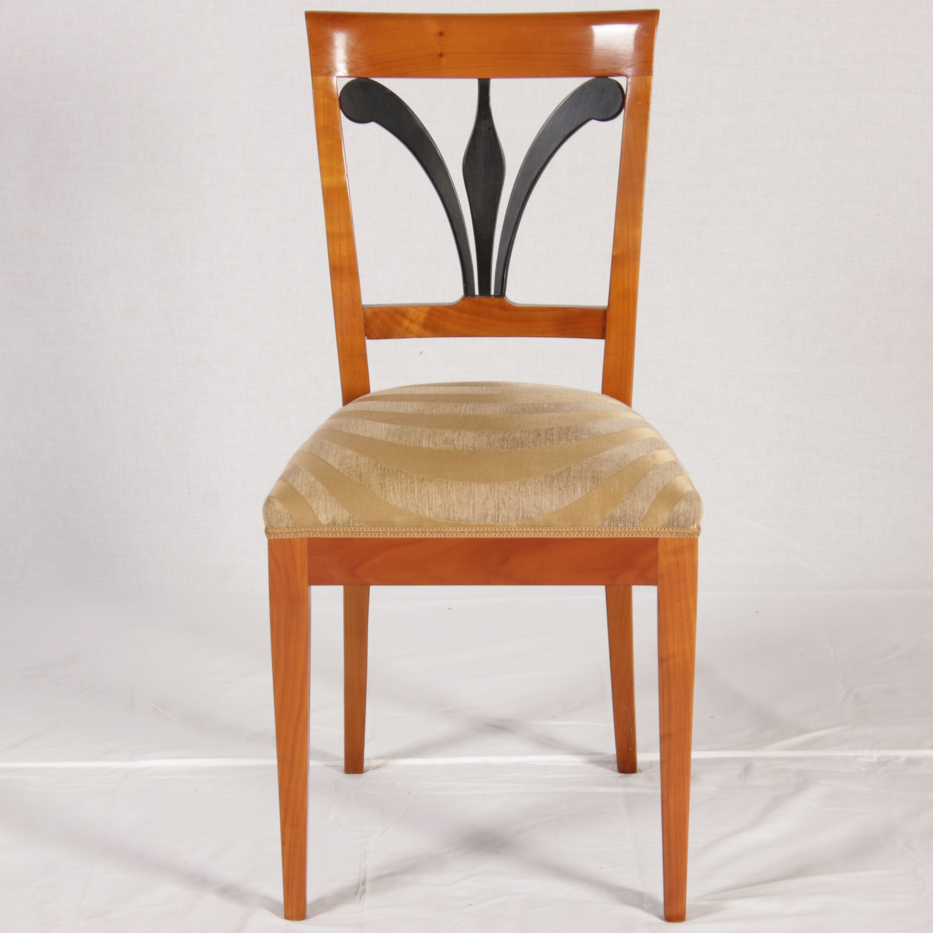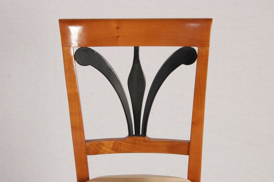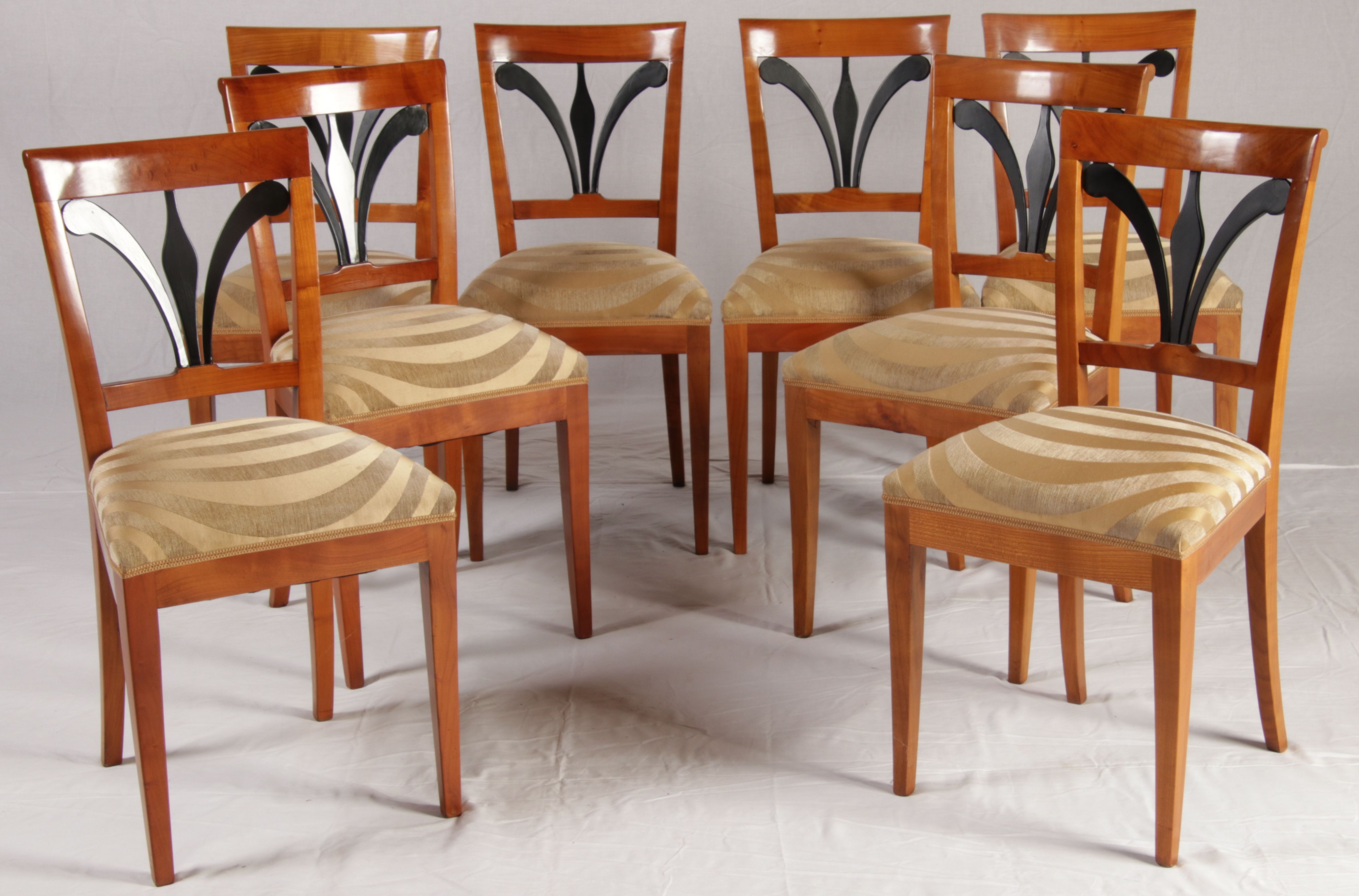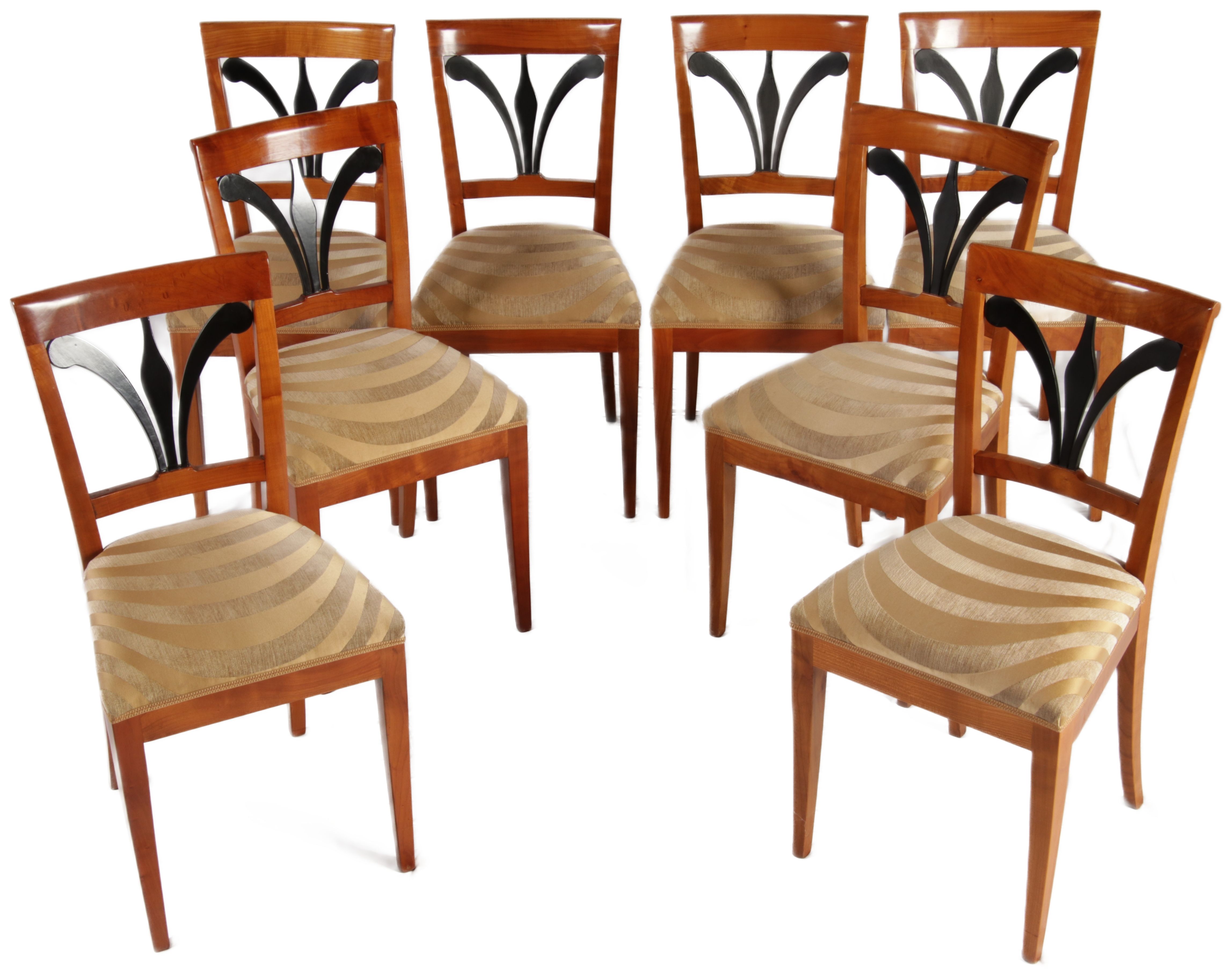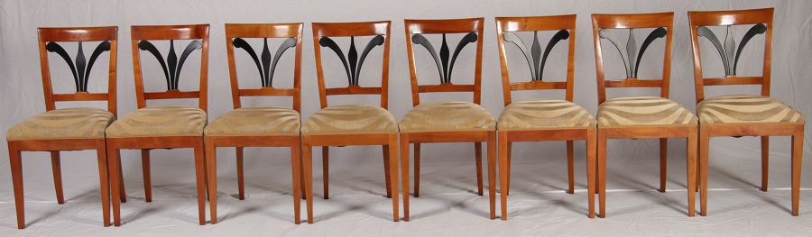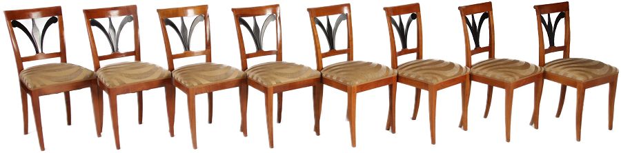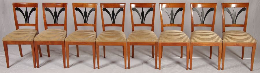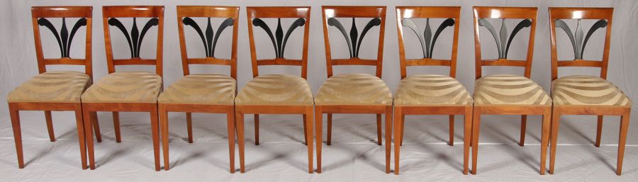 8 Antike Biedermeierstiel Stühle um 1920 Kirschbaum. Der Klassiker unter den Biedermeierstühlen. Die Stühle sind um 1920, aber ursprünglich ist der Stiel der Stühle 100 Jahre früher um 1820. |