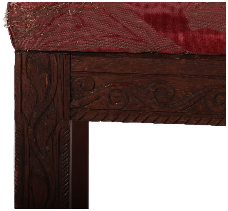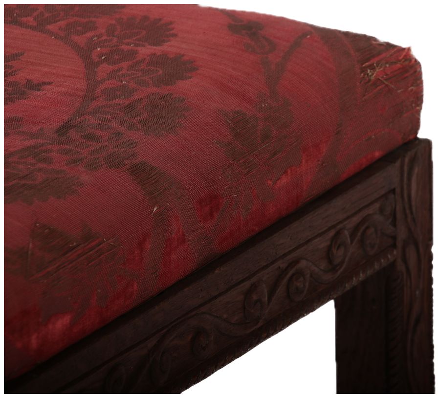 Naturmaterialien (wie Rosshaar, Baumwolle oder Wolle). Die Sitz Qualität ist OK für ein altes Polster, Der Polsterbezug ist verbraucht und könnte einen neuen Bezug gebrauchen, was aber keine große Herausforderung ist, da man das Polster vom Stuhl herausnehmen kann. Die Gestell Oberfläche ist in einem für das Alter in einem guten Zustand, mit Fehlstellen in der Oberfläche. Das Gestell ist fest