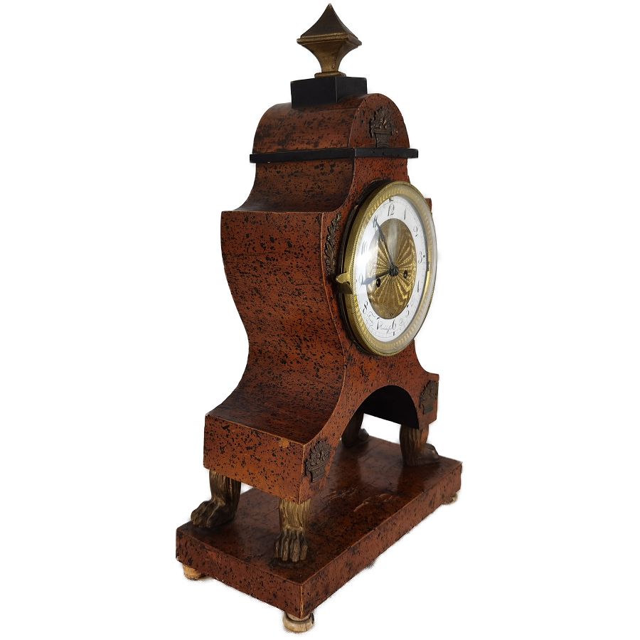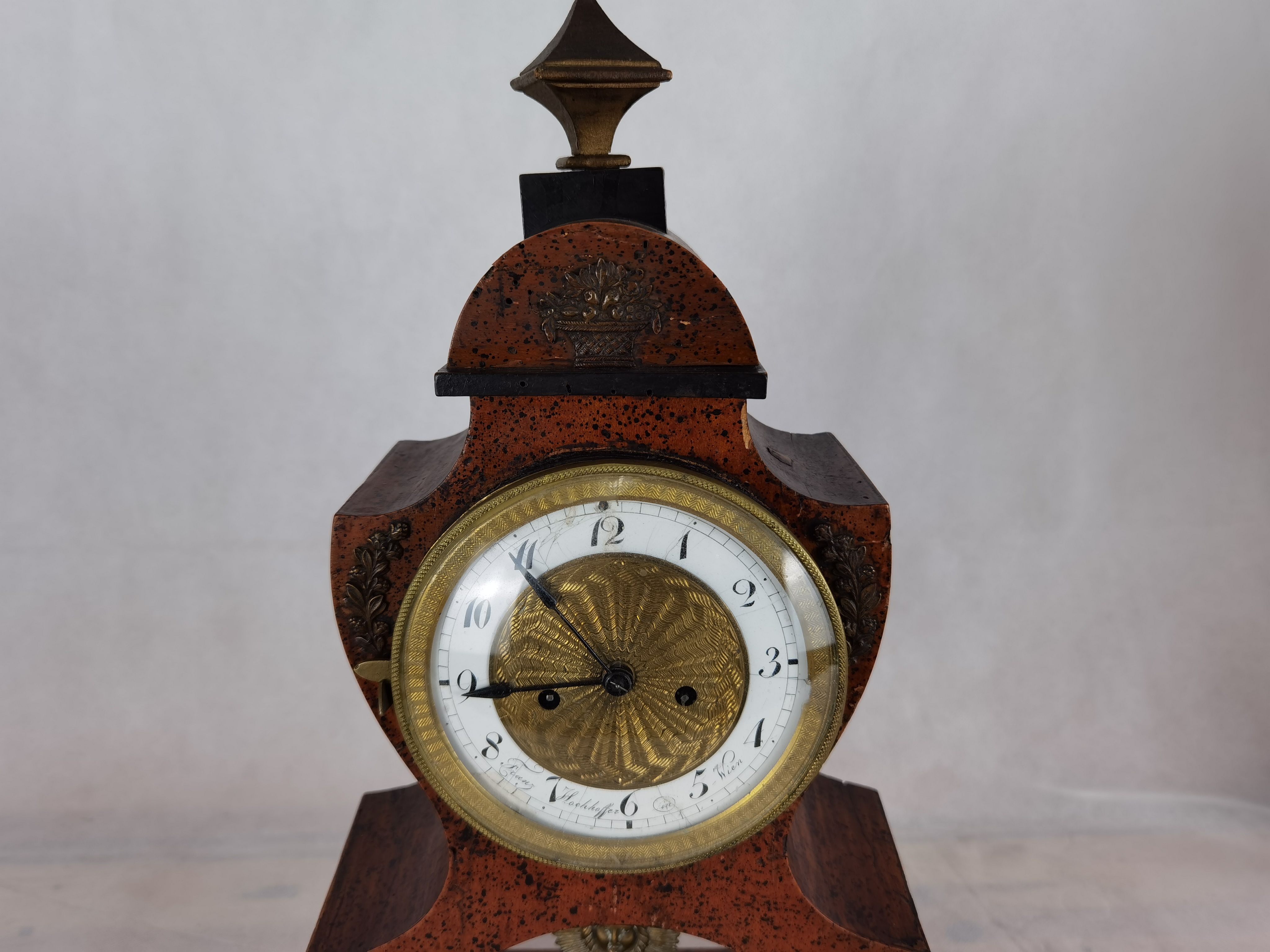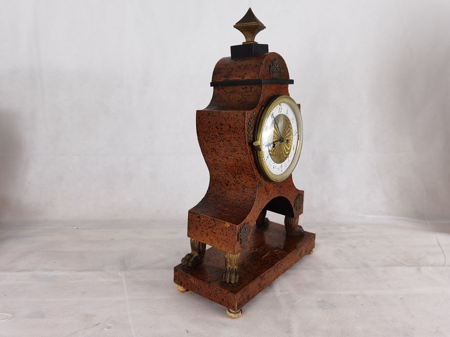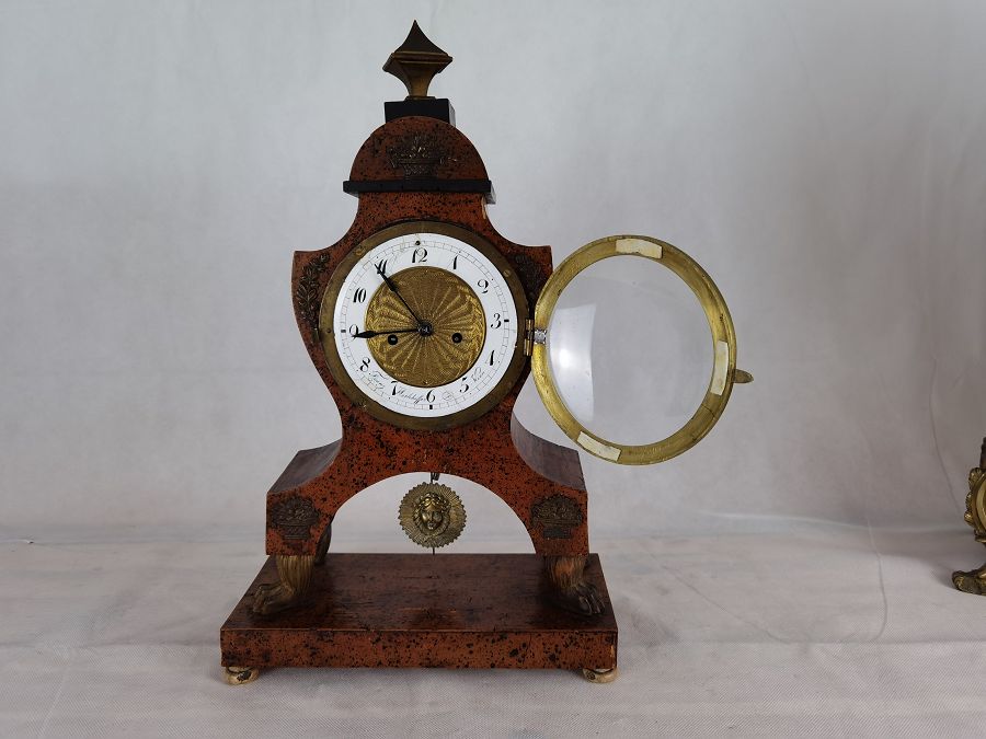 Für XXL Bild hier klicken1 Uhren Spezifikationen Art der Uhr Pendüle Kamin- Uhr Tisch- Uhr Alter und Herkunft um1820 / und die Herkunft ist Österreich Wien Gehäuse Material Messing Bronze Holz Masse Uhr Höhe ca. cm, Breite ca. cm, Tiefe ca. cm Masse Beisteller Höhe ca. 43 cm, Breite ca. 26 cm, Tiefe ca. 12 cm Material Uhrwerk Messing Eisen Pendel- Aufhängung Fadenaufhängung Hemmung und Gewichte Ankerhemmung Schlagwerk 1/1 1/2 Schlag auf Tonfeder Zustand Gehäuse Guter Zustand mit Gebrauchsspuren, teilweise ergänzt (Füß hinten links ergänzt), beschädigt, mit Fehlstellen, Schwundrissen, alt restauriert siehe Bilder. Bilder sind Bestandteil der Auktion. Zustand Uhrwerk Guter Zustand mit Gebrauchsspuren. Uhrwerk läuft, jedoch ohne Garantie. Bilder sind Bestandteil der Auktion. |