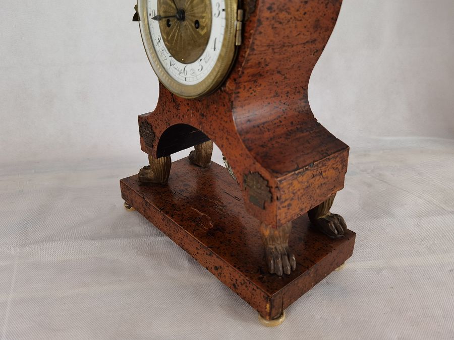 Beschreibung/description: Antike Uhr Wien Biedermeier signiert um 1820. Das Ziffernblatt ist signiert mit „Franz Hochhoffer in Wien“. Geschnitzte Elemente wie die Löwen Füßchen und Messing Sonnen Pendel, Zifferblatt und Blumenkörbchen auf dem Gehäuse. Das Uhrwerk hat Fadenaufhängung. ArtikelNummer /number: uh111
