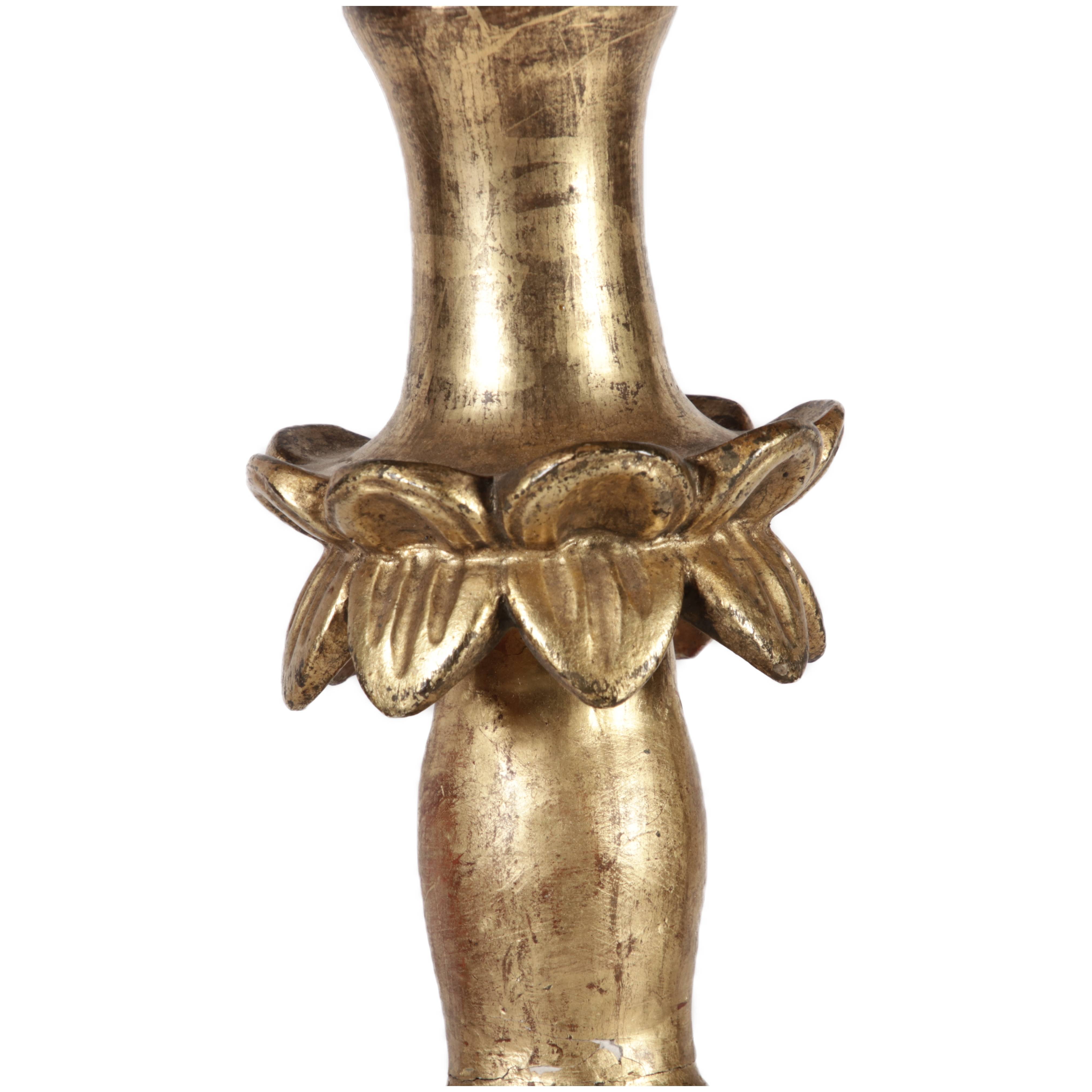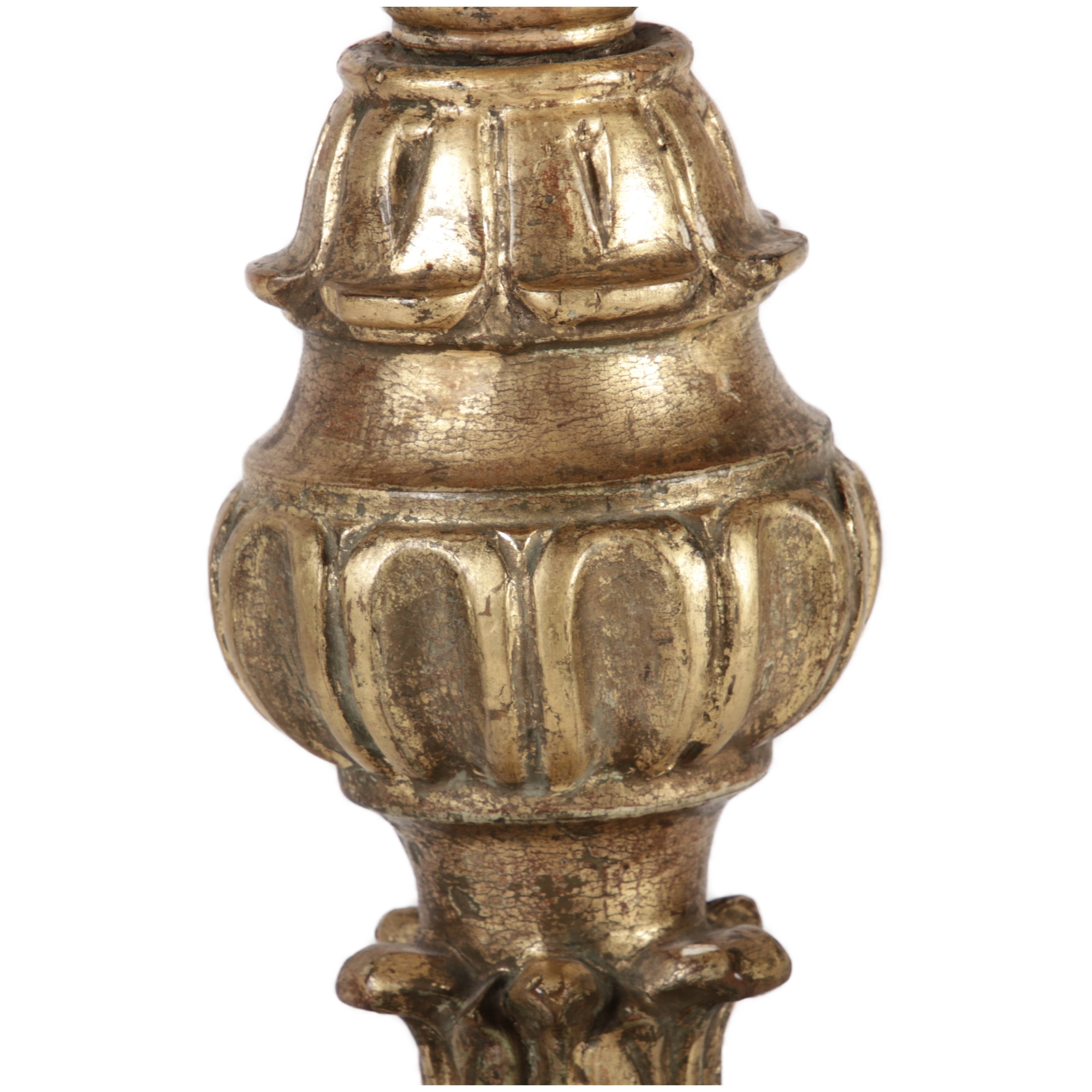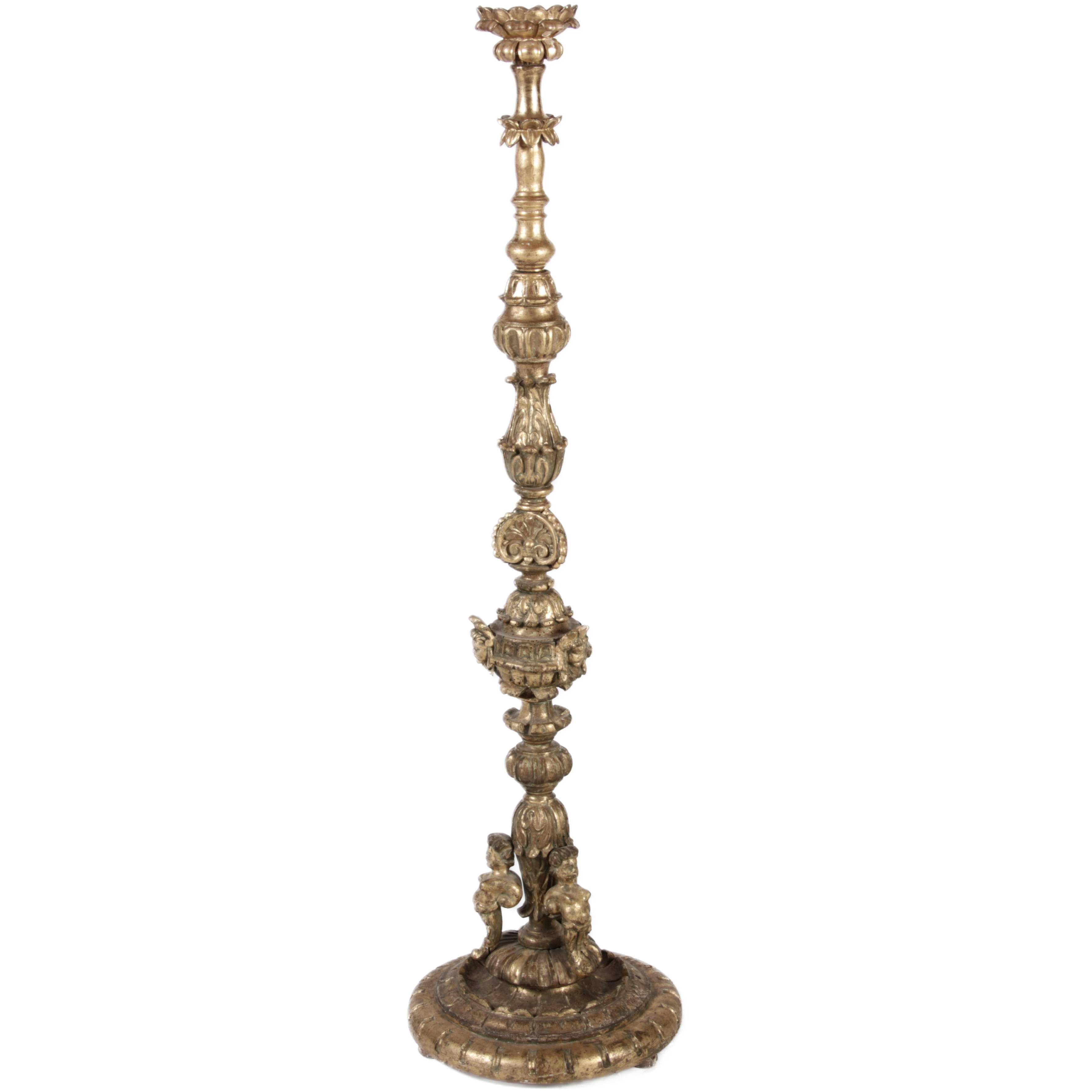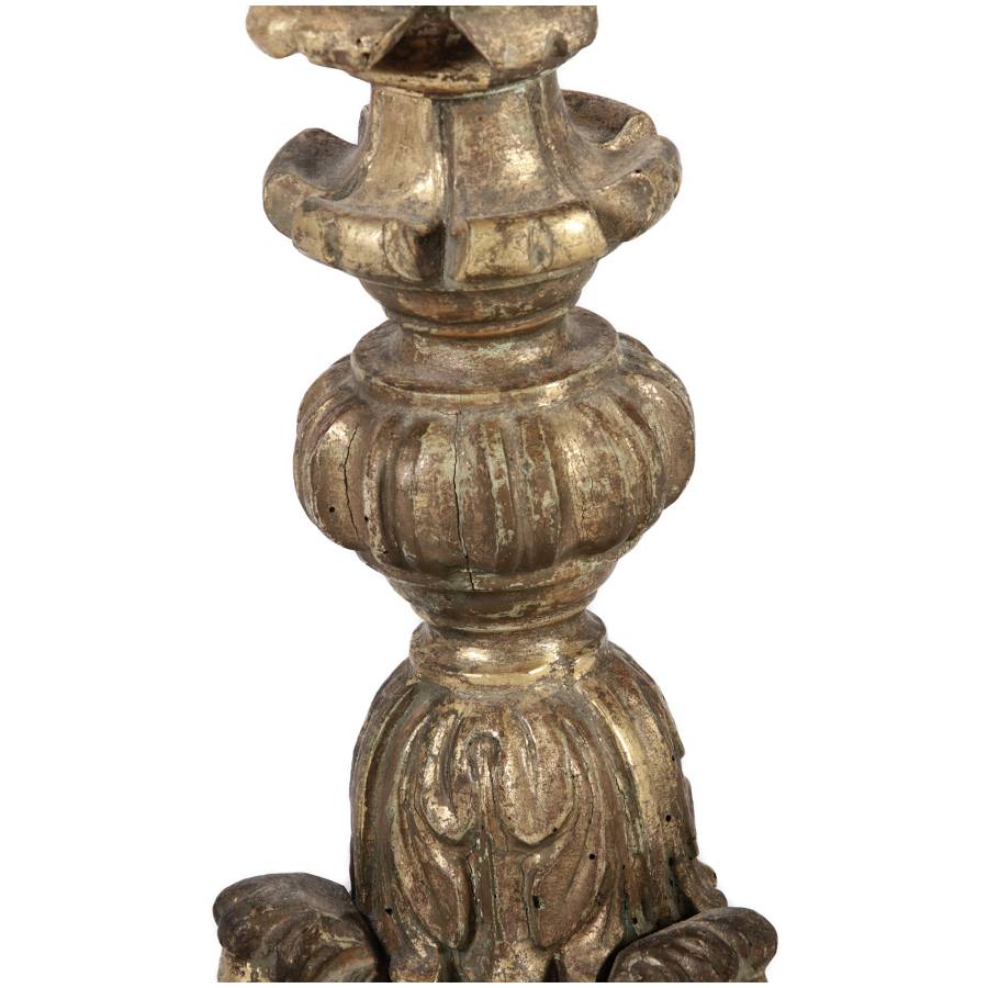 | Antiker 150 cm hoher Bodenleuchter Holz goldgefasst 18 Jh |